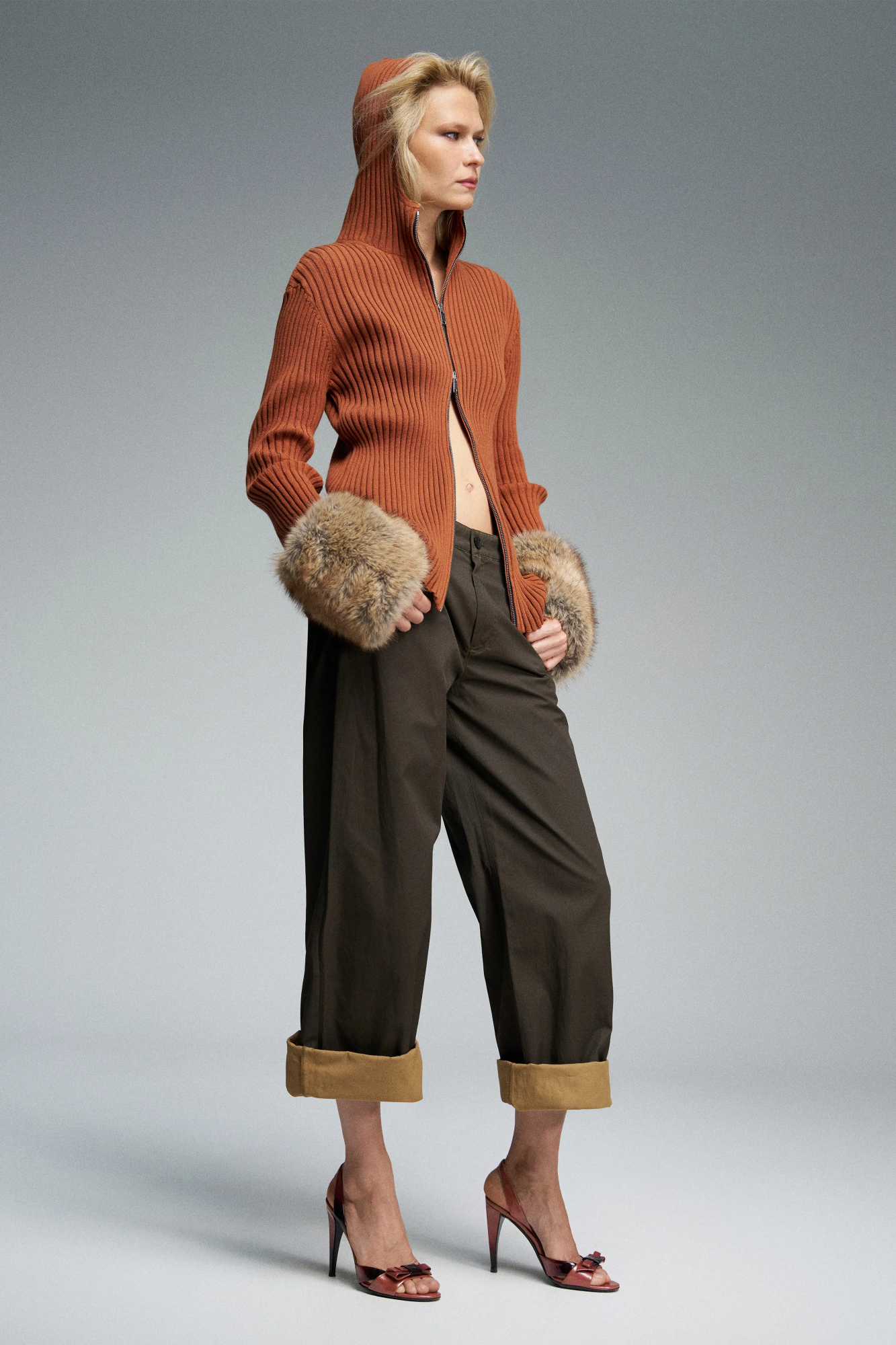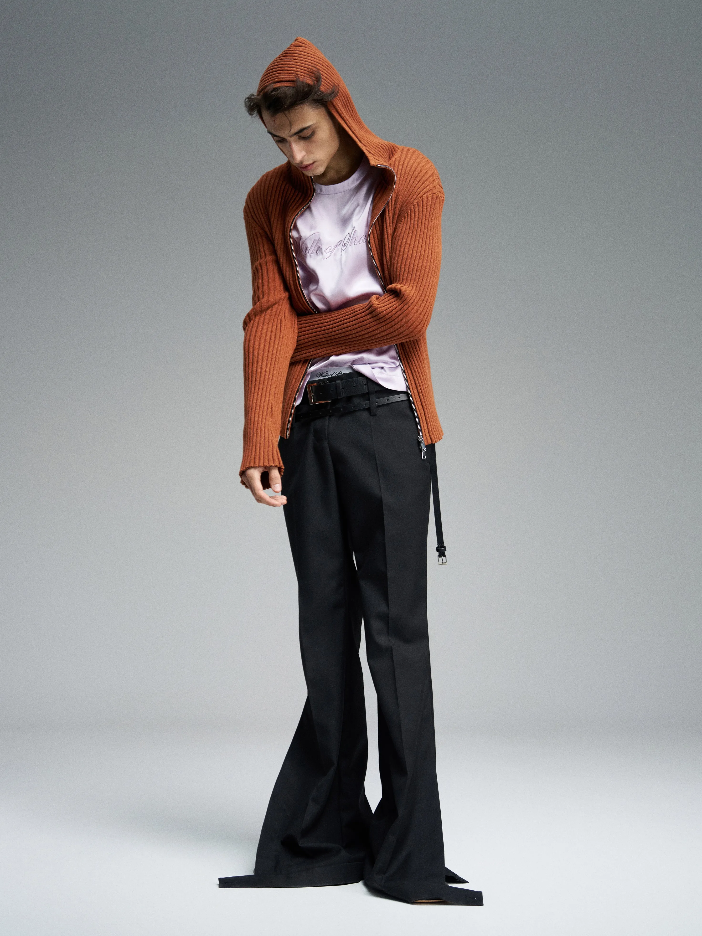 Трикотажный кардиган прилегающего силуэта с капюшоном. Двусторонняя молния позволяет регулировать застёжку сверху и снизу, обеспечивая комфорт и вариативность посадки. Молнии брендированные, декоративную деталь завершает репсовая лента с логотипом бренда.