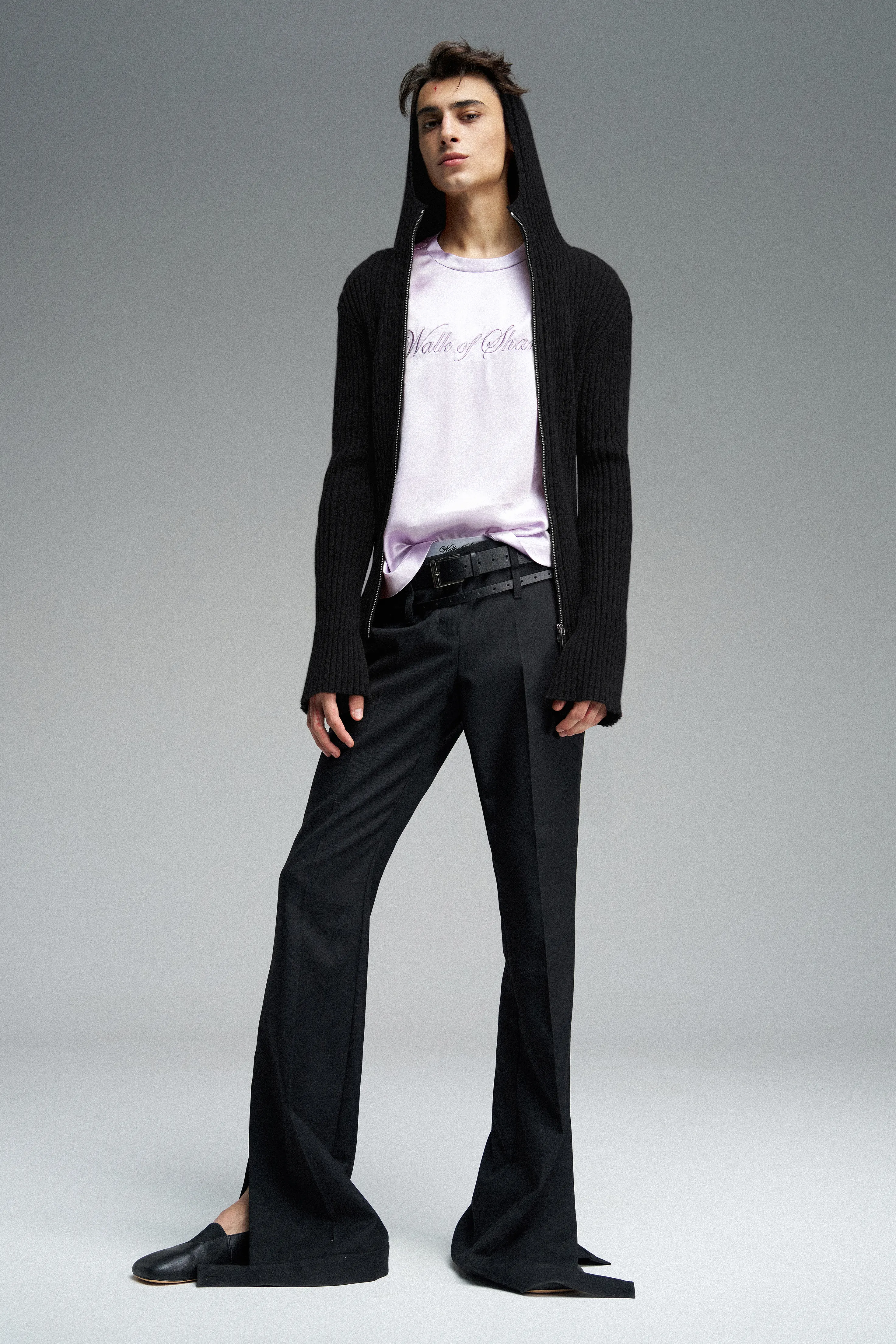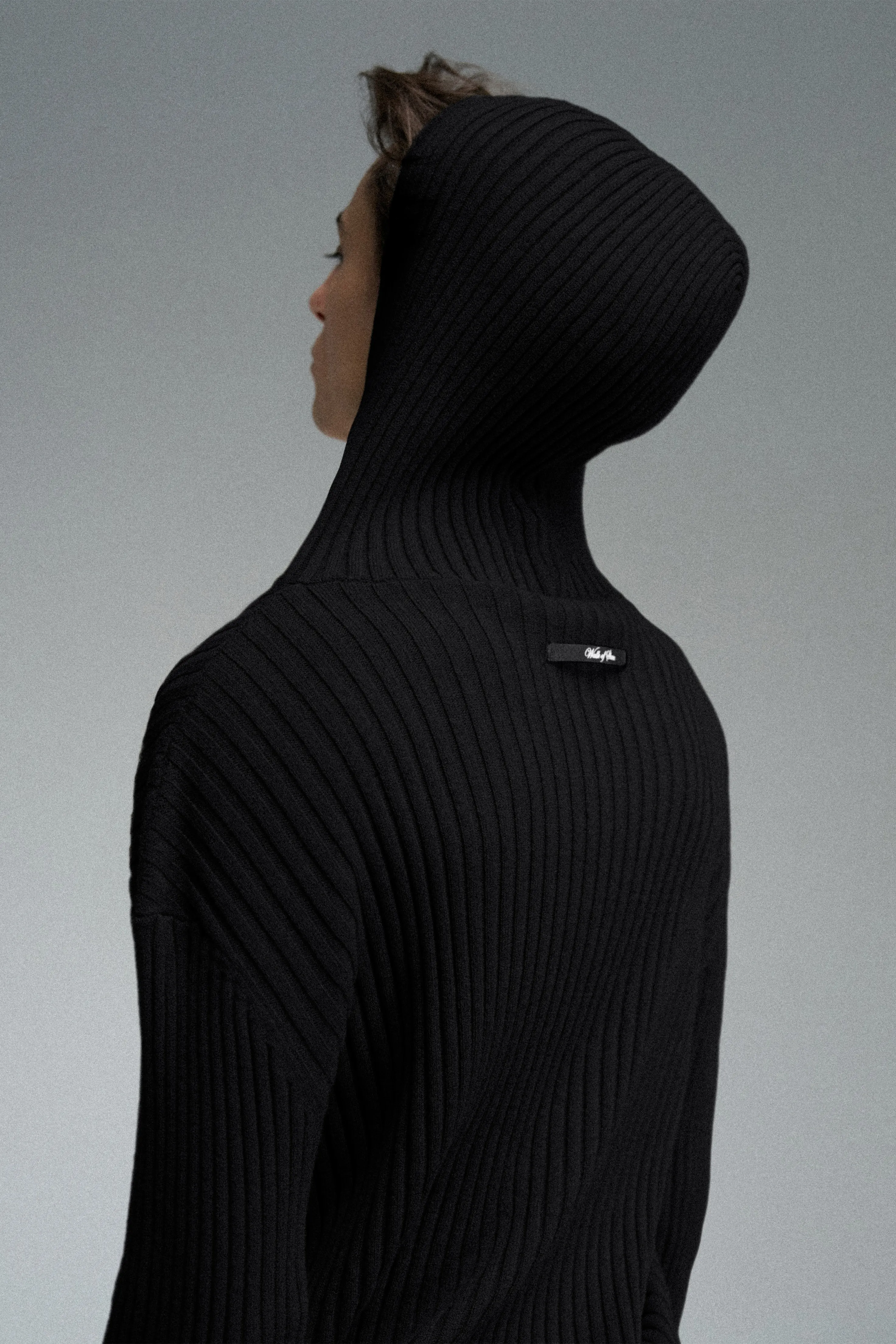 Трикотажный кардиган прилегающего силуэта с капюшоном. Двусторонняя молния позволяет регулировать застёжку сверху и снизу, обеспечивая комфорт и вариативность посадки. Молнии брендированные, декоративную деталь завершает репсовая лента с логотипом бренда.