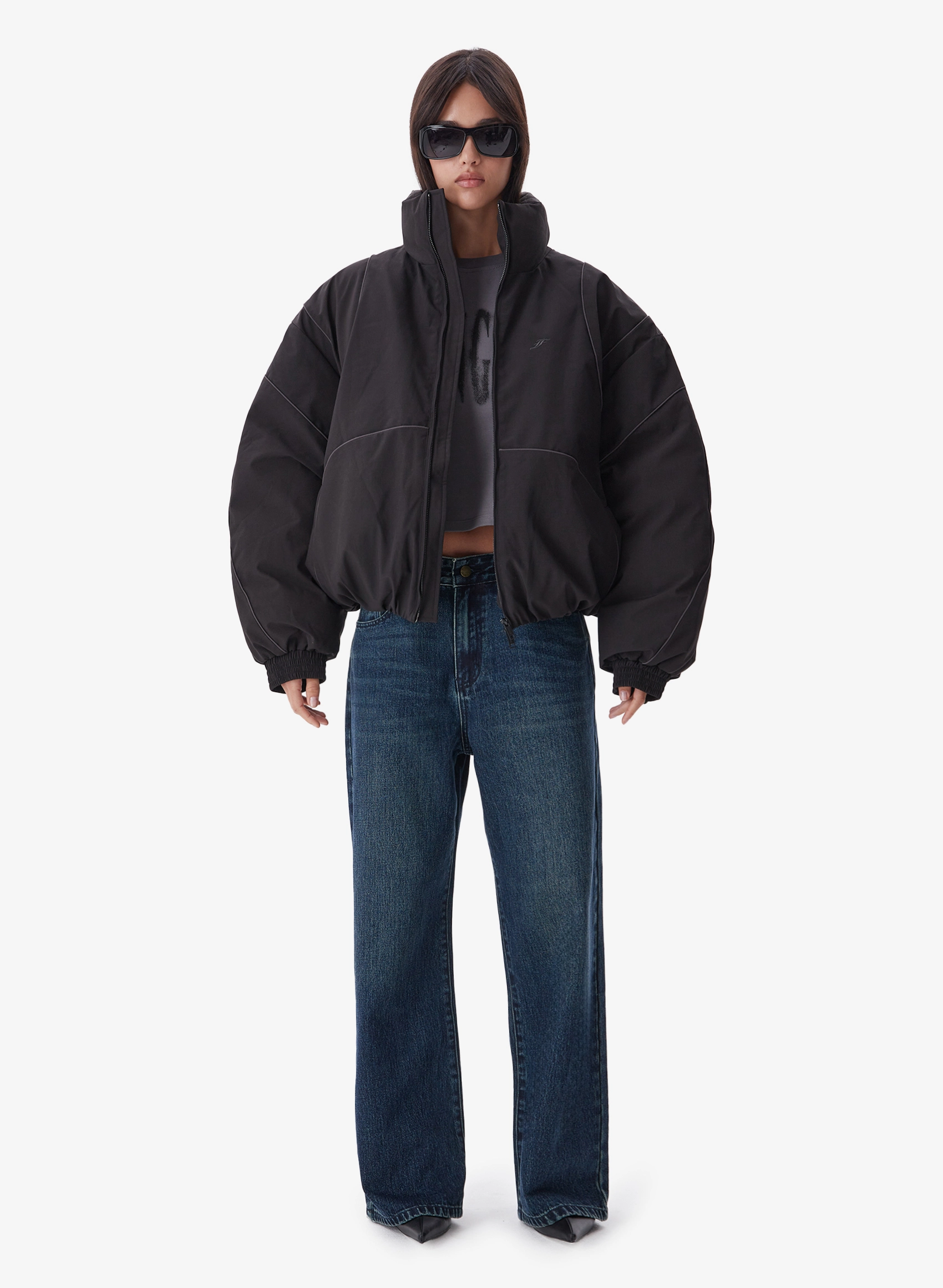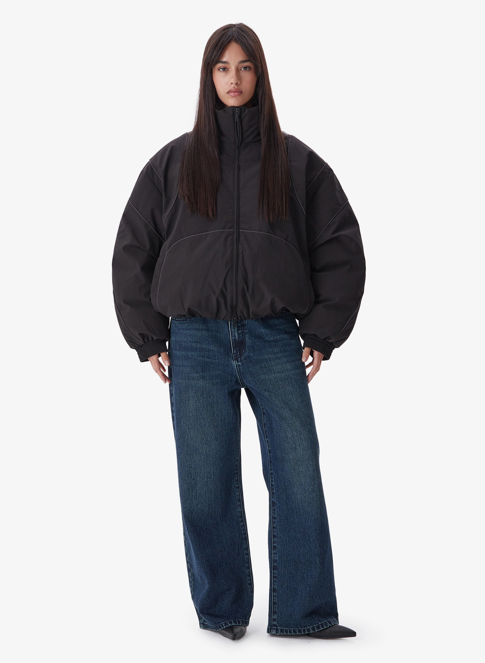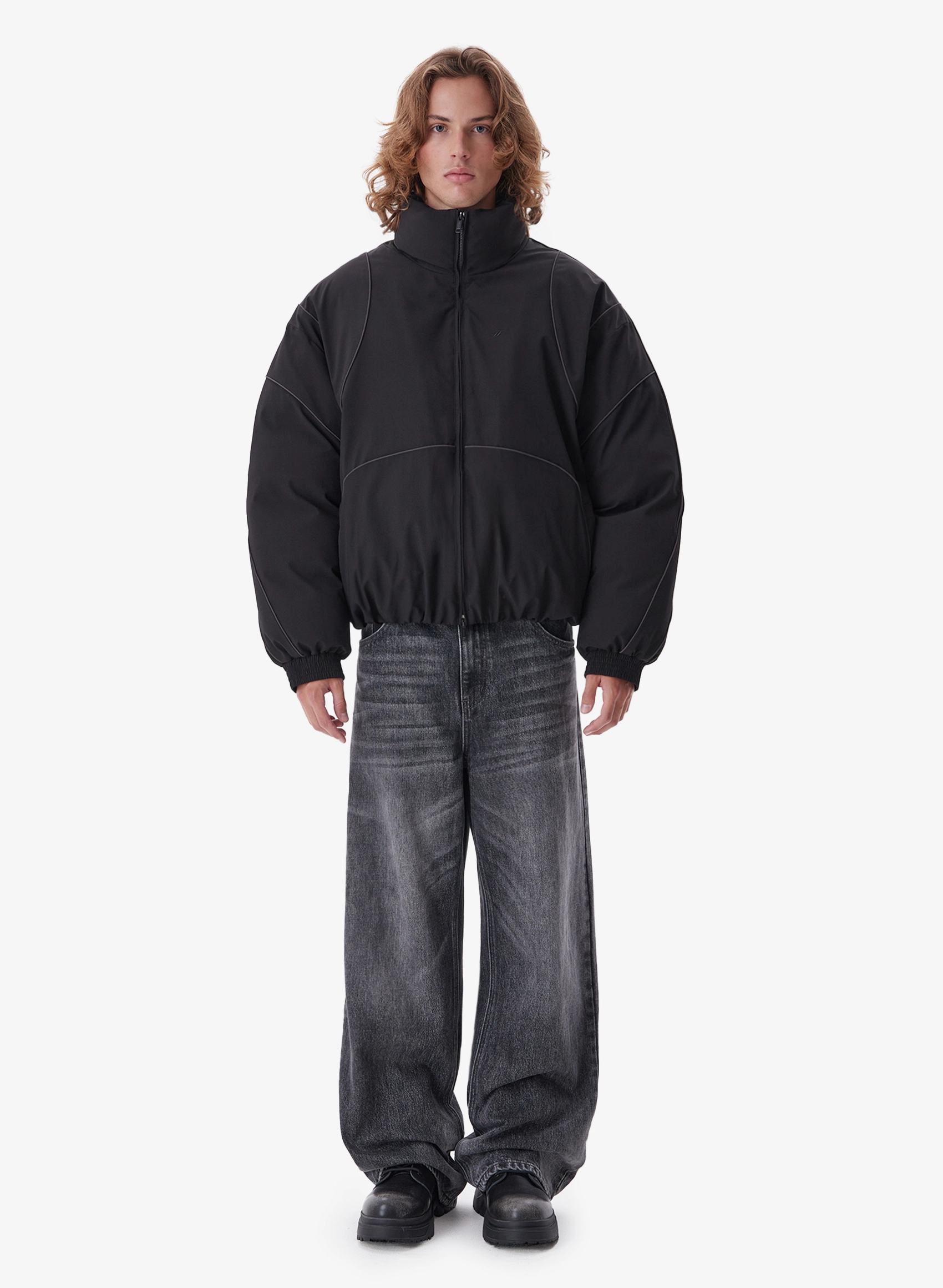 Утепленная куртка свободного кроя с накладными карманами и высоким воротником.