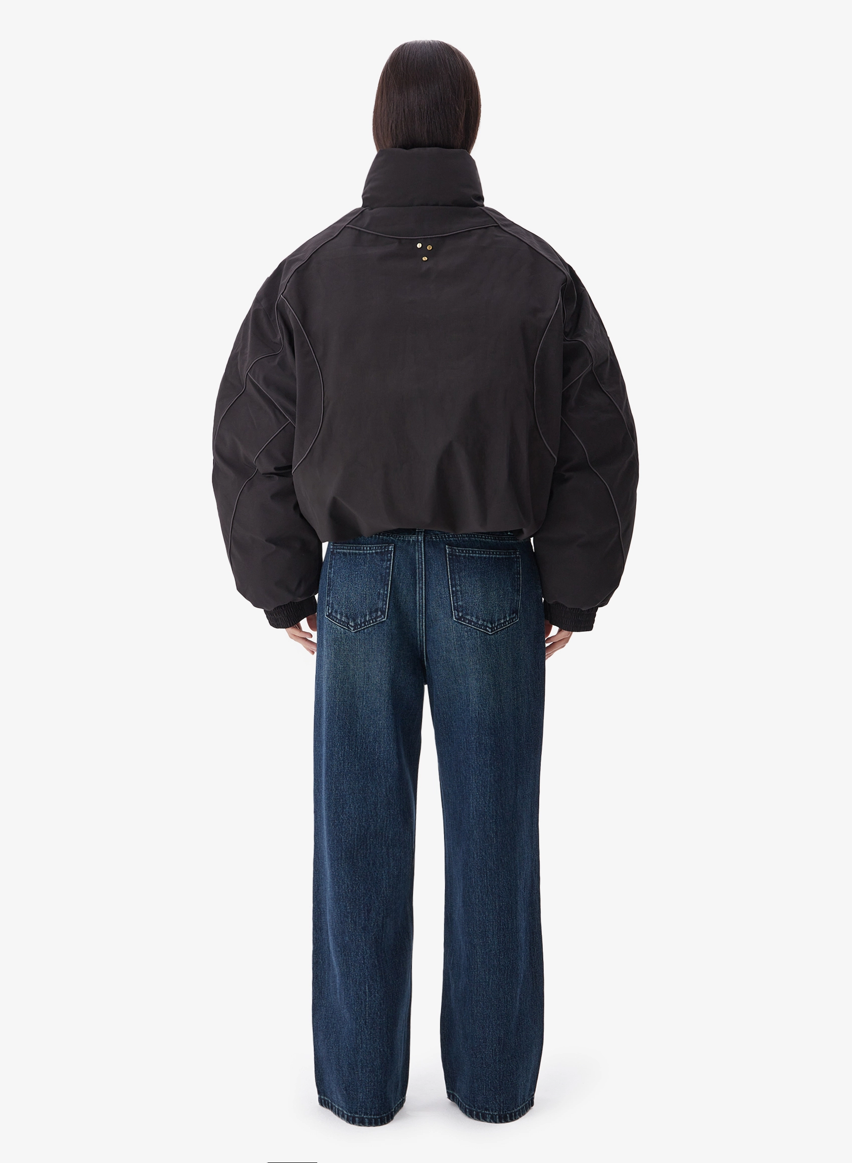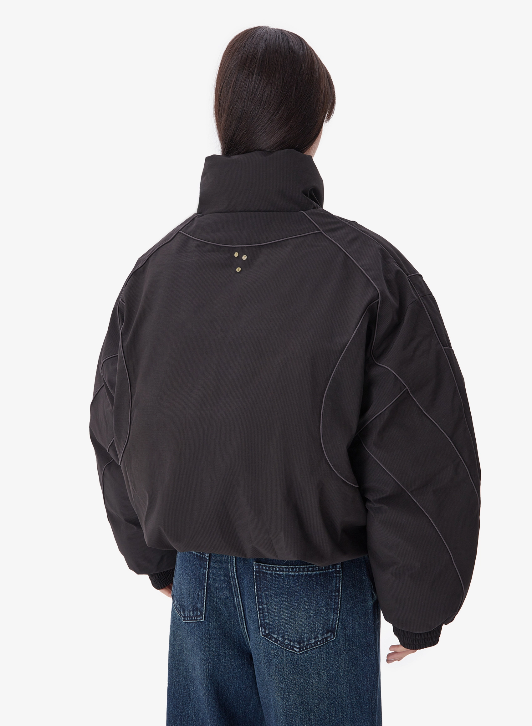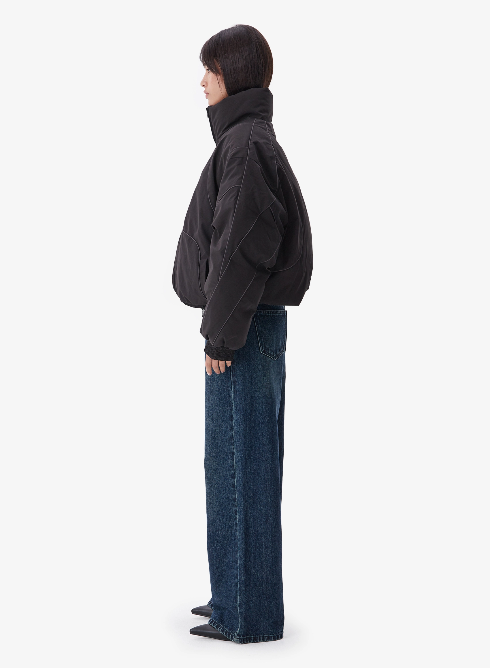 Утепленная куртка свободного кроя с накладными карманами и высоким воротником.
