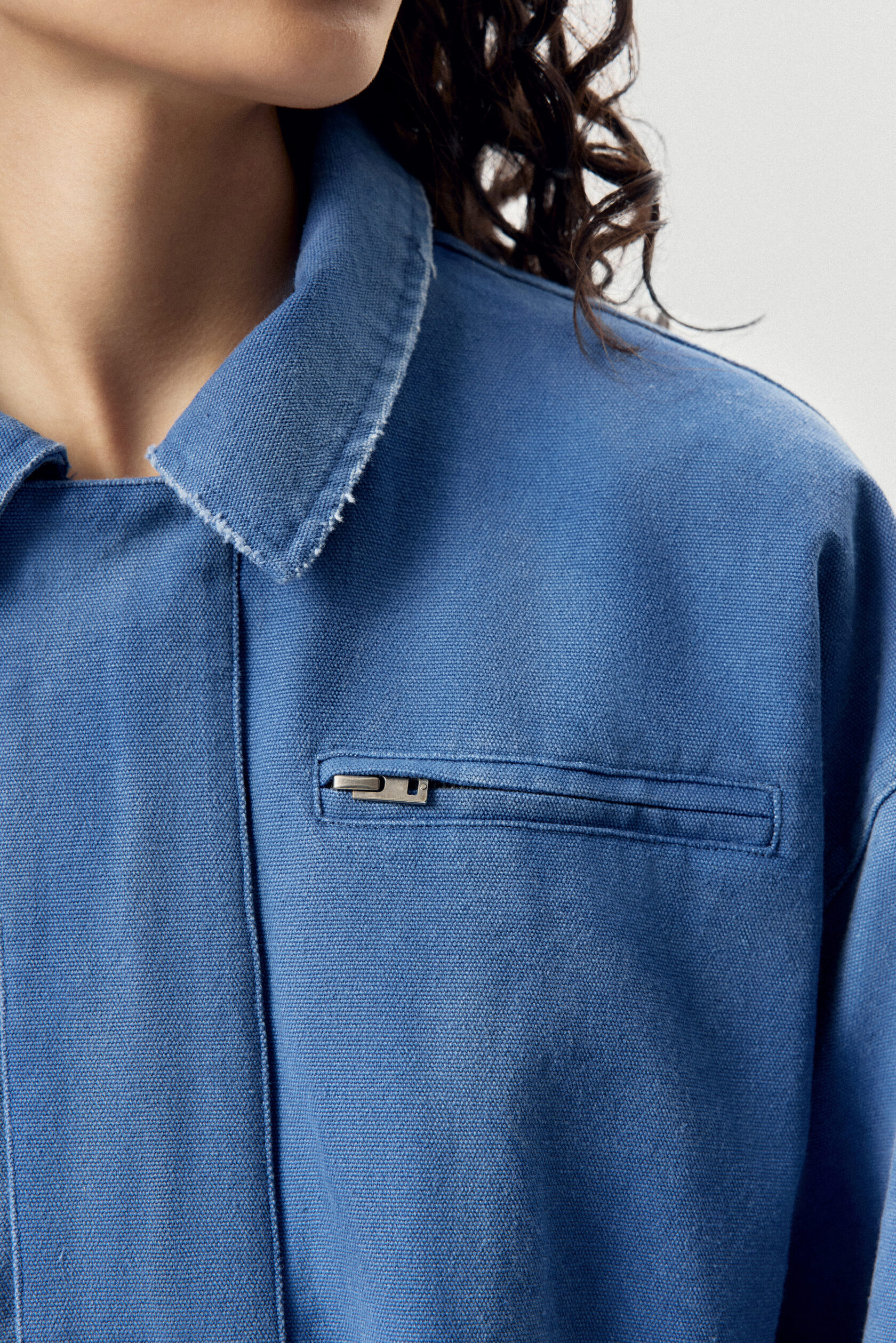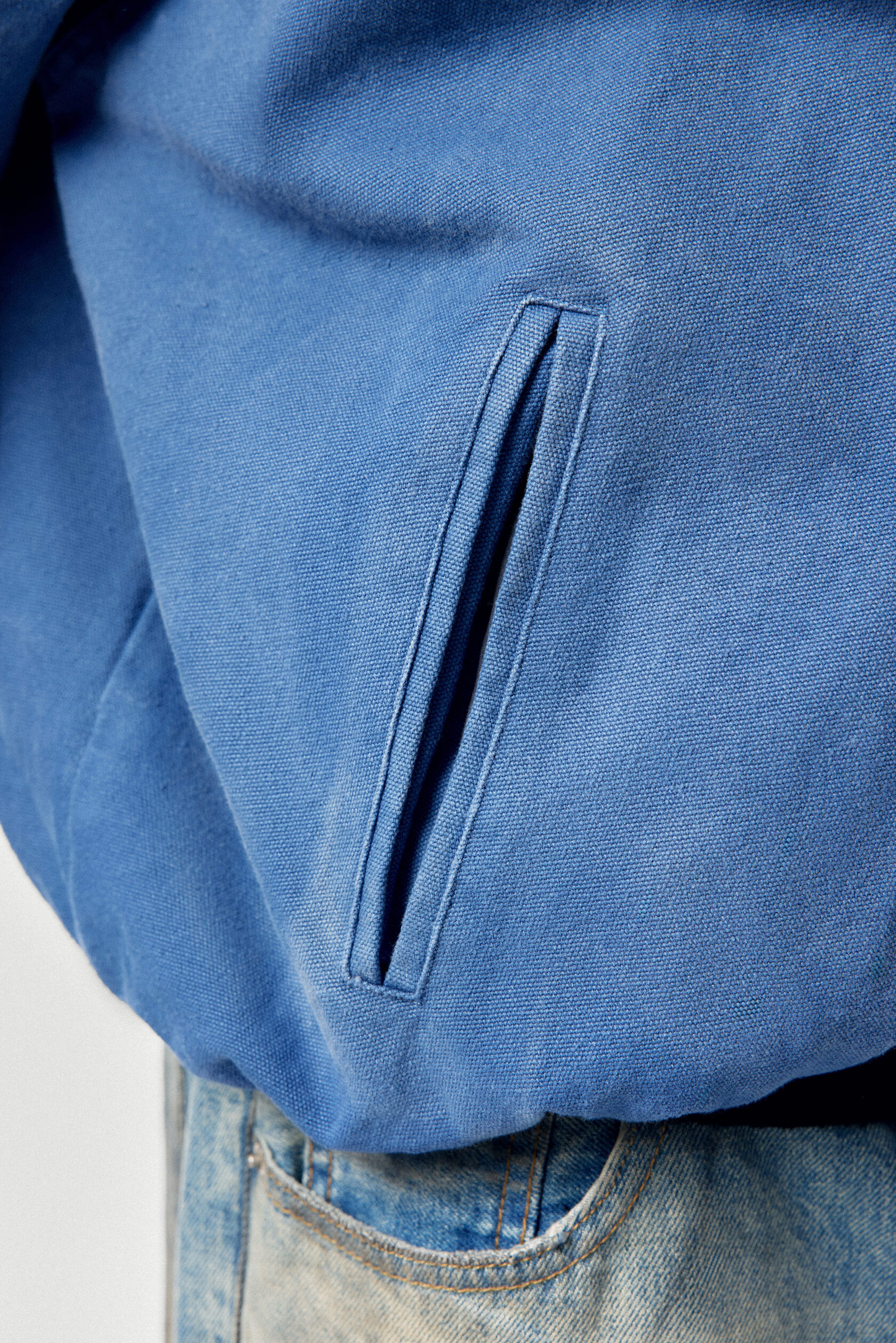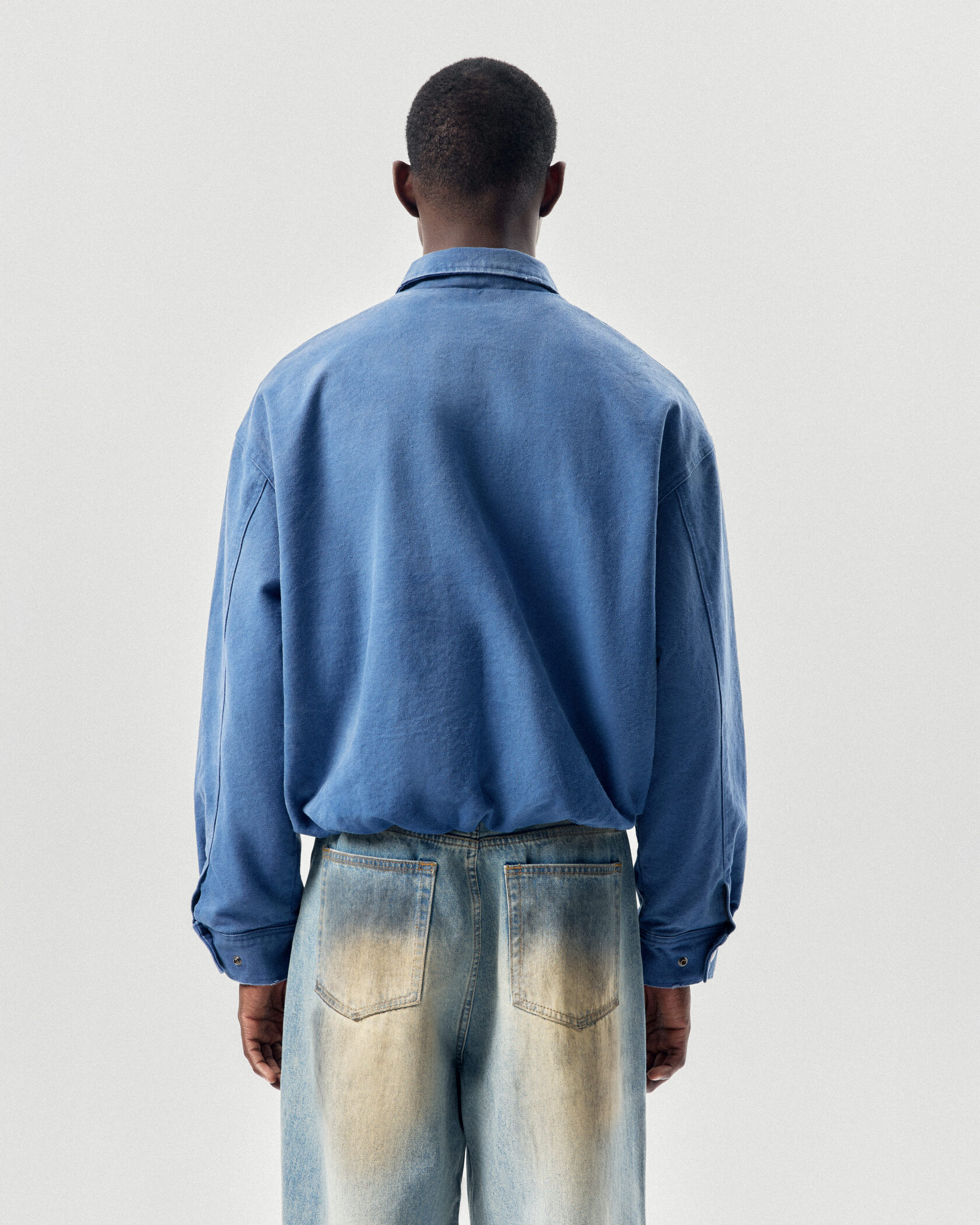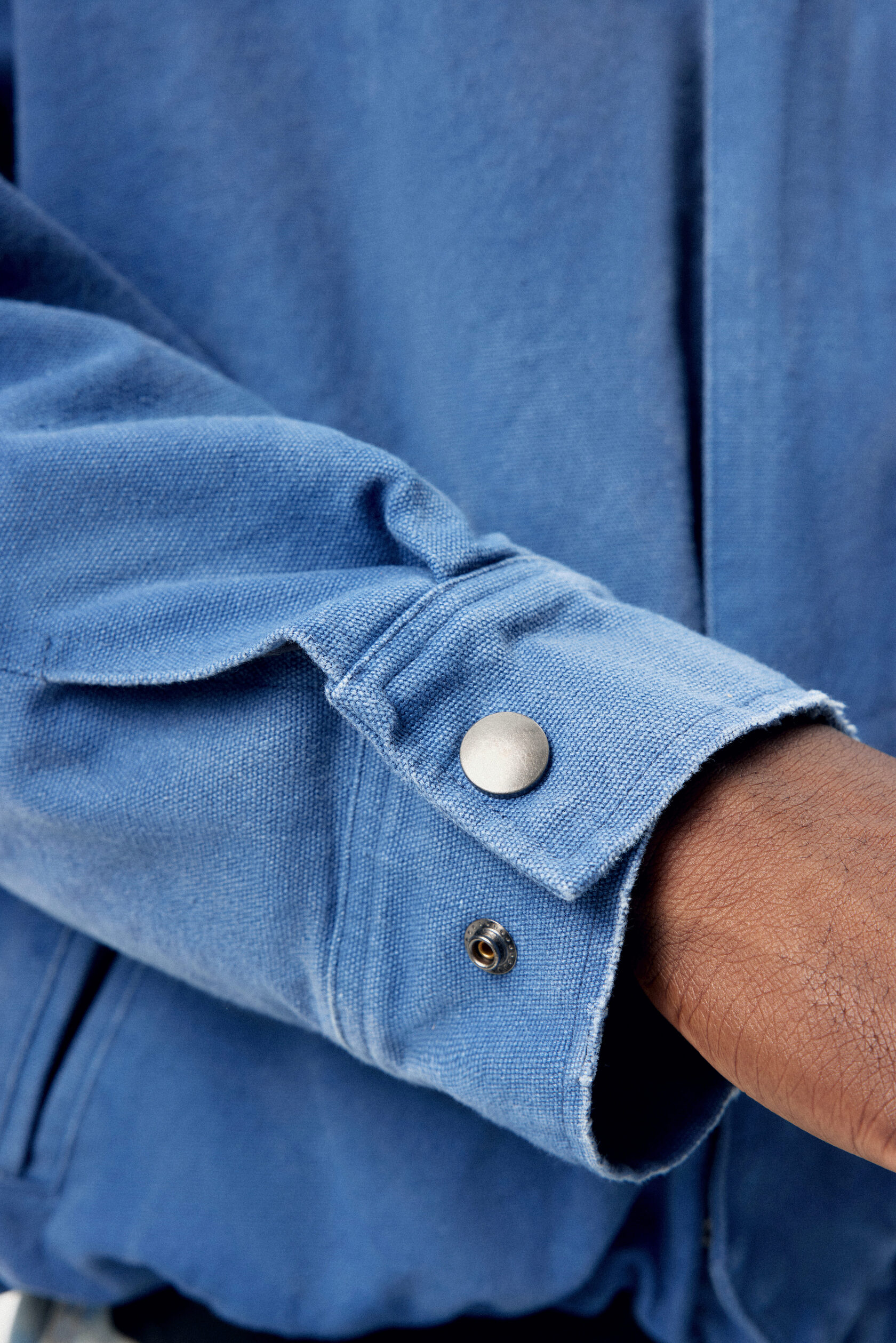 Модель выполнена из 100% хлопкового денима с естественным эффектом выцветания. Подкладка, включающая премиальный хлопок Пима - особо мягкий и износостойкий сорт хлопка, обеспечивает повышенный комфорт. Умеренно объёмный крой, отложной воротник и двухзамковая молния с ветрозащитным клапаном на кнопках создают функциональный дизайн. Детали включают прорезные карманы по бокам, на левой груди и внутренние двойные карманы. Куртка рассчитана на температурный режим до +10 °C и сочетается с худи, футболками, джинсами и спортивными брюками, завершая многослойный образ для прохладной погоды.