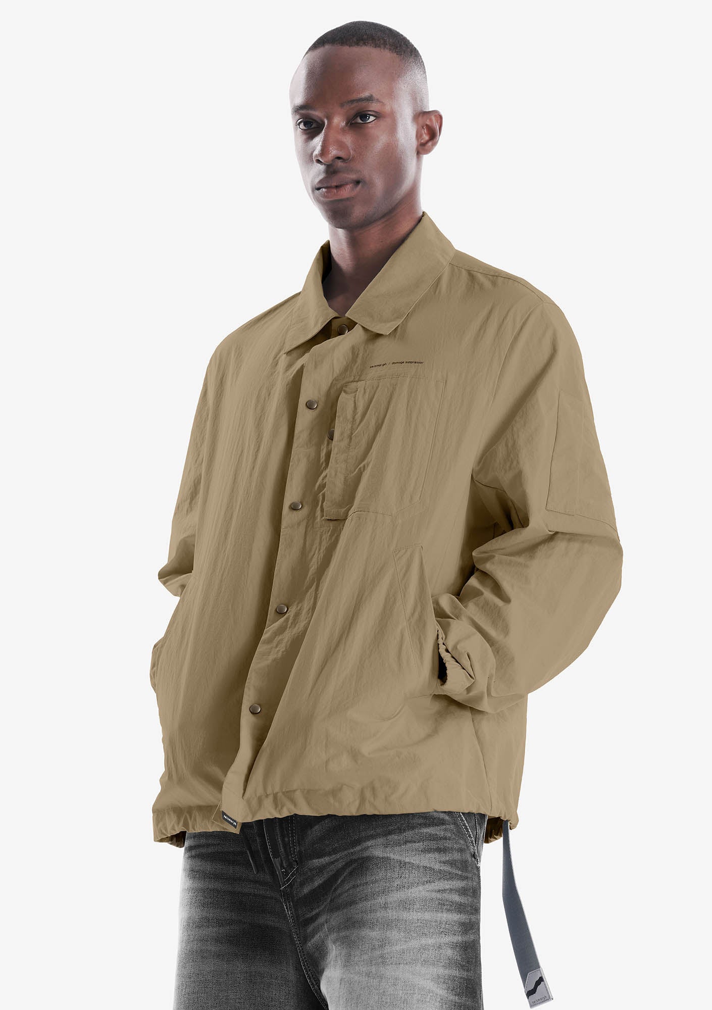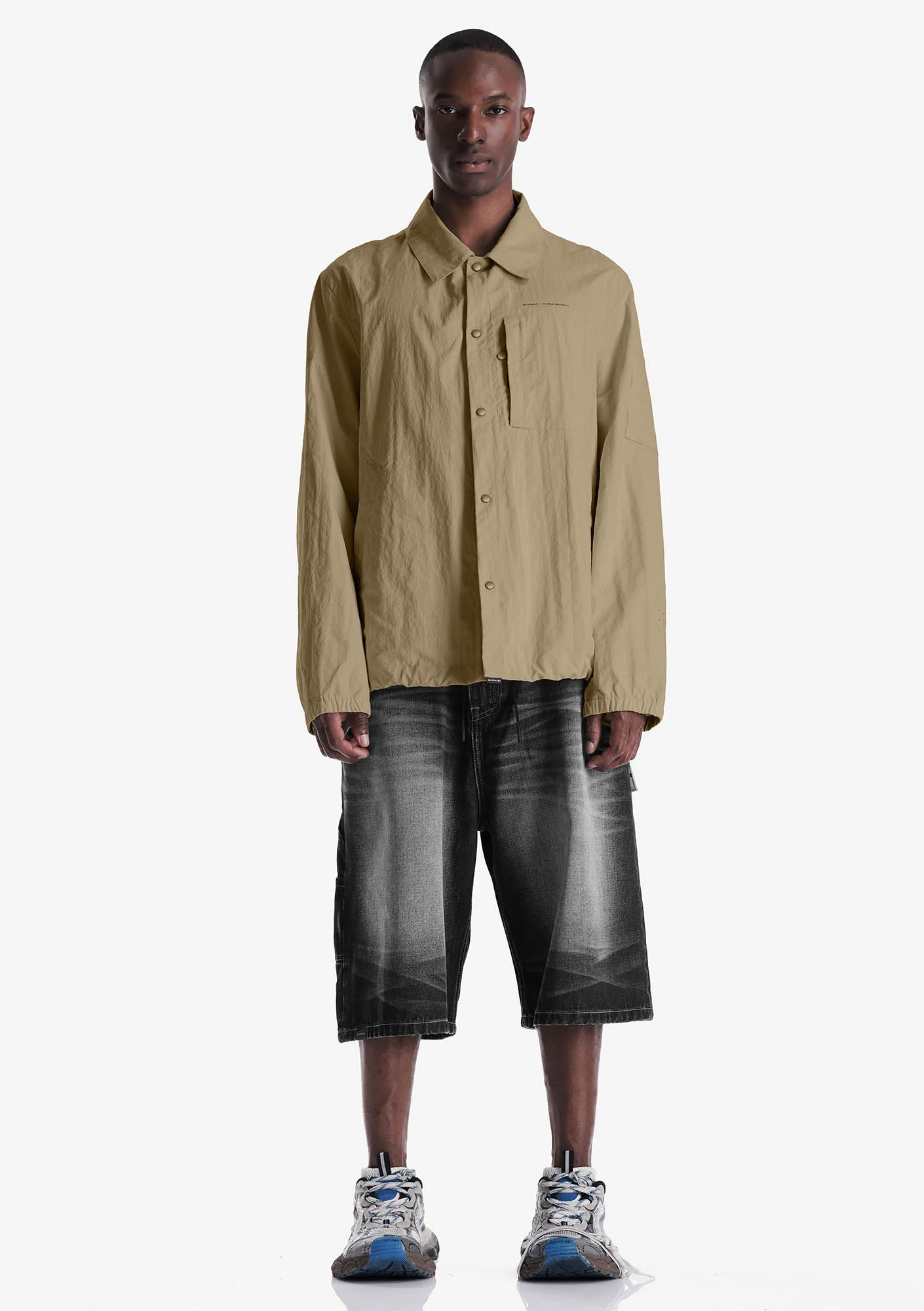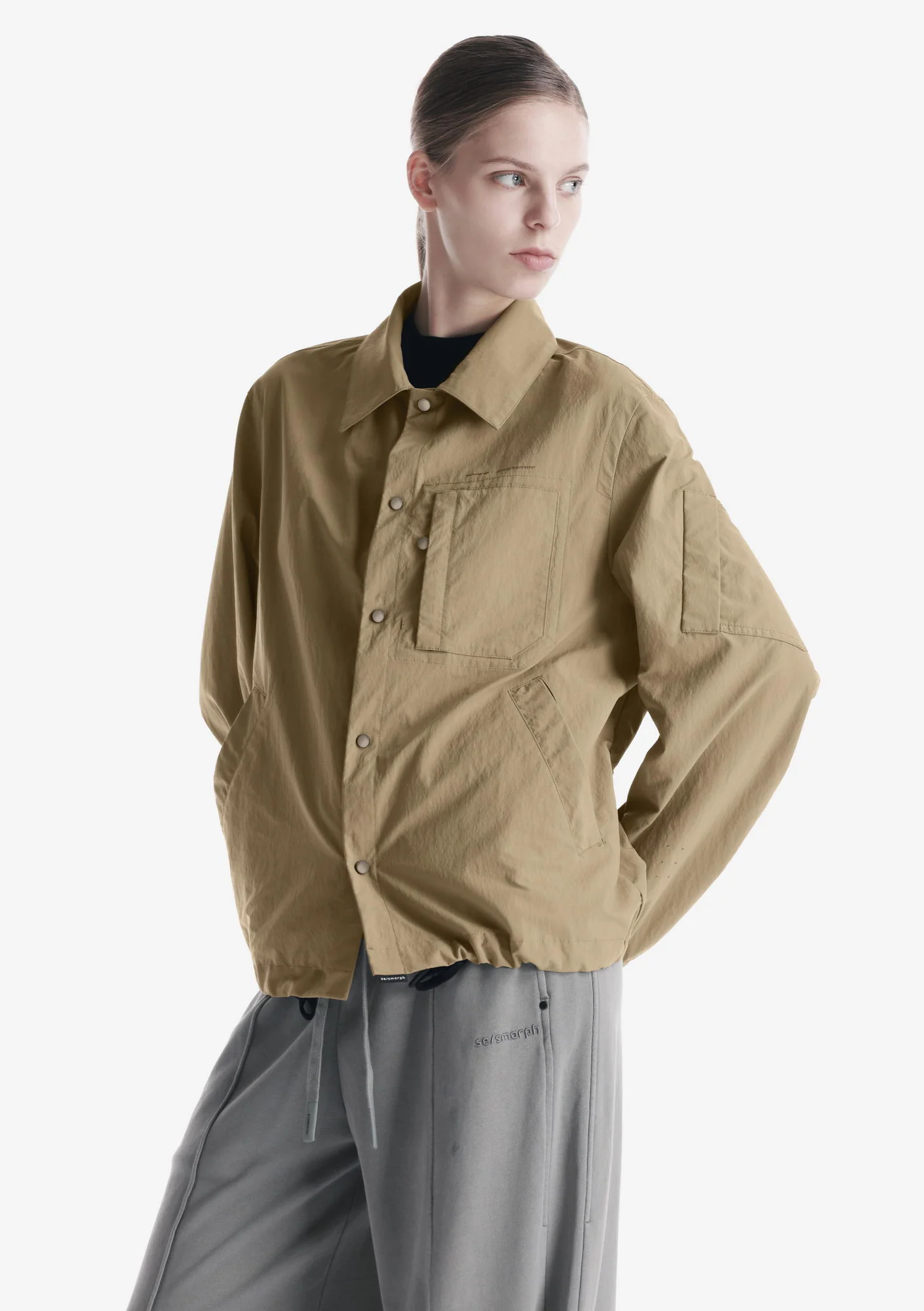 Лёгкая куртка-рубашка из плотного износостойкого нейлона с чистым, собранным силуэтом и продуманной функциональностью. Лаконичная застёжка на кнопках, аккуратные карманы и регулируемый низ формируют чёткую посадку и практичный характер модели, а неприхотливая в уходе ткань хорошо держит форму и внешний вид.