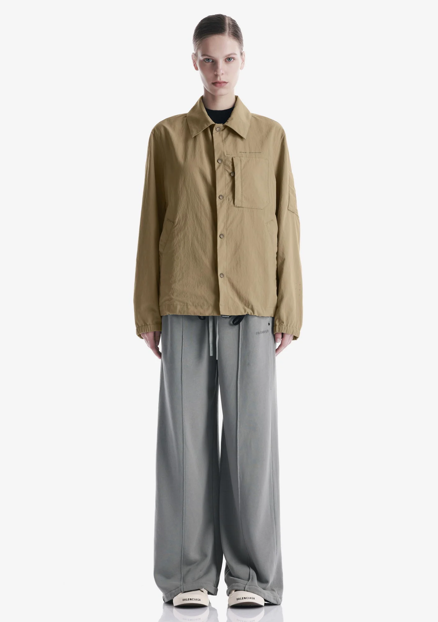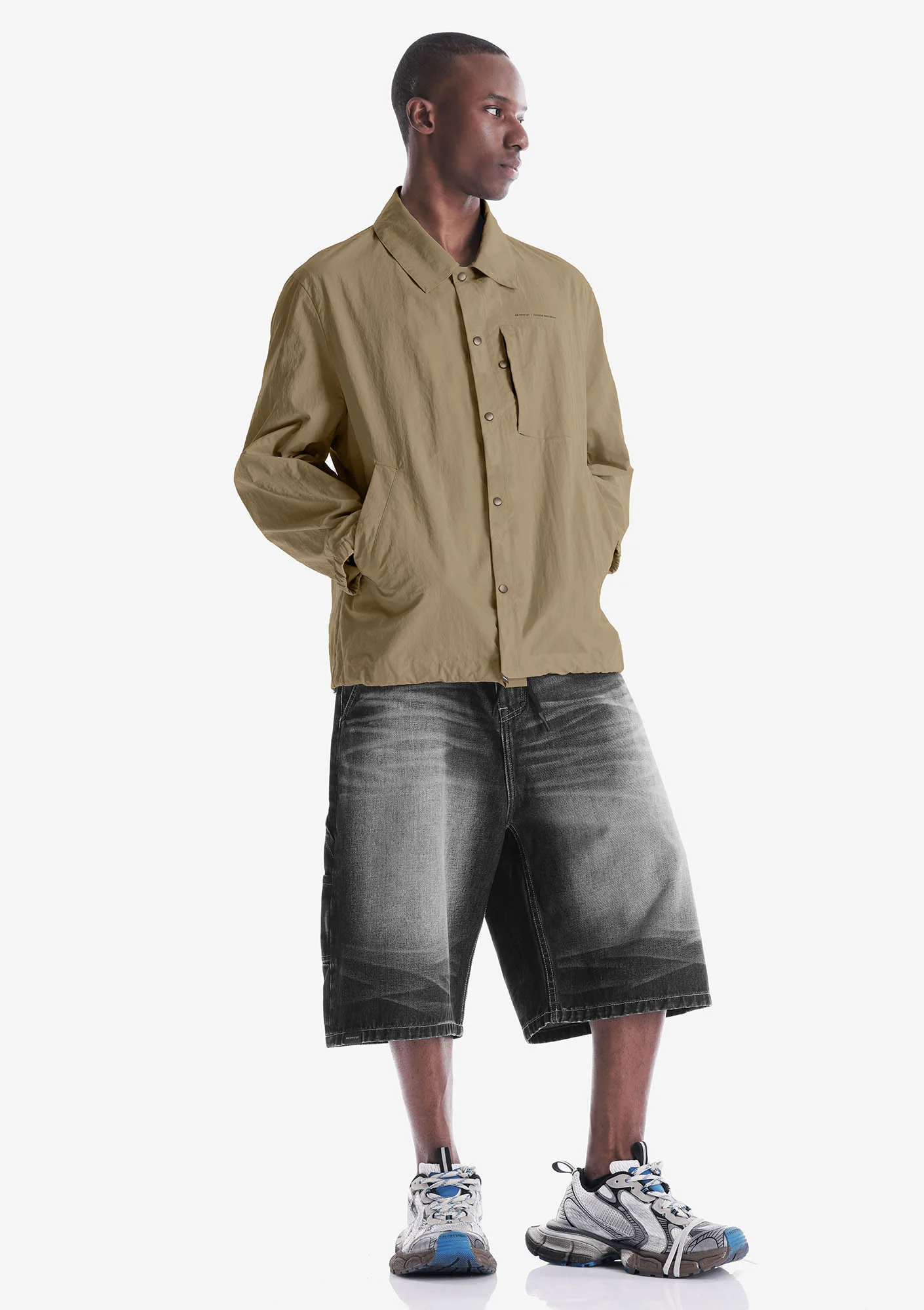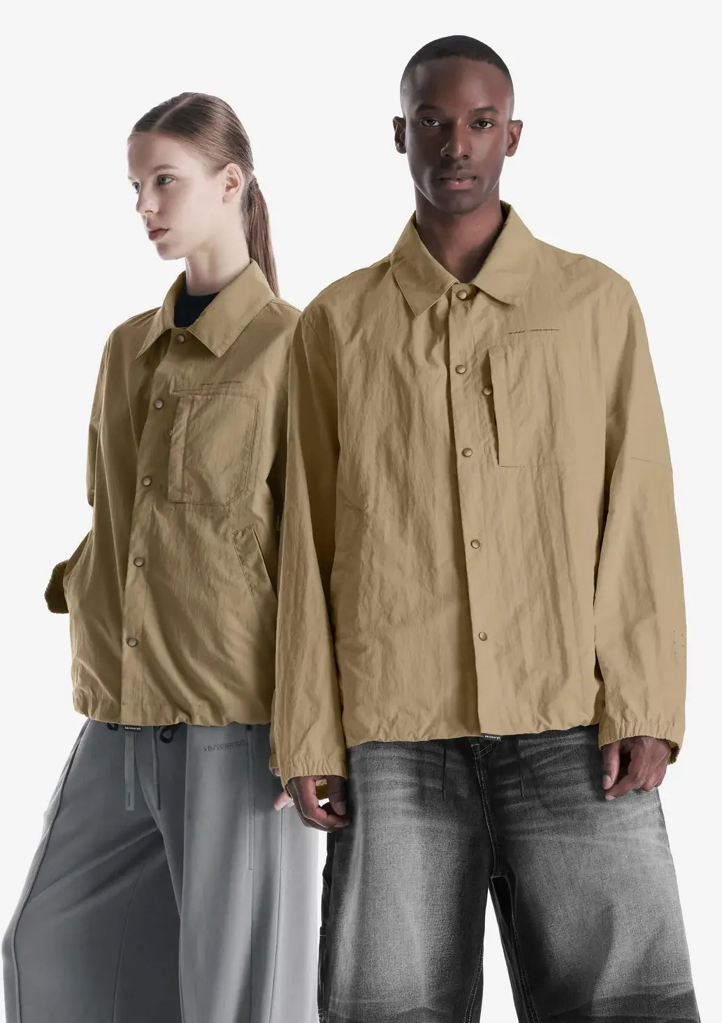 Лёгкая куртка-рубашка из плотного износостойкого нейлона с чистым, собранным силуэтом и продуманной функциональностью. Лаконичная застёжка на кнопках, аккуратные карманы и регулируемый низ формируют чёткую посадку и практичный характер модели, а неприхотливая в уходе ткань хорошо держит форму и внешний вид.