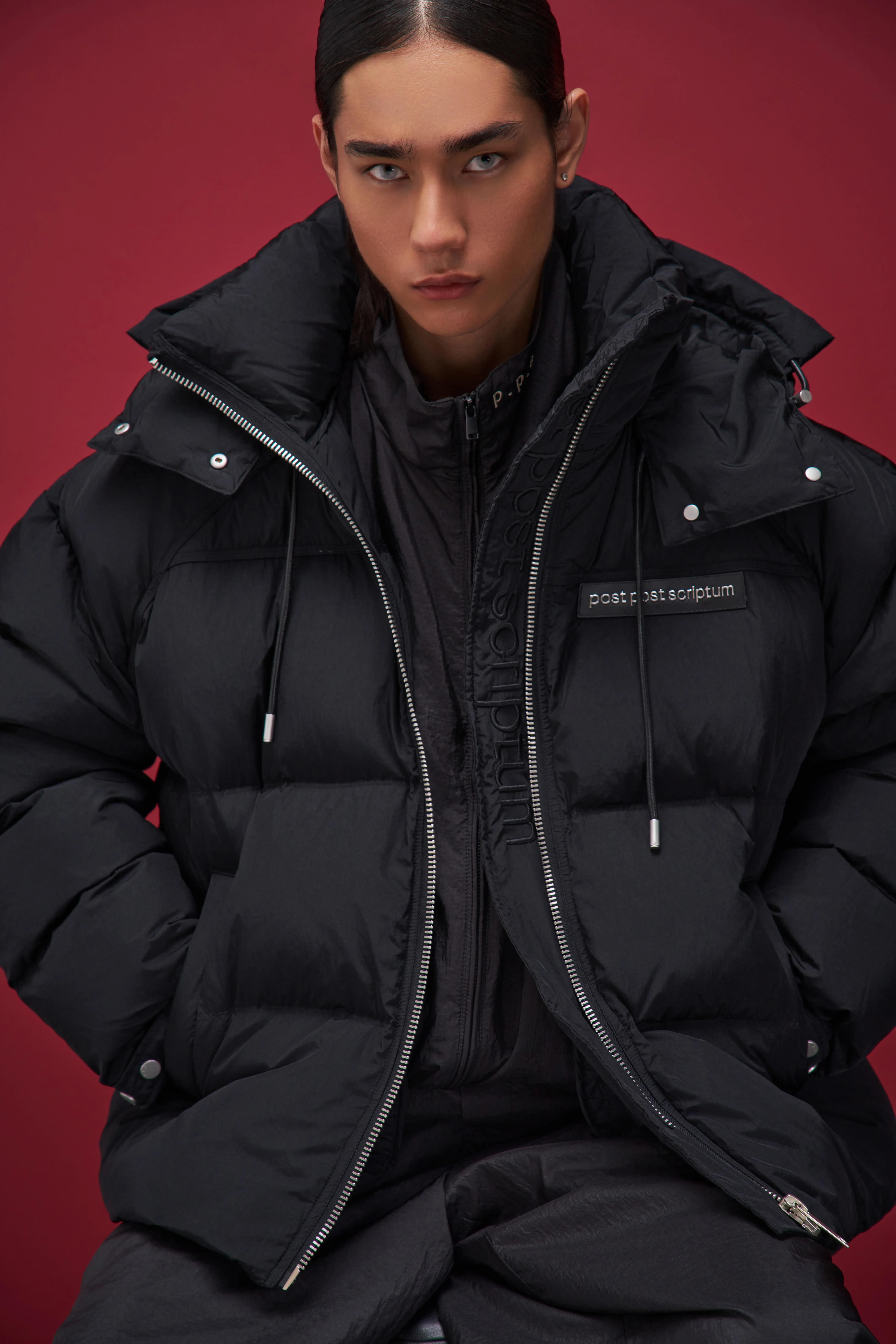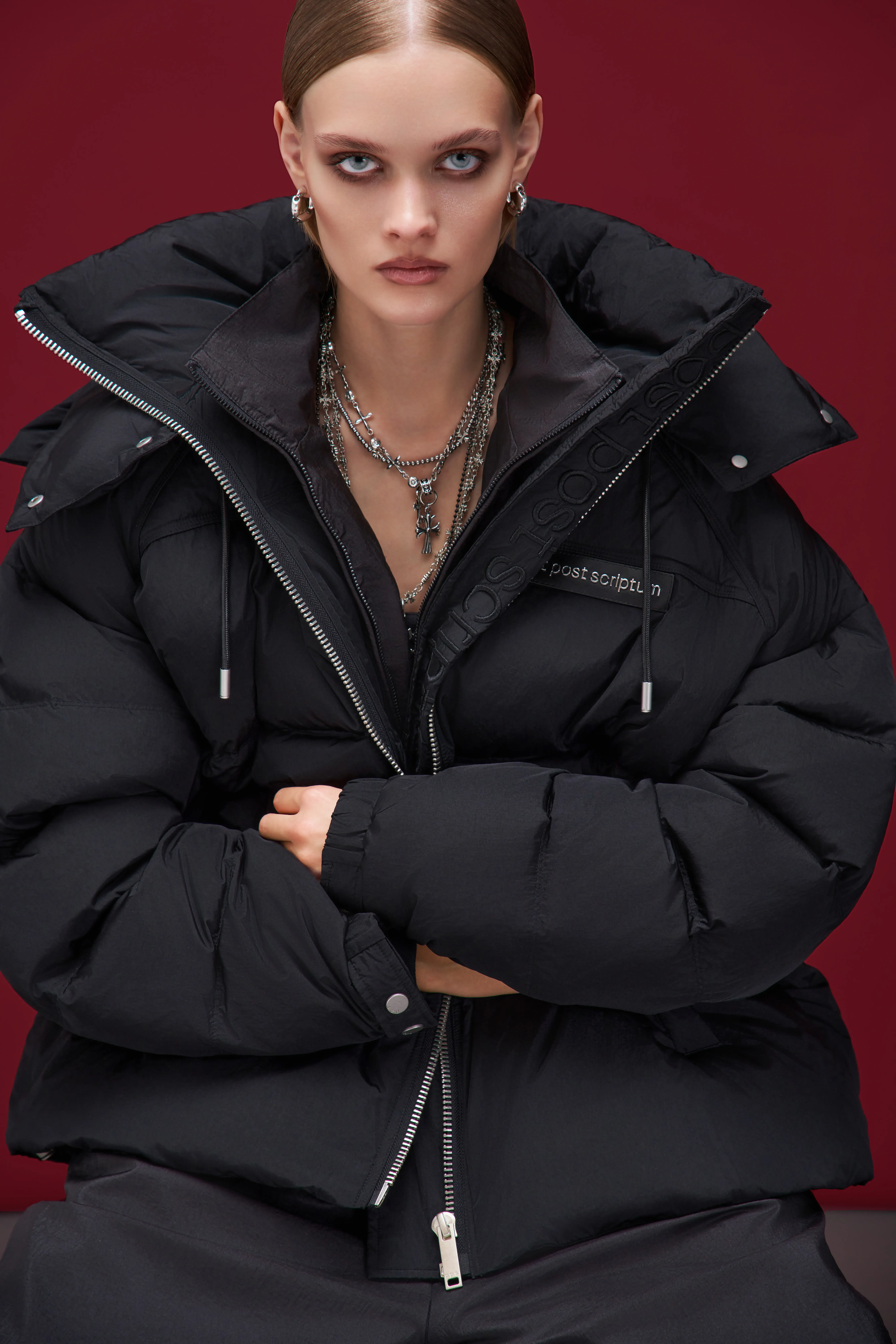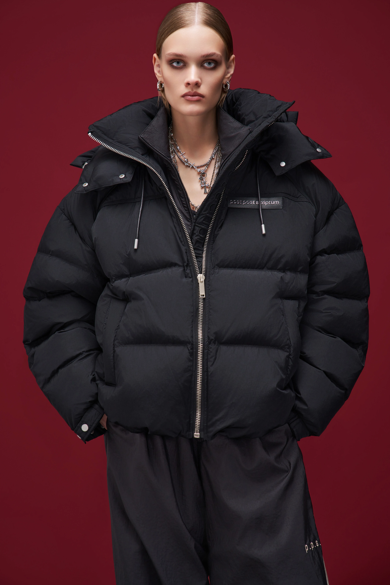 LOOM PUFF — архитектурный силуэт в оверсайз-пуховике. функциональные элементы — регулируемый капюшон, высокая стойка и система кулис — определяют скульптурный крой. узнаваемость бренда проявляется в деталях: металлические буквы post post scriptum и гравировка на фурнитуре. вещь, сочетающая утилитарность и эстетику для температуры до –25 °C.