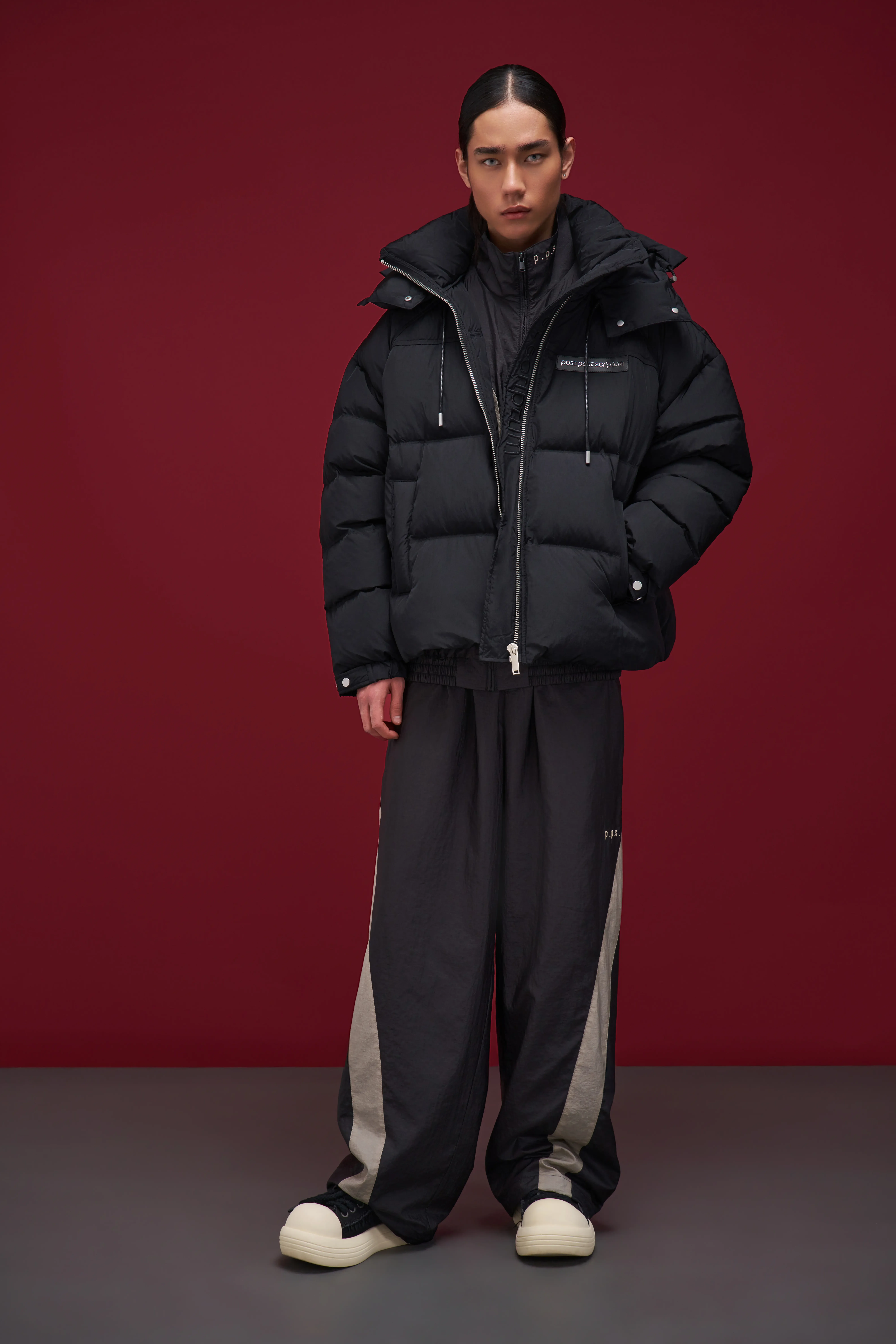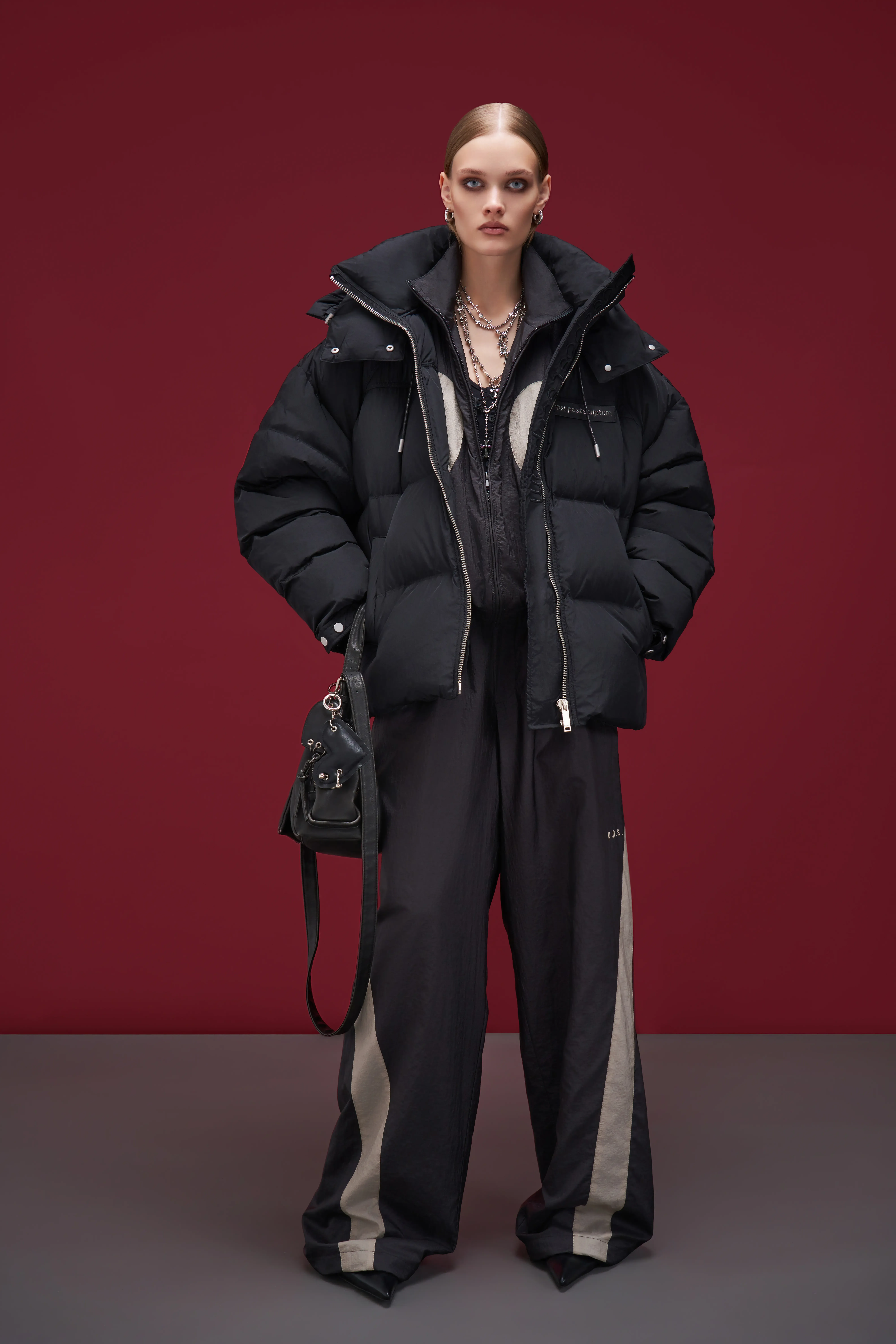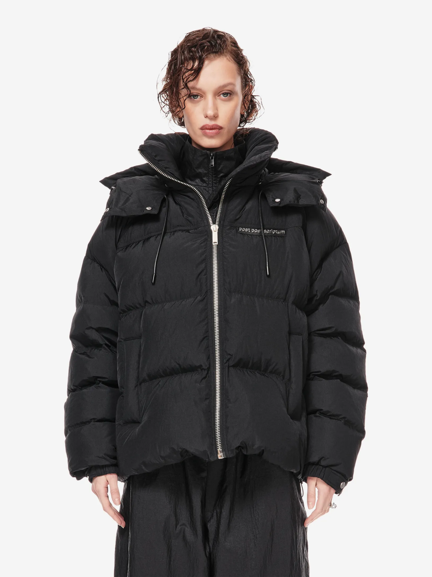 LOOM PUFF — архитектурный силуэт в оверсайз-пуховике. функциональные элементы — регулируемый капюшон, высокая стойка и система кулис — определяют скульптурный крой. узнаваемость бренда проявляется в деталях: металлические буквы post post scriptum и гравировка на фурнитуре. вещь, сочетающая утилитарность и эстетику для температуры до –25 °C.