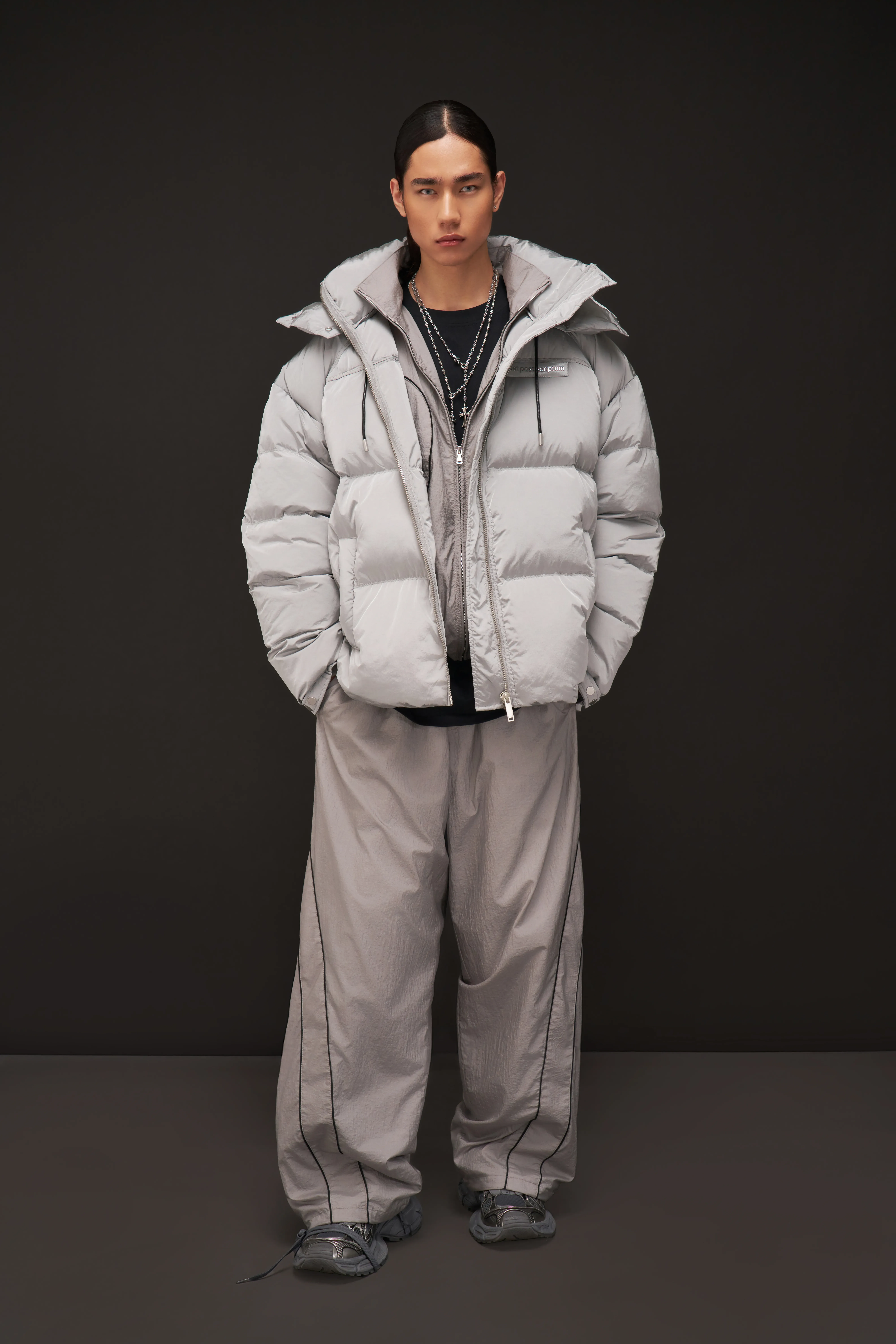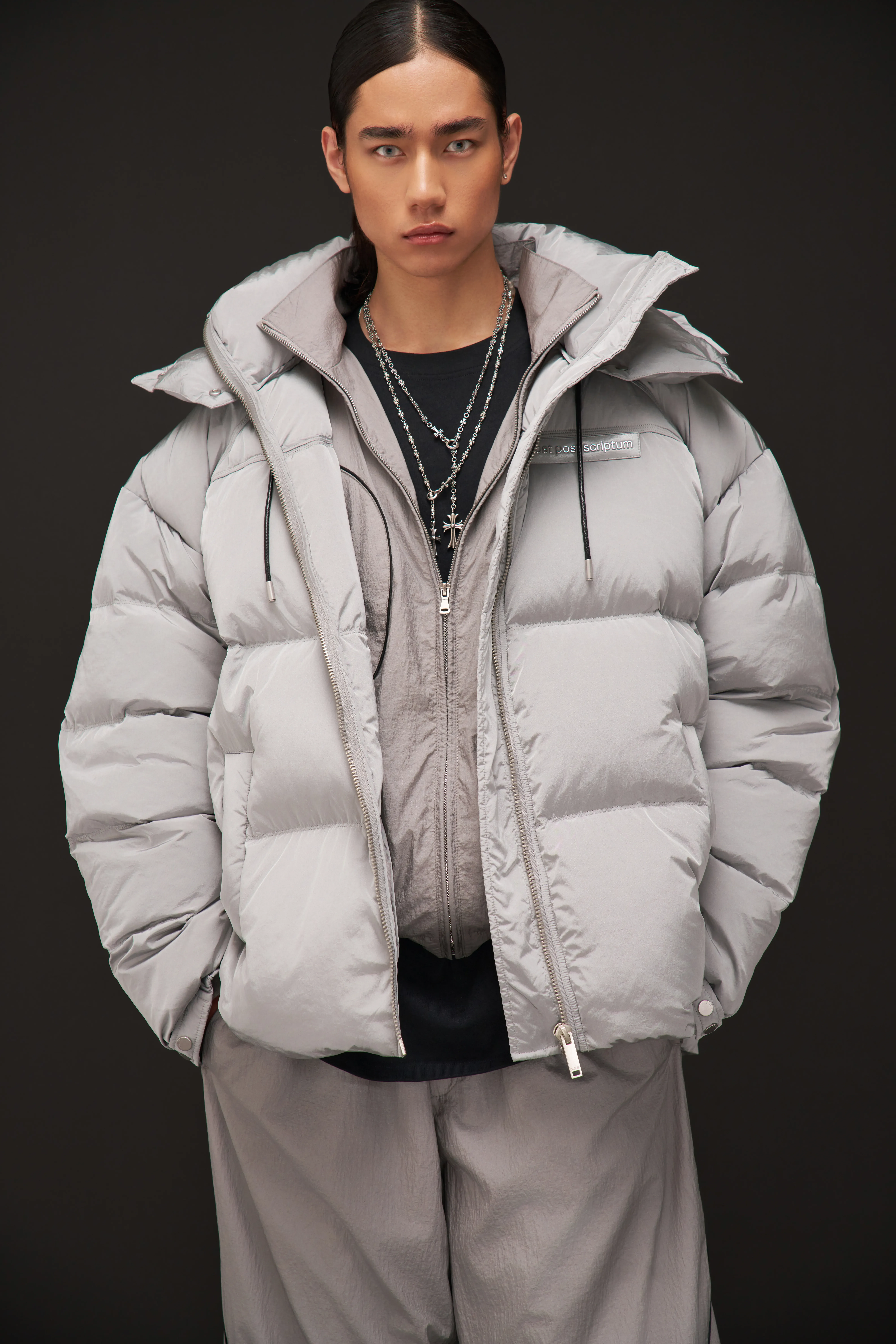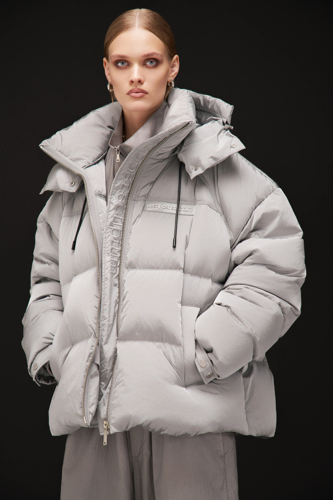 LOOM PUFF — архитектурный силуэт в оверсайз-пуховике. функциональные элементы — регулируемый капюшон, высокая стойка и система кулис — определяют скульптурный крой. узнаваемость бренда проявляется в деталях: металлические буквы post post scriptum и гравировка на фурнитуре. вещь, сочетающая утилитарность и эстетику для температуры до –25 °C.
