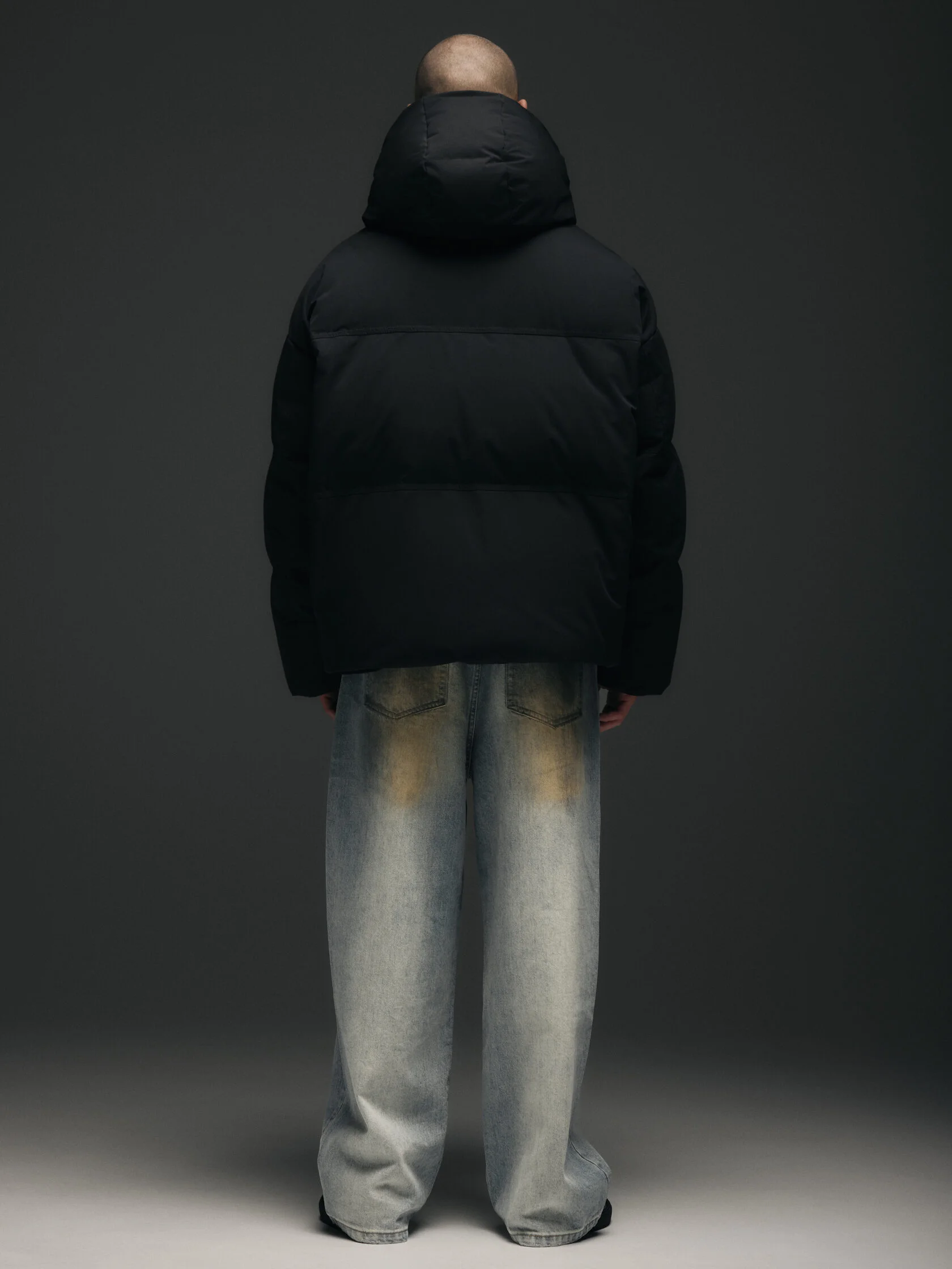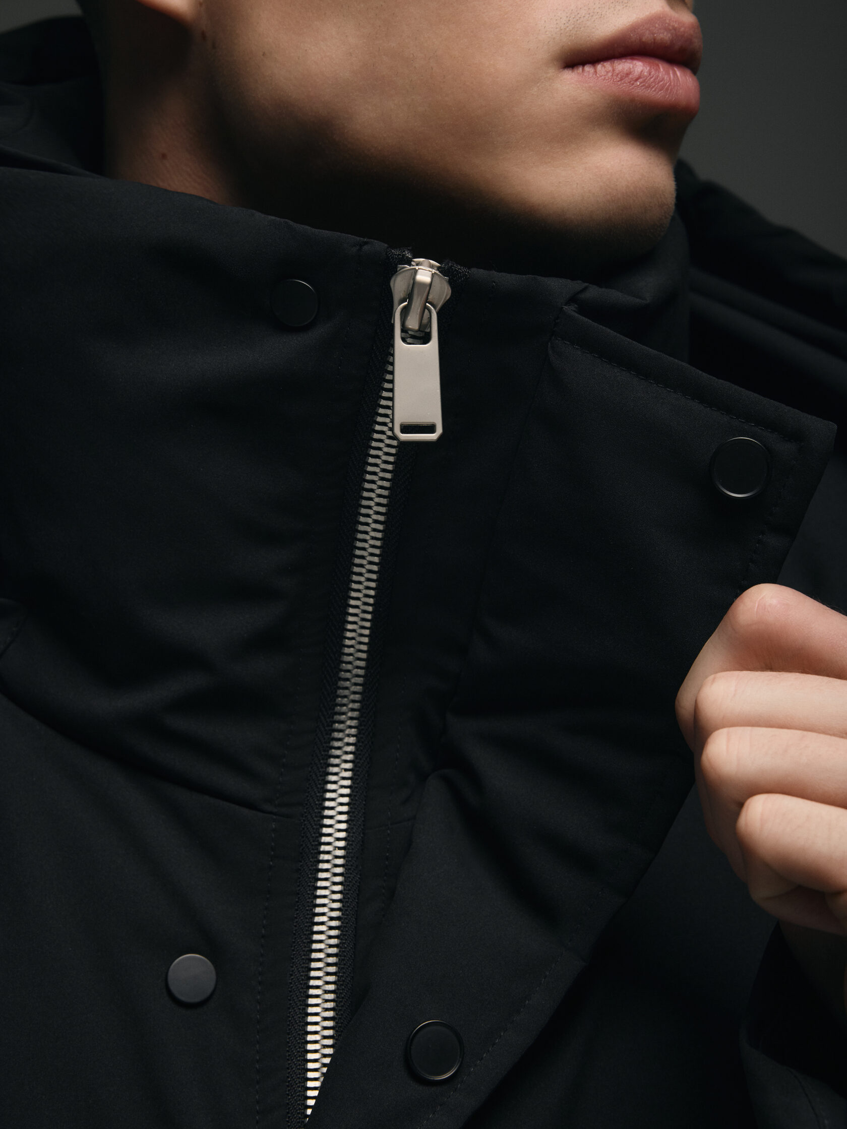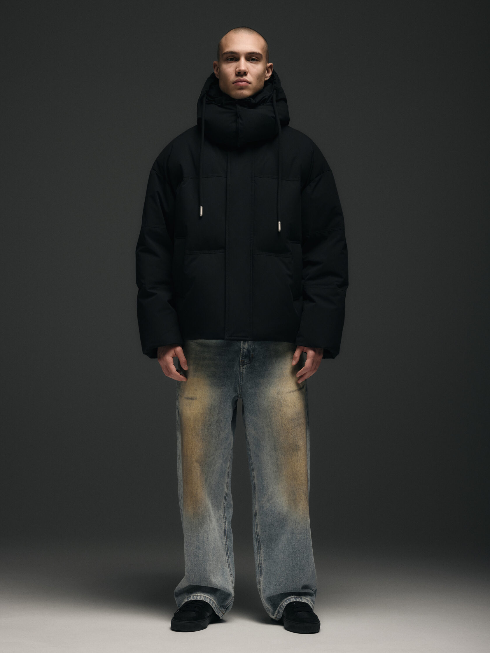 Модель создана для зимних условий с утеплителем премиум-класса — 90% утиного пуха и пера, что обеспечивает максимальное тепло без излишней тяжести. Объемный крой удлиненной формы гарантирует полное покрытие тела, а стоячий воротник и съемный глубокий капюшон создают многоуровневую защиту. Основная застежка-молния дополнена ветрозащитным клапаном на кнопках, блокирующим проникновение холодного воздуха. Два боковых кармана с мягкой подкладкой сохраняют тепло рук. Пуховик демонстрирует баланс функциональности и стиля — сочетается с утепленными брюками и высокими ботинками, обеспечивая комфорт в городской среде и за ее пределами.