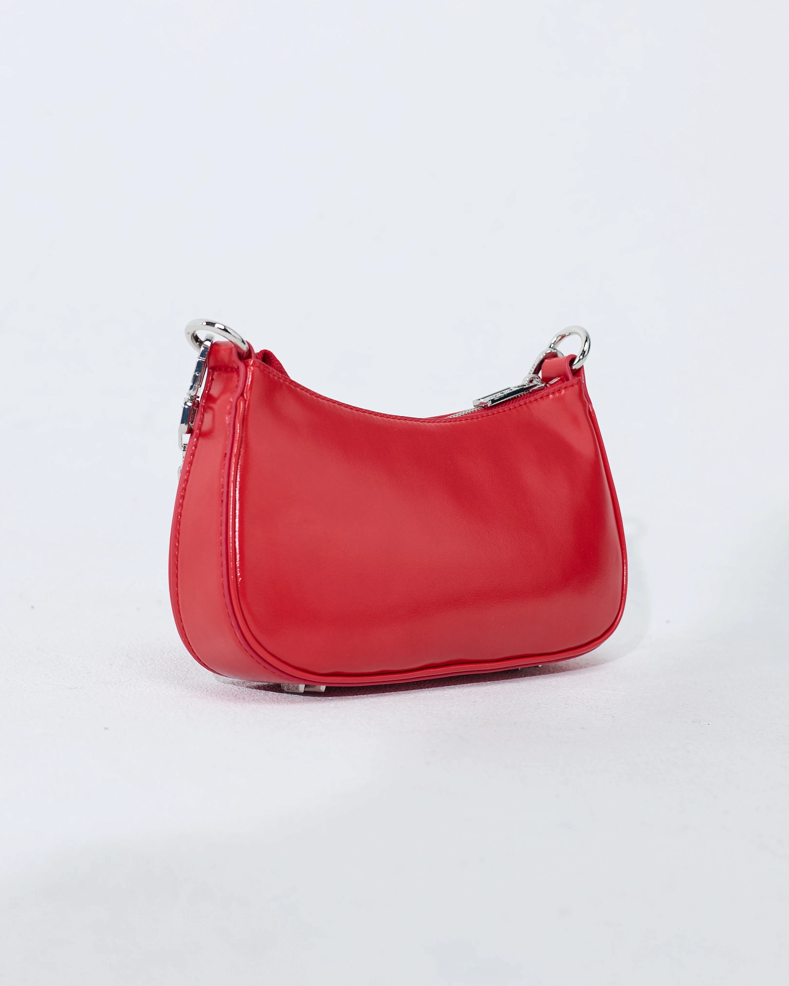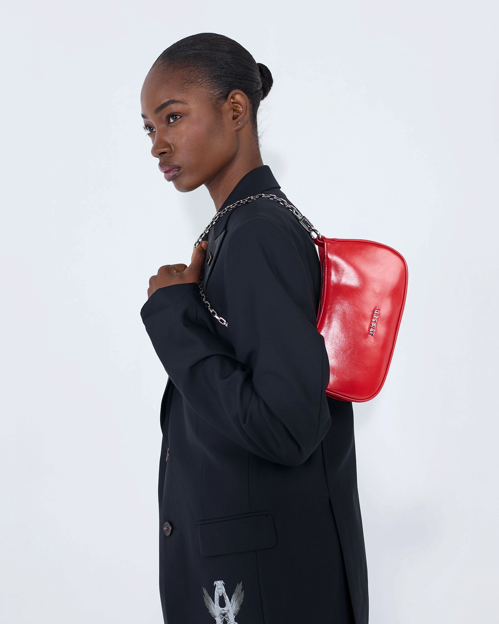 Лаконичная сумка формы багет из глянцевой экокожи насыщенного красного оттенка. Минималистичный силуэт с мягкими закруглёнными линиями дополнен металлическим логотипом бренда на передней панели. Модель на молнии оснащена съёмным ремешком-цепочкой с карабинами и покоями в форме стрелки. Идеальный аксессуар для вечерних и повседневных образов.