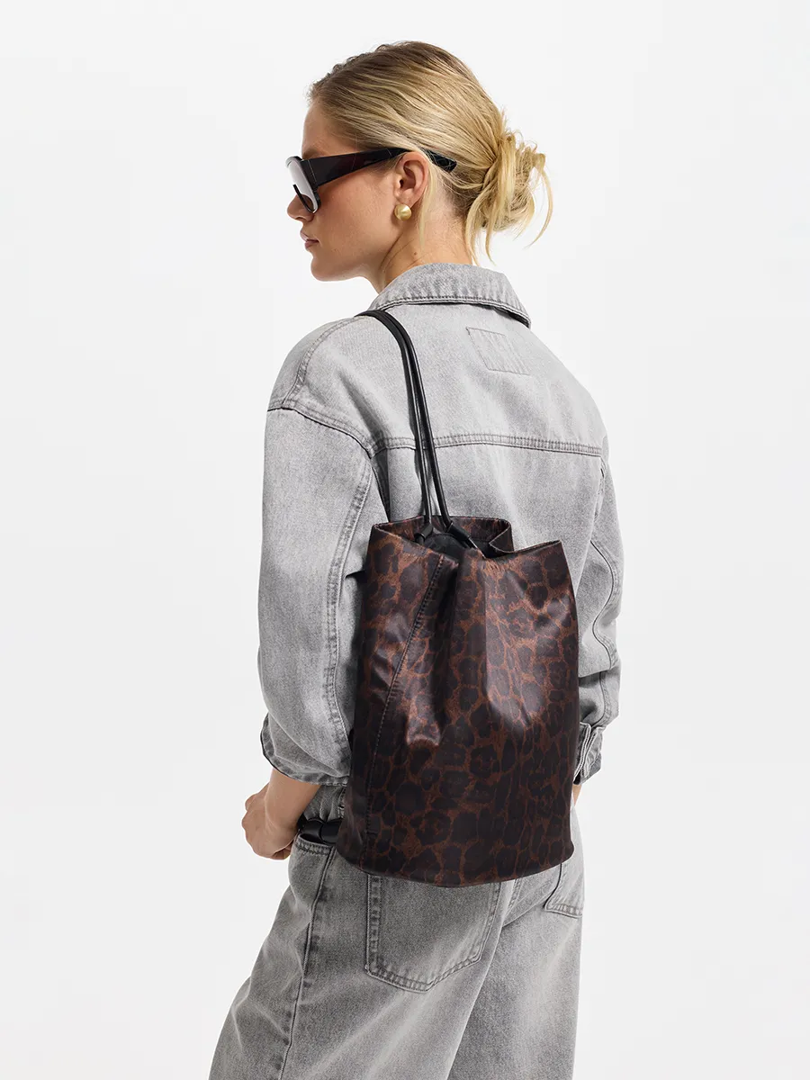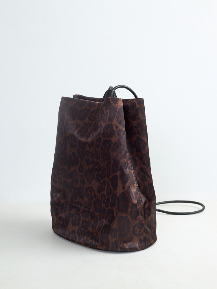 Сумка-мешок с леопардовым принтом – тренд среди аксессуаров в женском гардеробе. Модель выполнена из плотного текстиля с глянцевым эффектом.