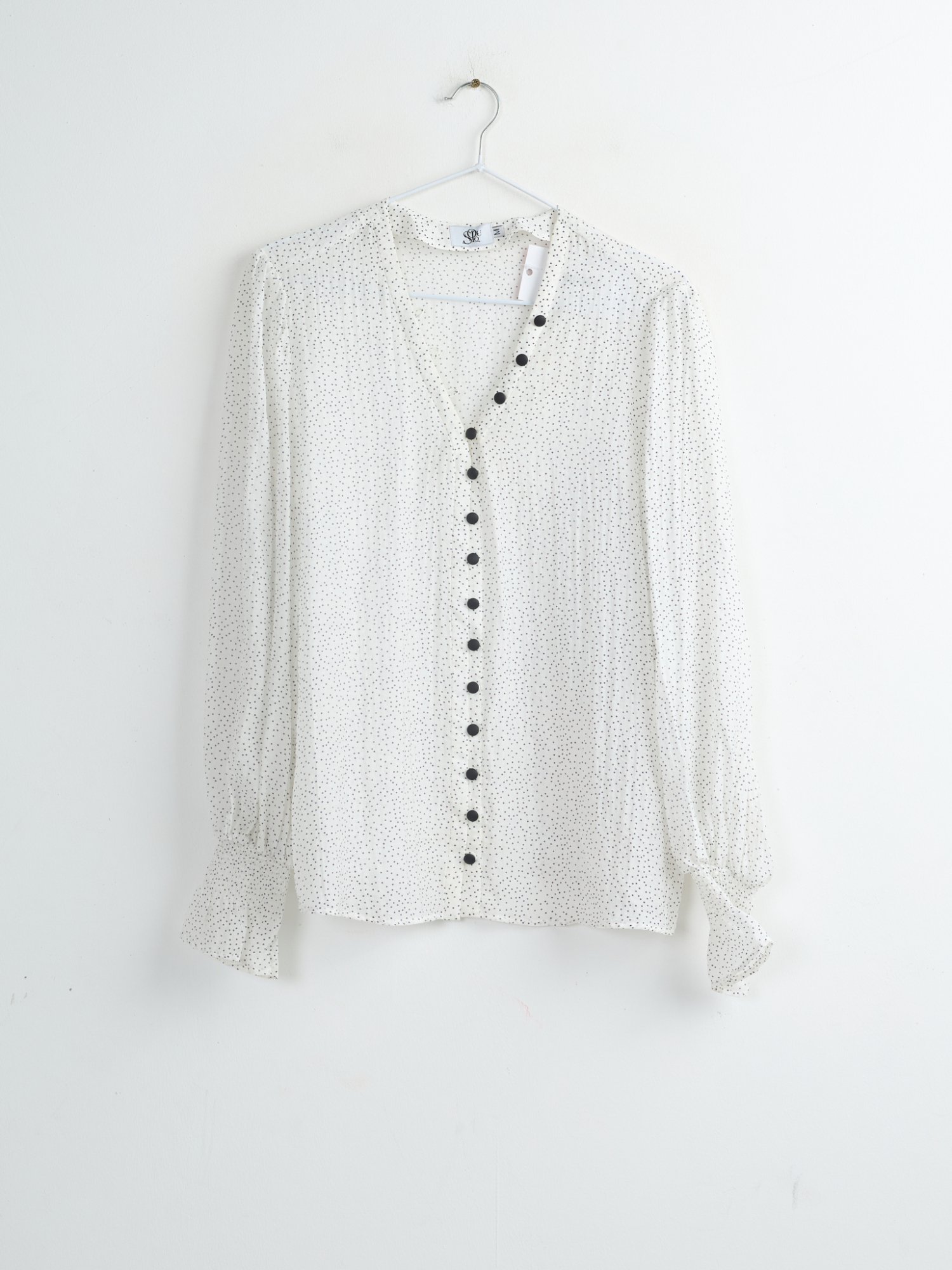 Белая блуза в мелкий горох — идеальный выбор для создания лёгкого и воздушного образа. Она станет отличным дополнением к любому гардеробу и подойдёт для офисных встреч, повседневных прогулок и мероприятий с нестрогим дресс-кодом.