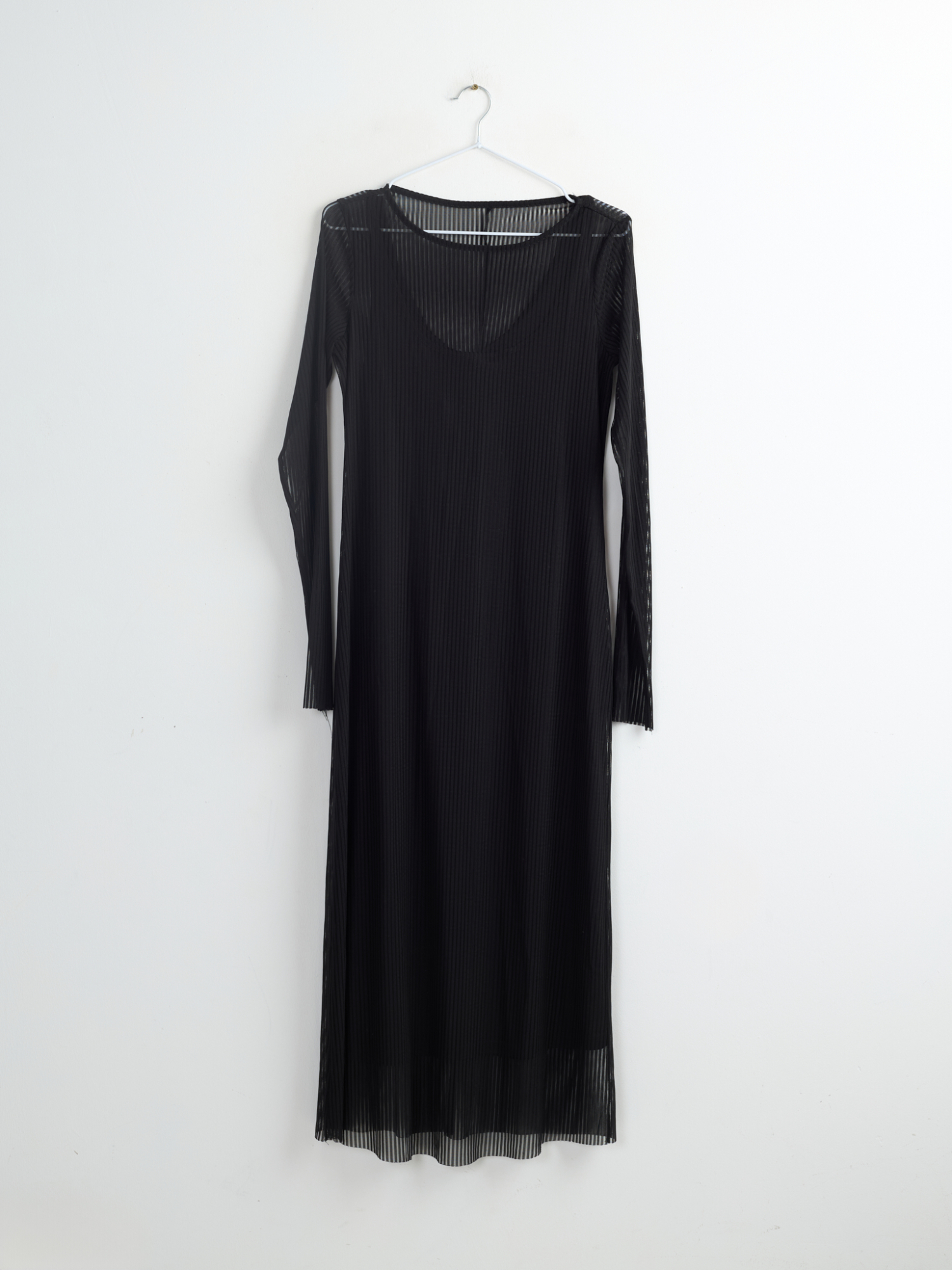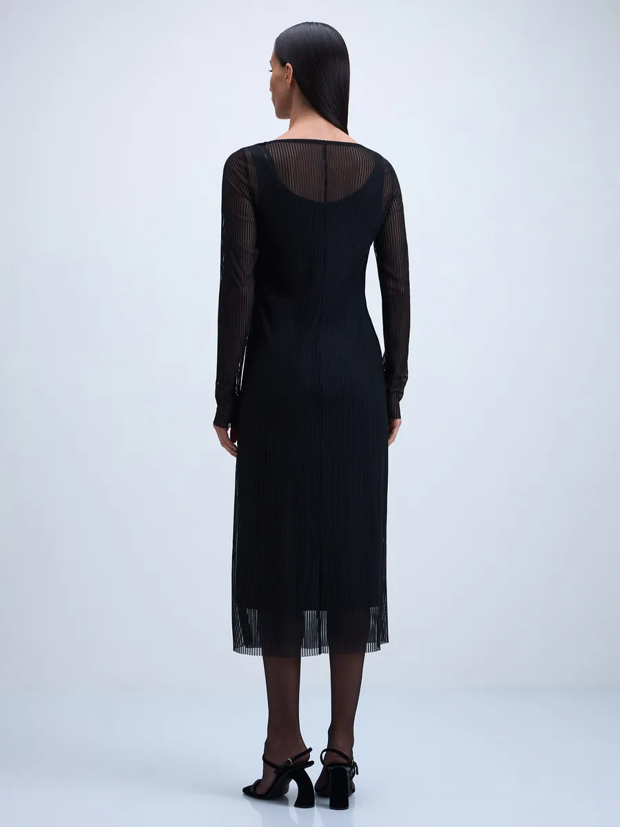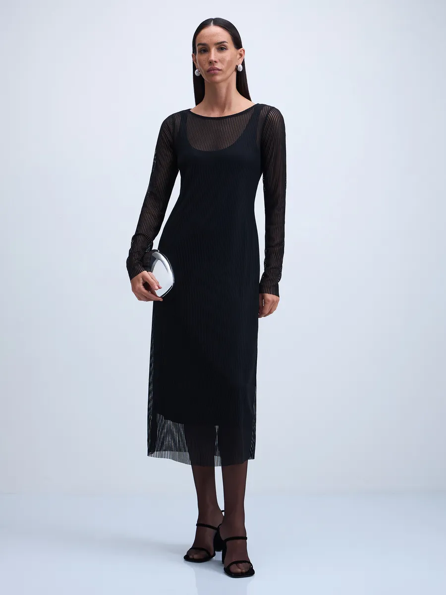Сетчатое платье миди с принтом в полоску в черном цвете.