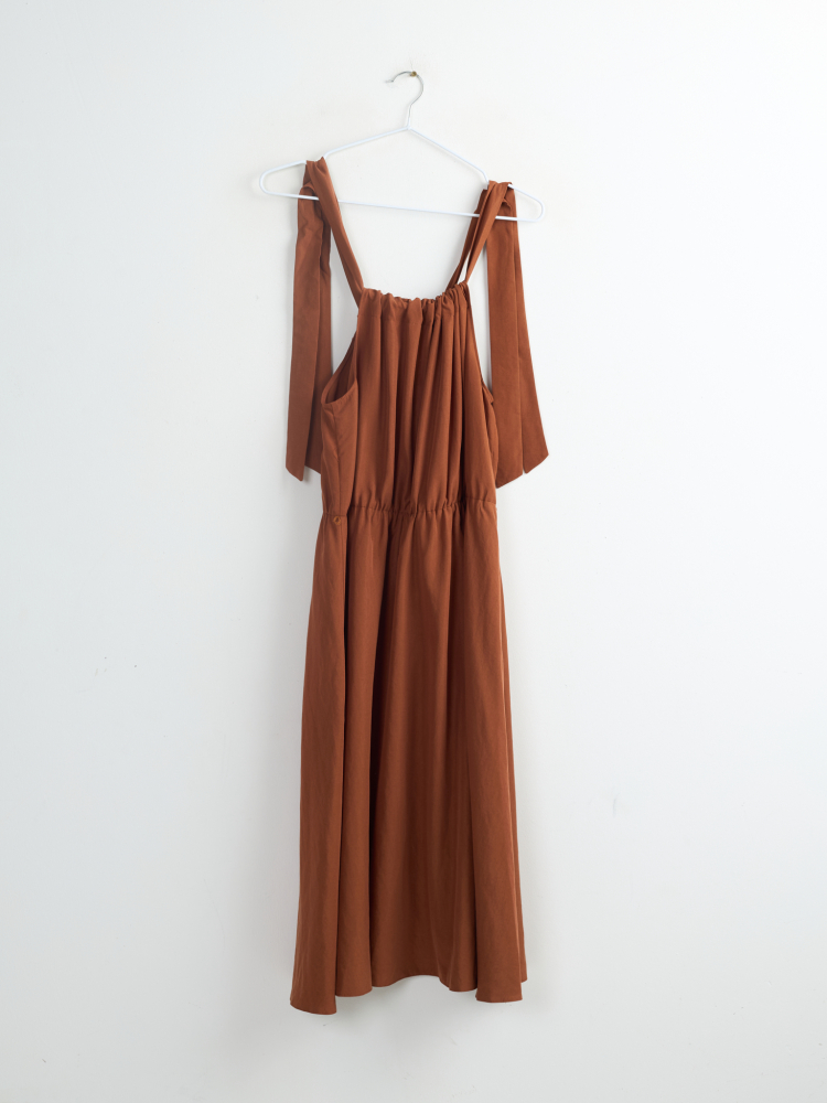 Коричневое платье-сарафан на завязках — это стильный и удобный вариант для повседневной носки. Модель отличается свободным кроем, который позволяет чувствовать себя комфортно.