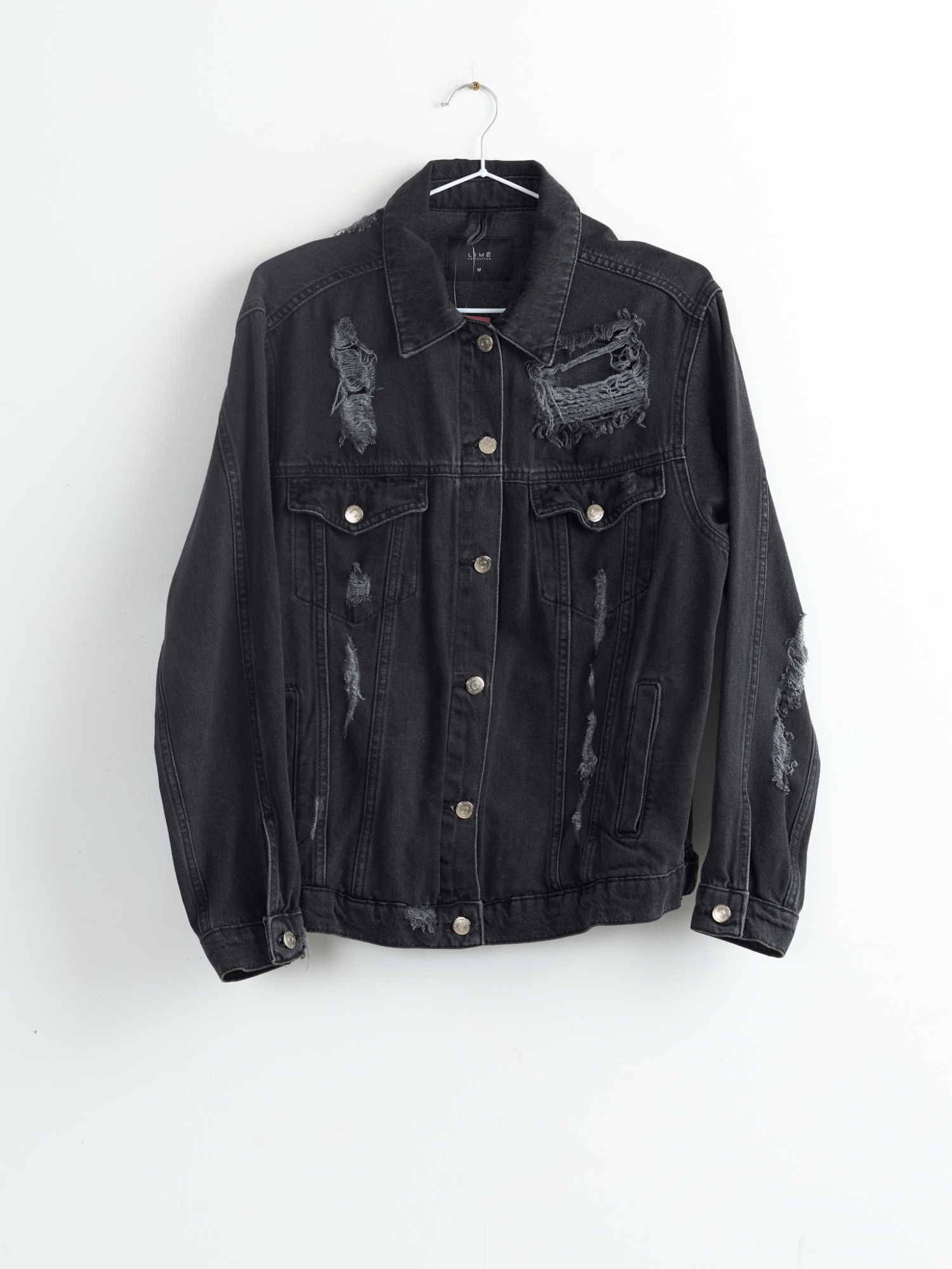 Чёрная джинсовая куртка с потёртостями — стильный и практичный элемент гардероба. Она сочетает в себе удобство и модный вид, который подойдёт для различных образов.