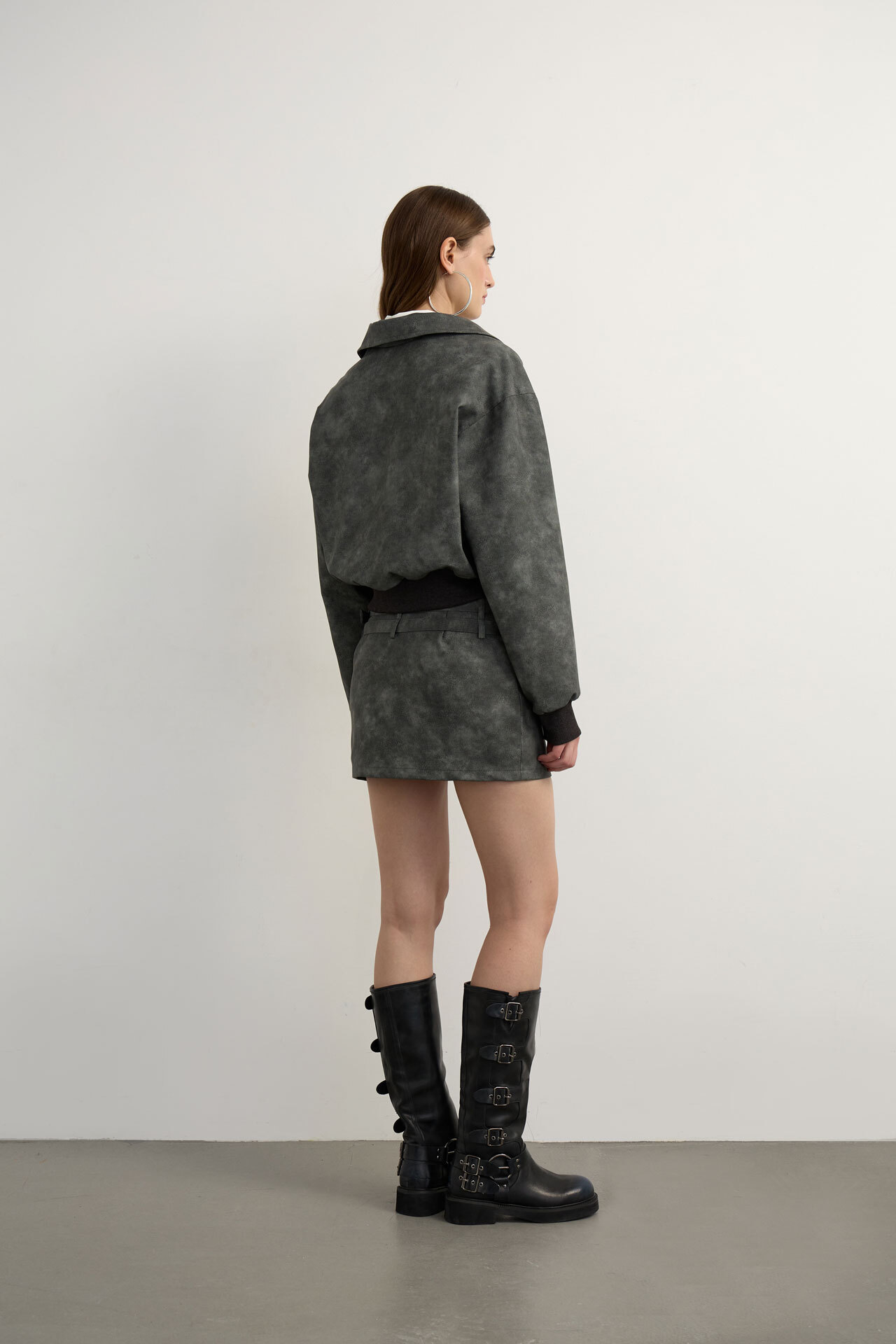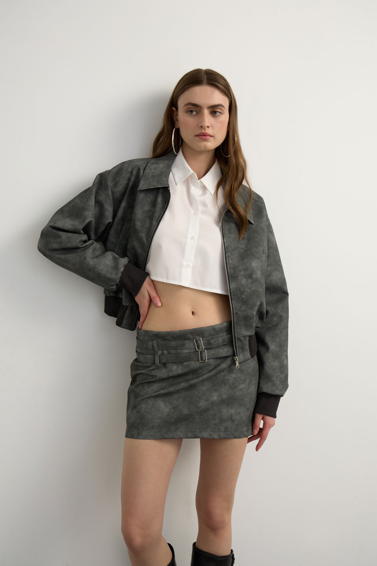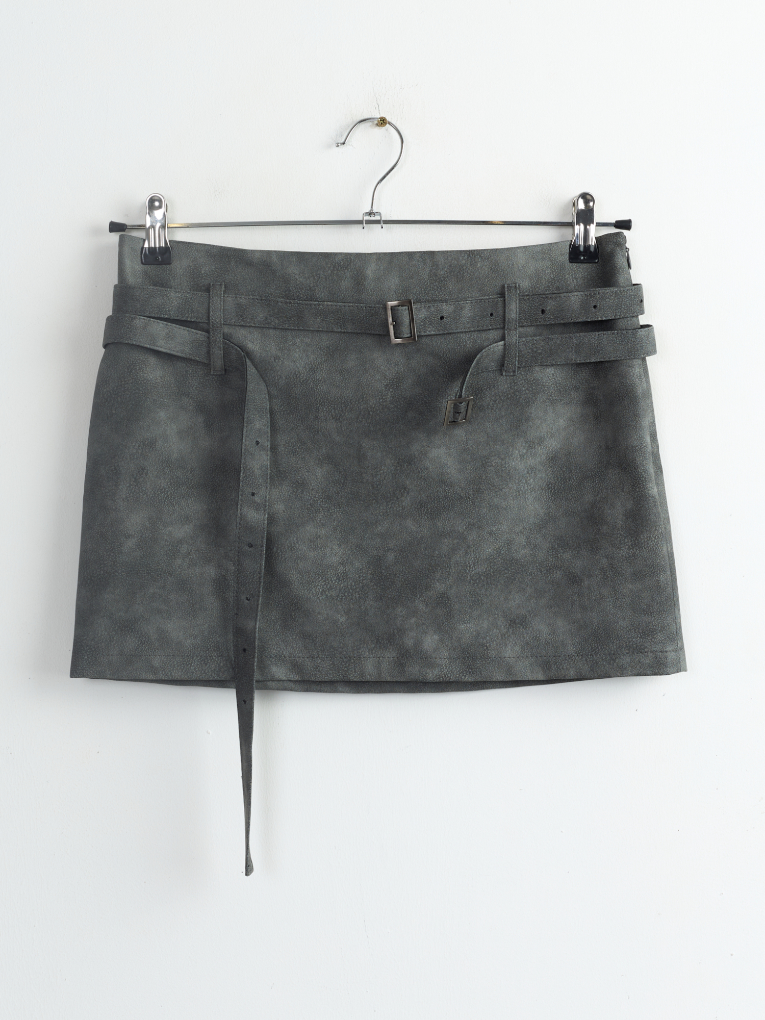 Юбка мини из экокожи с двойным поясом в графитовом цвете.