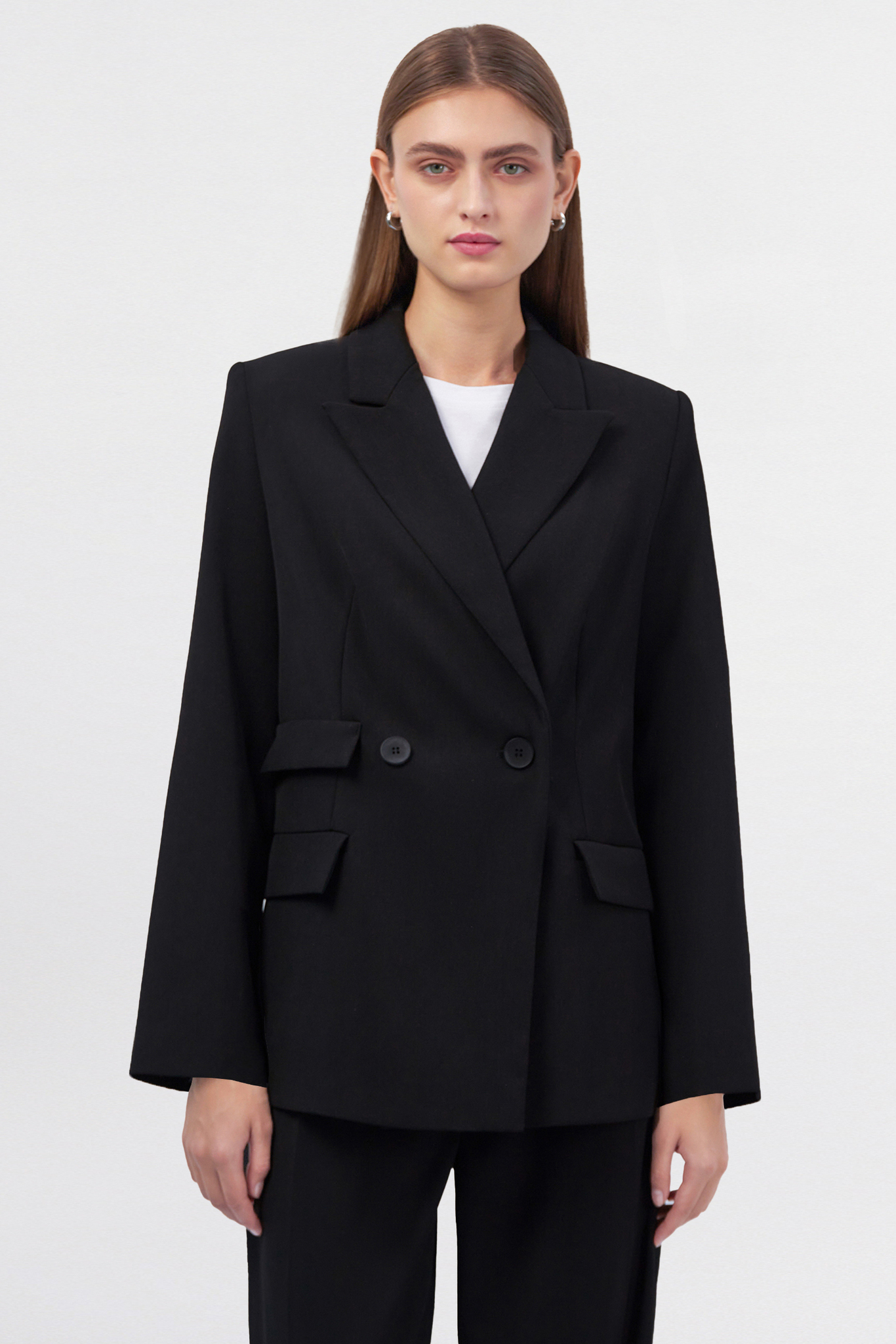 Двубортный жакет незаменим в офисе и отлично смотрится в неформальной обстановке. В первом случае носите его с палаццо Mollis, а во втором сочетайте с джинсами, кожаными брюками и джоггерами.