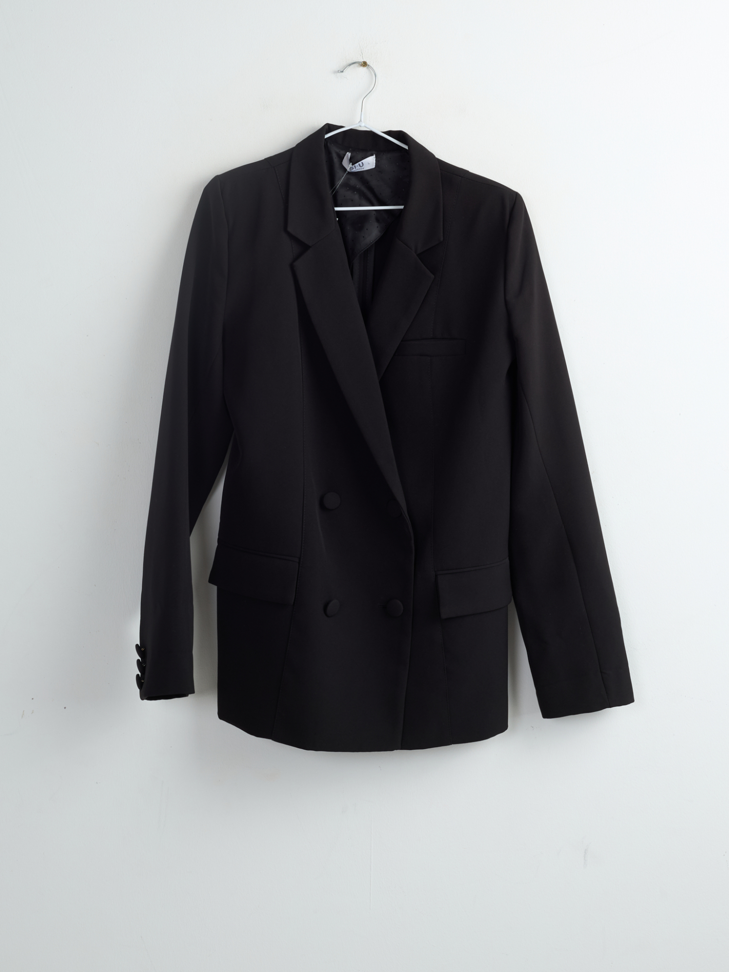 Двубортный чёрный жакет — это стильная и элегантная верхняя одежда, которая станет отличным дополнением к вашему гардеробу.
