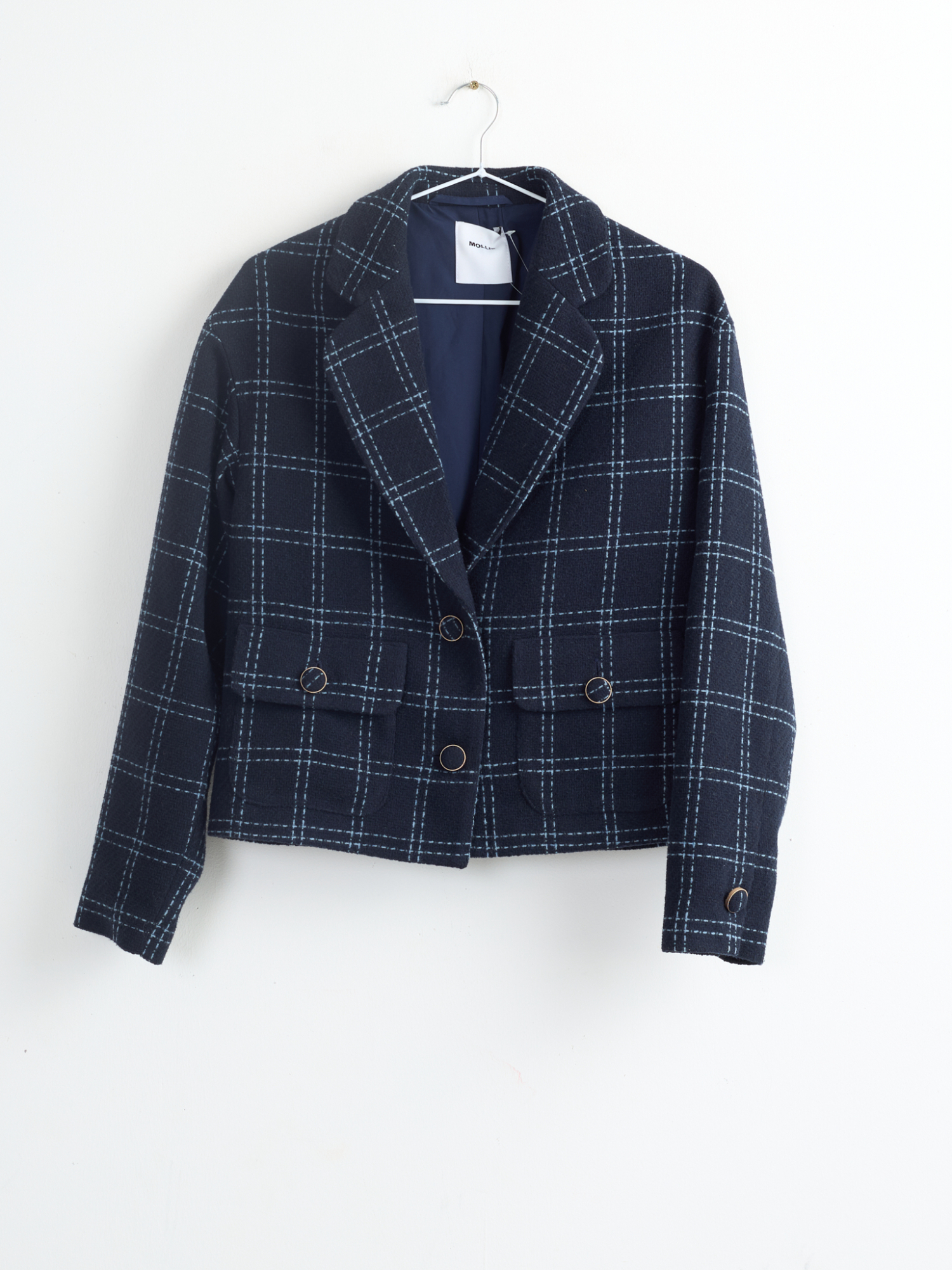 Укороченный синий жакет в клетку — это стильный и практичный элемент гардероба. Подойдёт для создания как повседневных, так и более элегантных образов.