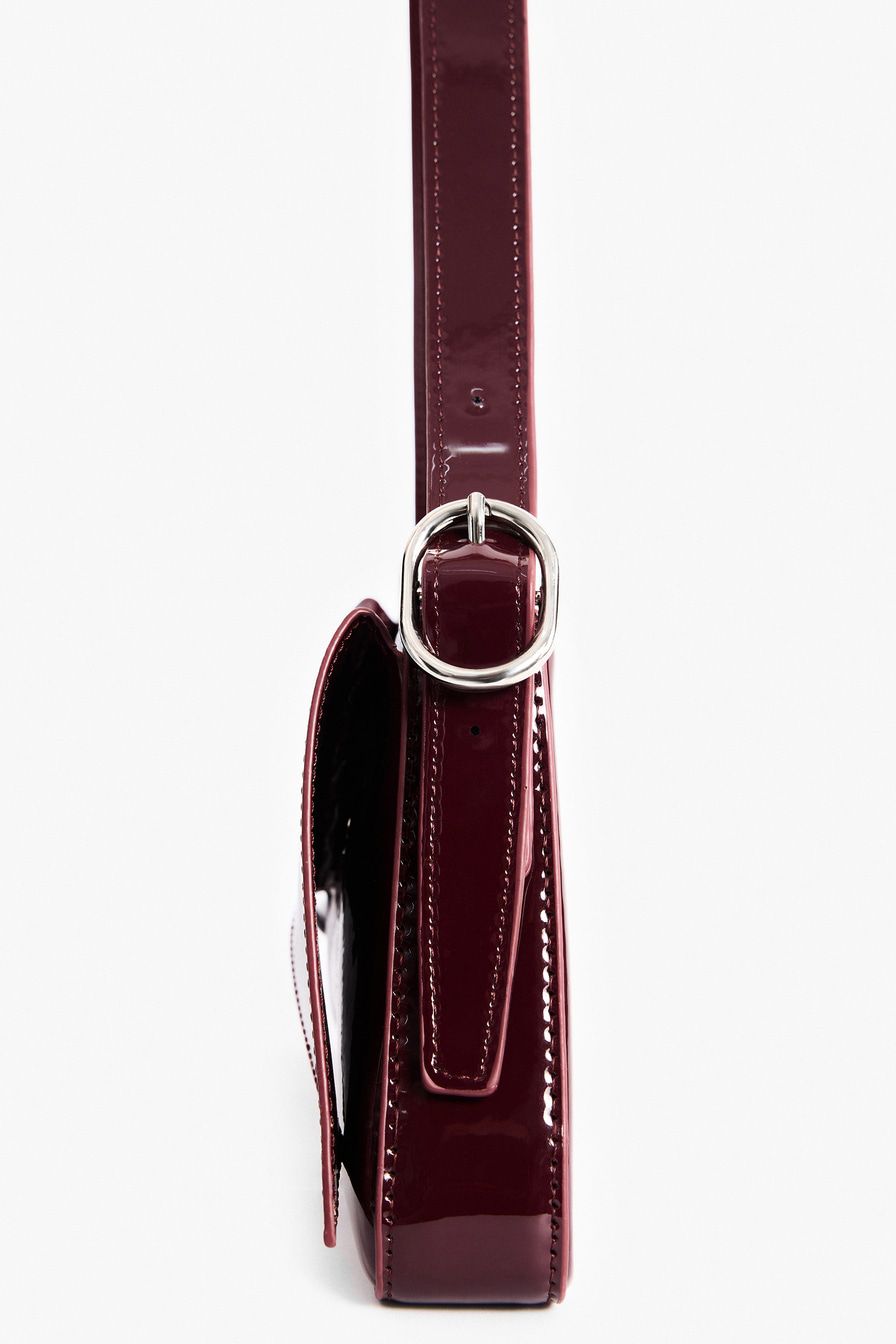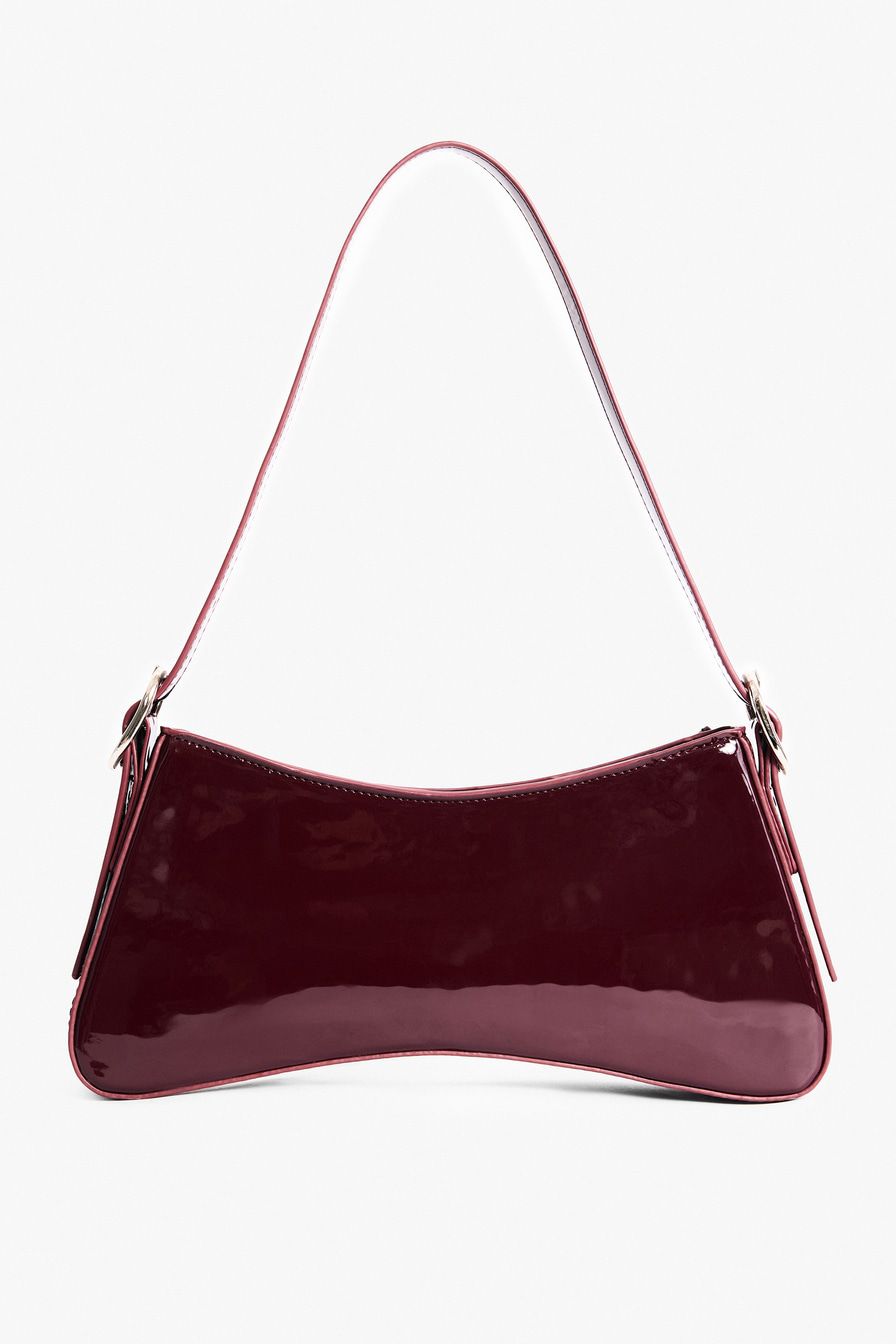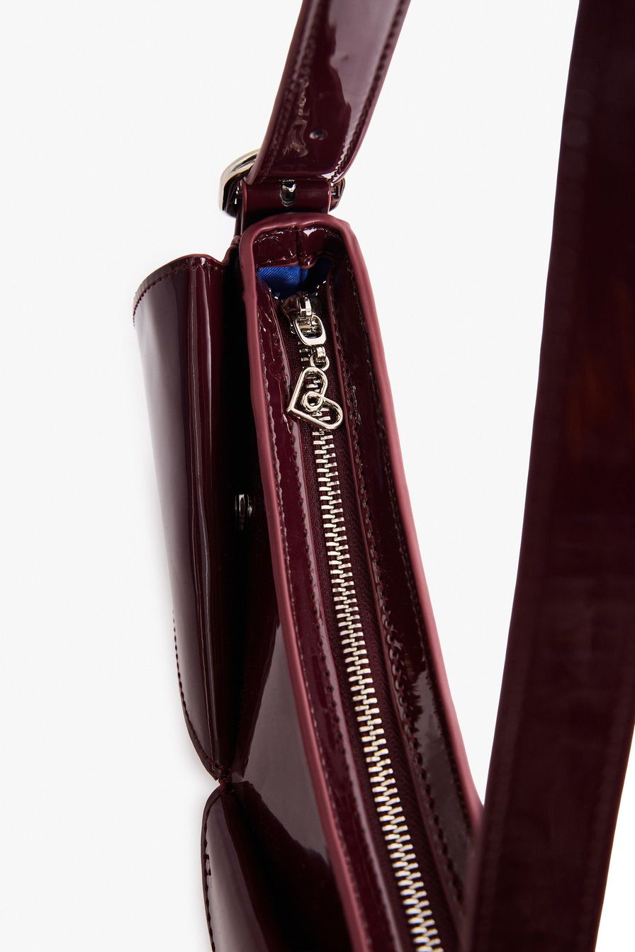 Бордовая сумка-багет трапециевидной формы выполнена из лаковой экокожи и дополнена короткой ручкой с регулируемой длиной.