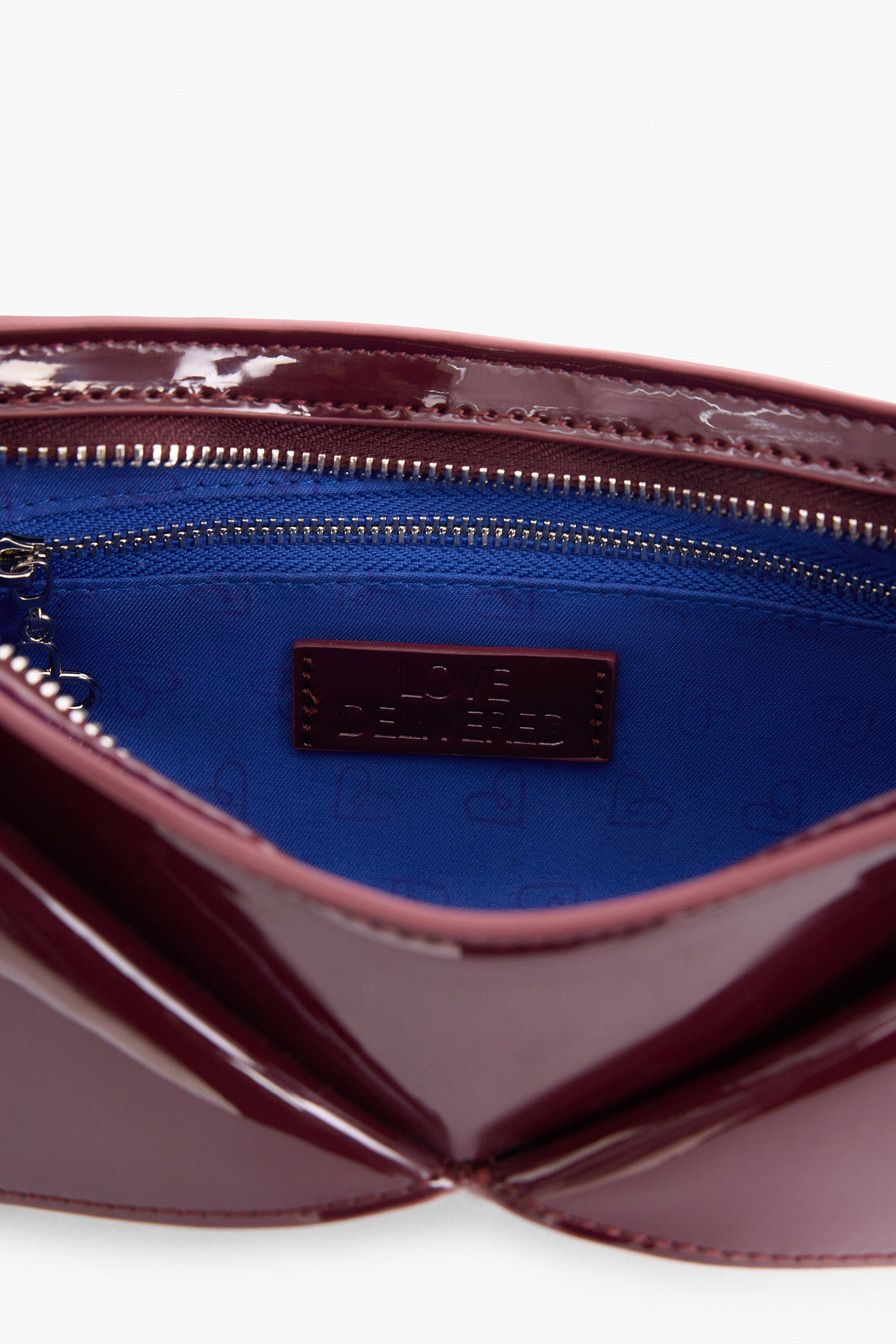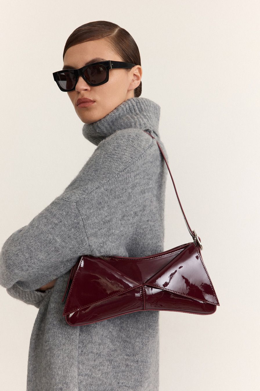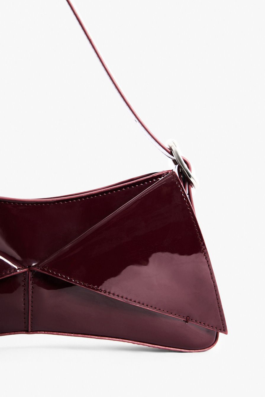 Бордовая сумка-багет трапециевидной формы выполнена из лаковой экокожи и дополнена короткой ручкой с регулируемой длиной.