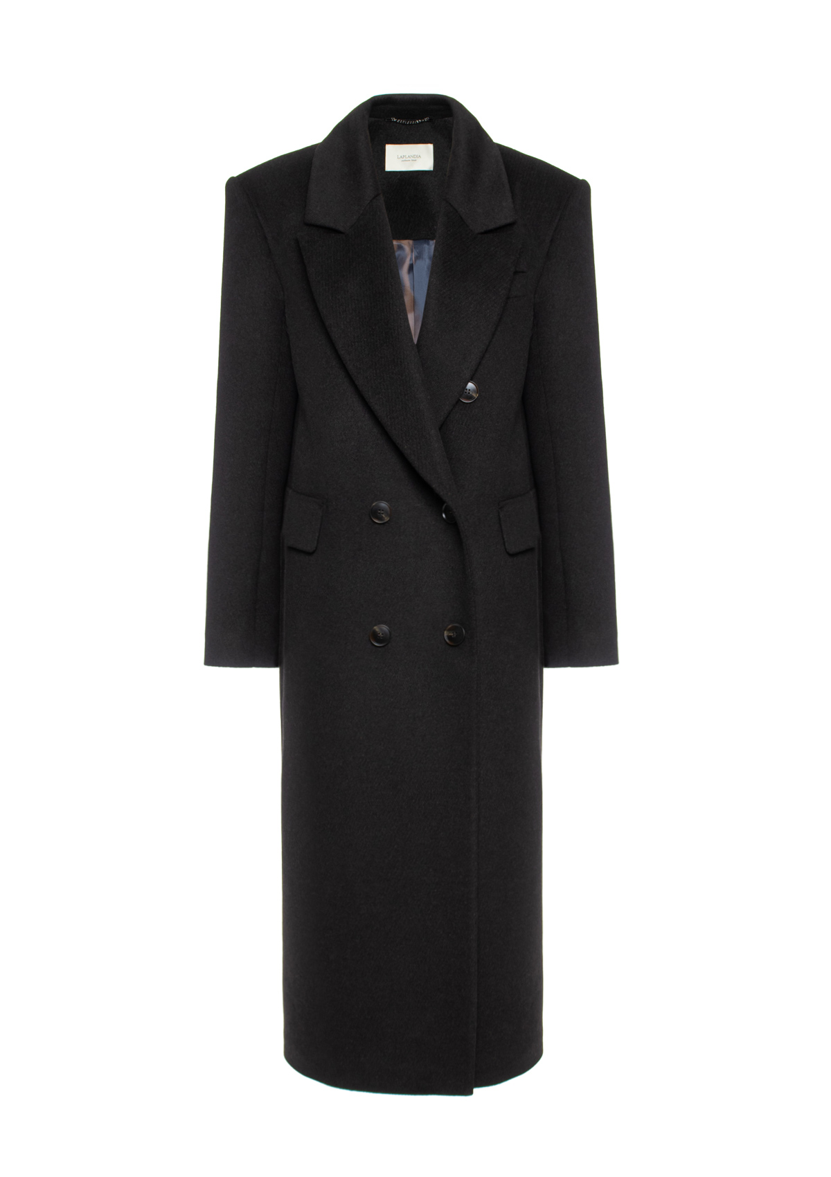Женское двубортное пальто Laplandia из шерсти с добавлением шелка. Модель прямого силуэта в мужском стиле длины-макси, английский воротник с широкими лацканами, втачной рукав, карманы в боковом шве, высокая шлица по спинке, застежка на пуговицы.