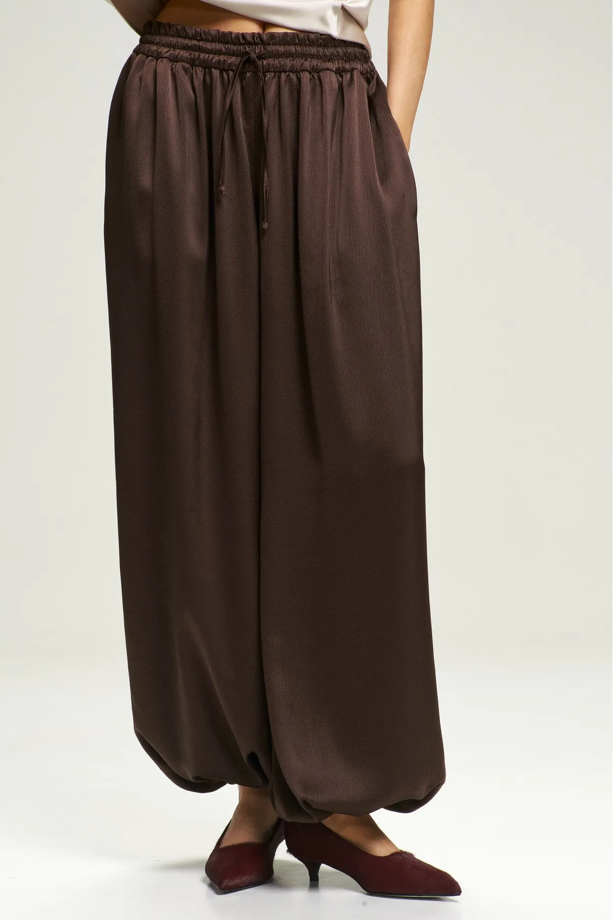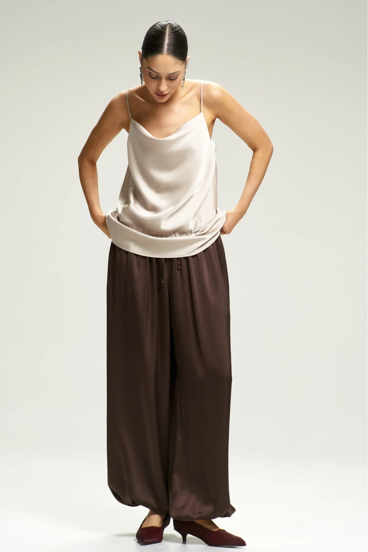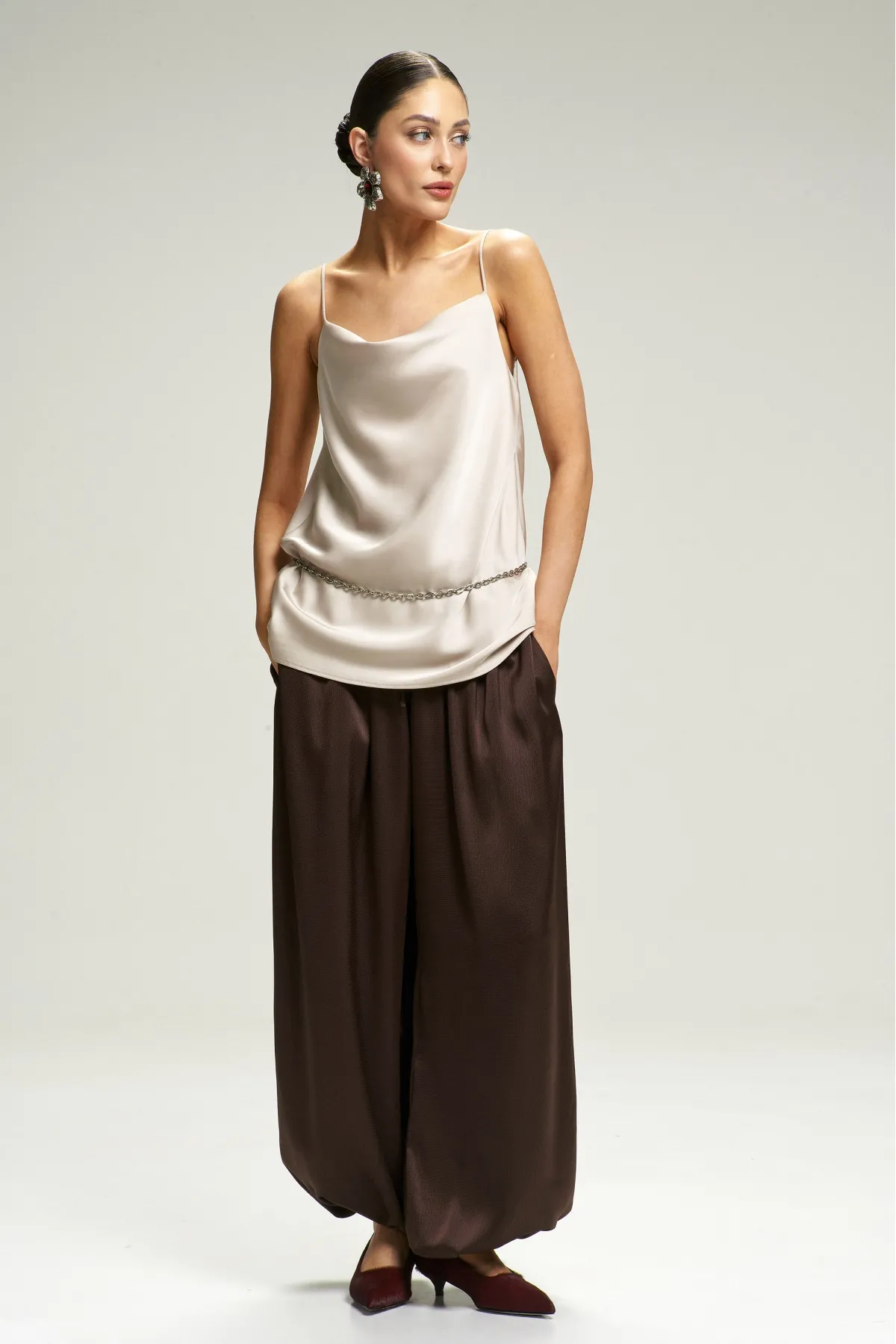 Брюки‑алладины из новогодней коллекции — легкие и струятся при каждом движении, они создают эффектный, праздничный силуэт. Модель универсальна и подойдёт на разные фигуры: свободный крой дарит комфорт, а тонкая блестящая ткань добавляет наряду торжественности.