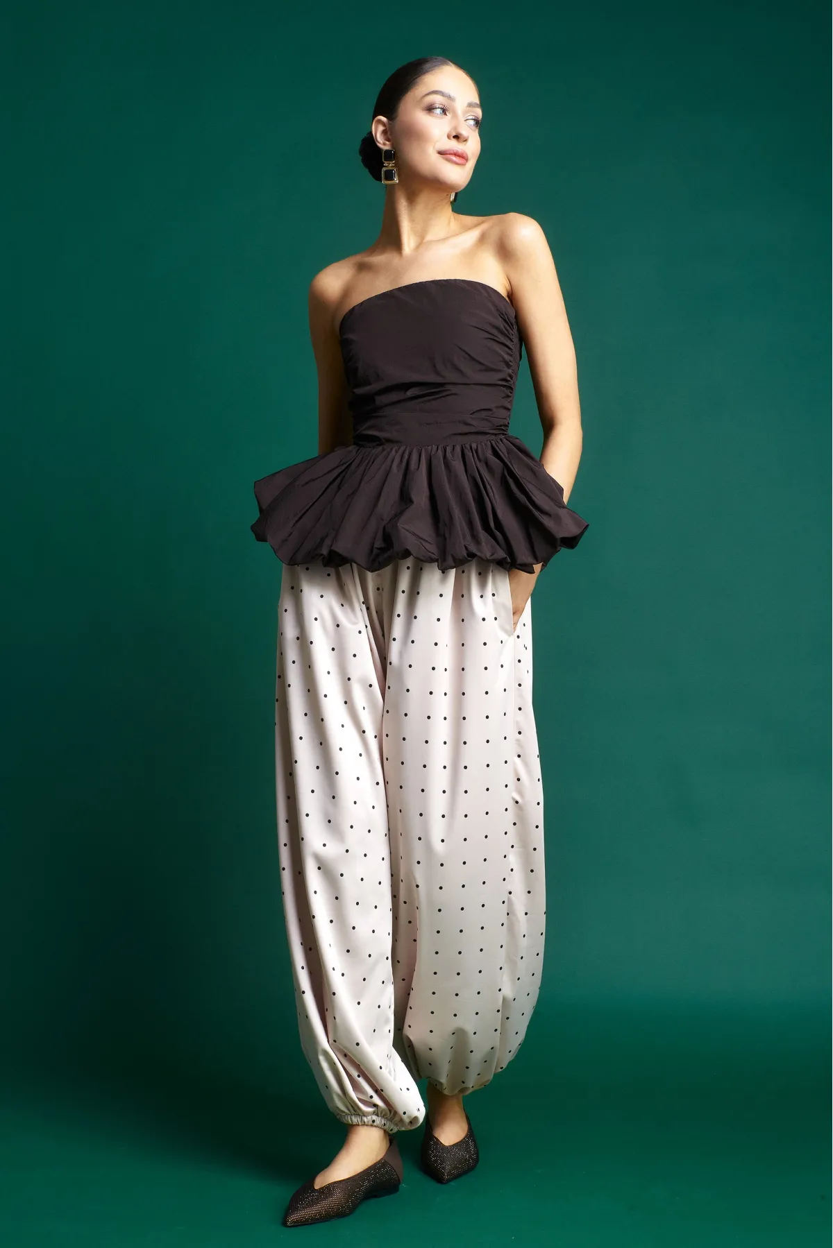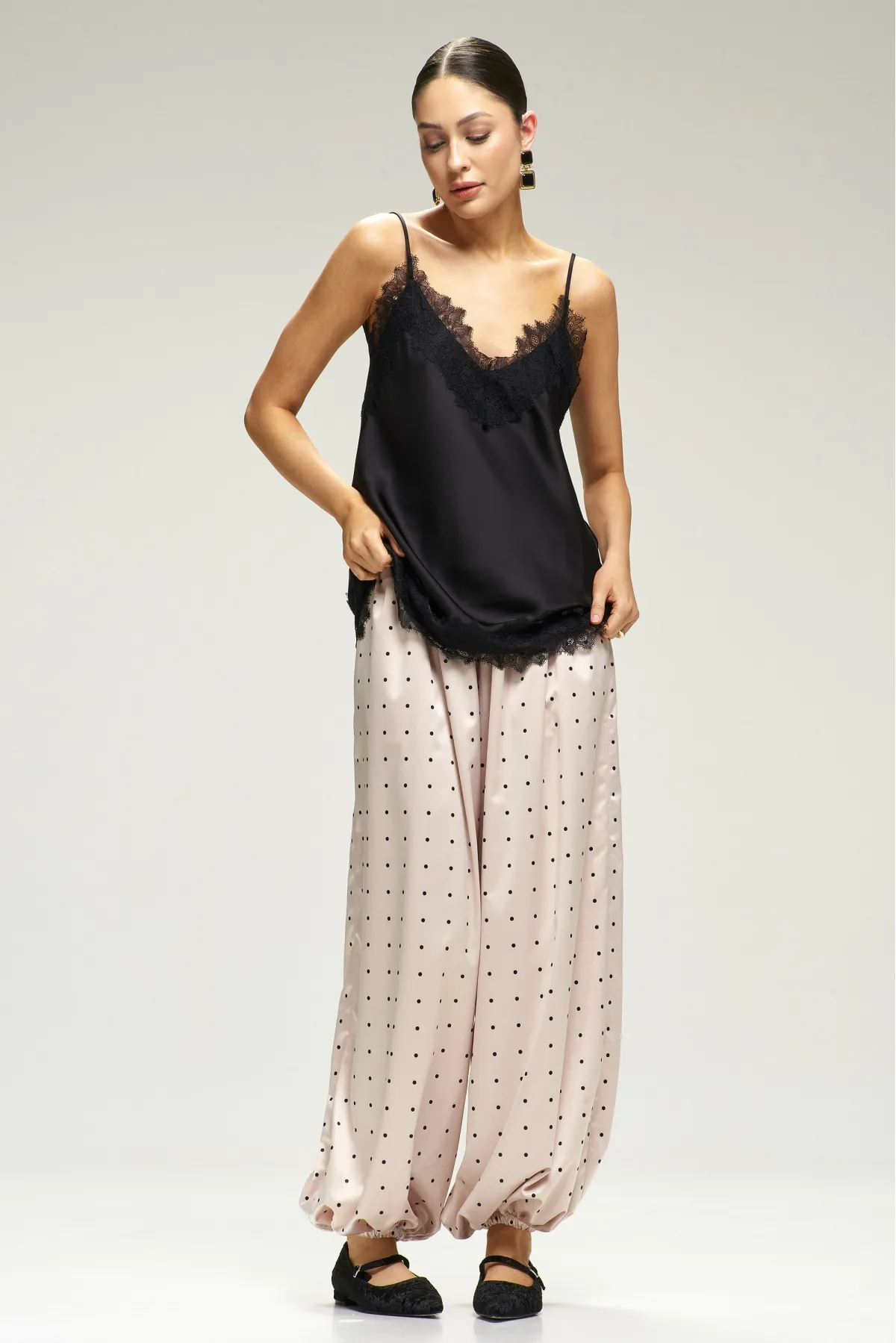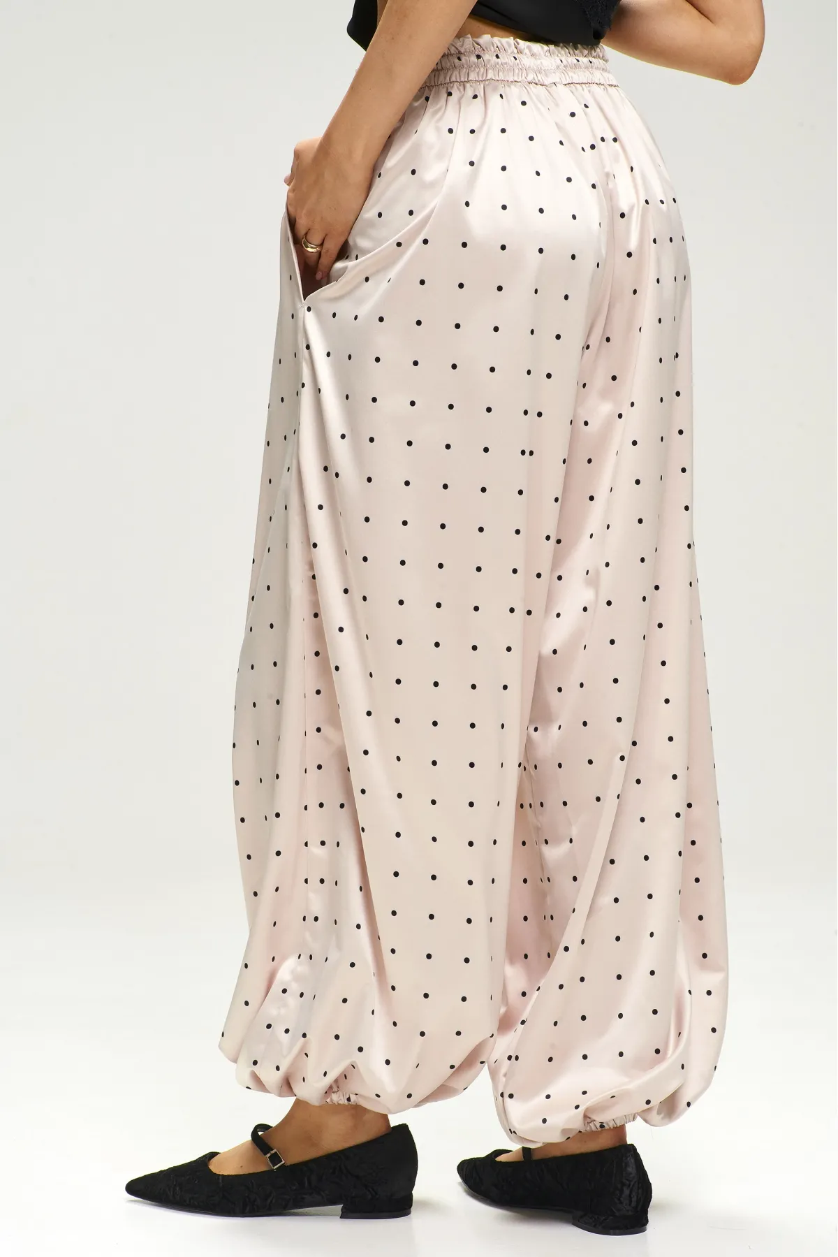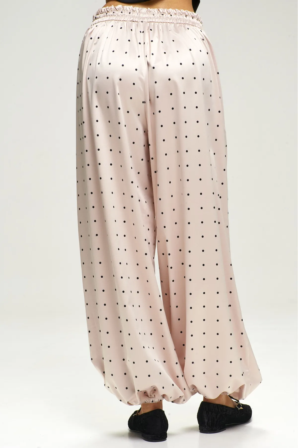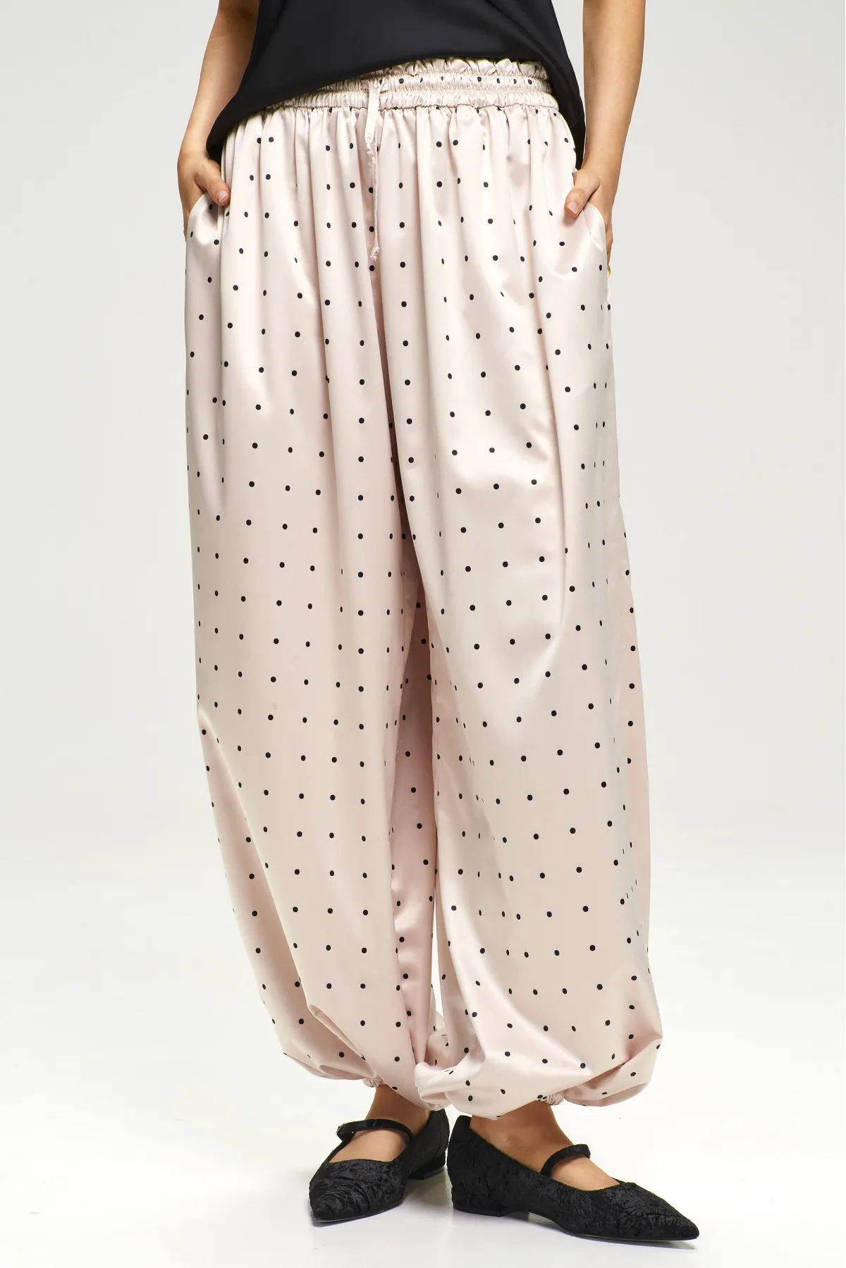 Брюки‑алладины из новогодней коллекции — легкие и струятся при каждом движении, они создают эффектный, праздничный силуэт. Модель универсальна и подойдёт на разные фигуры: свободный крой дарит комфорт, а тонкая блестящая ткань добавляет наряду торжественности.