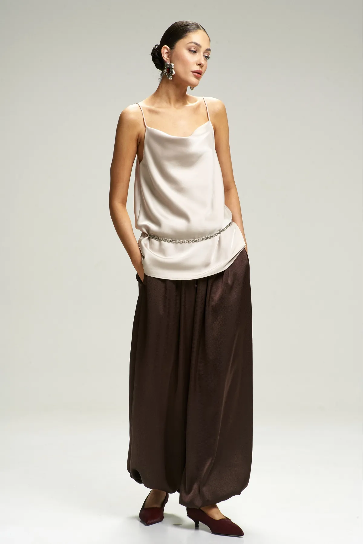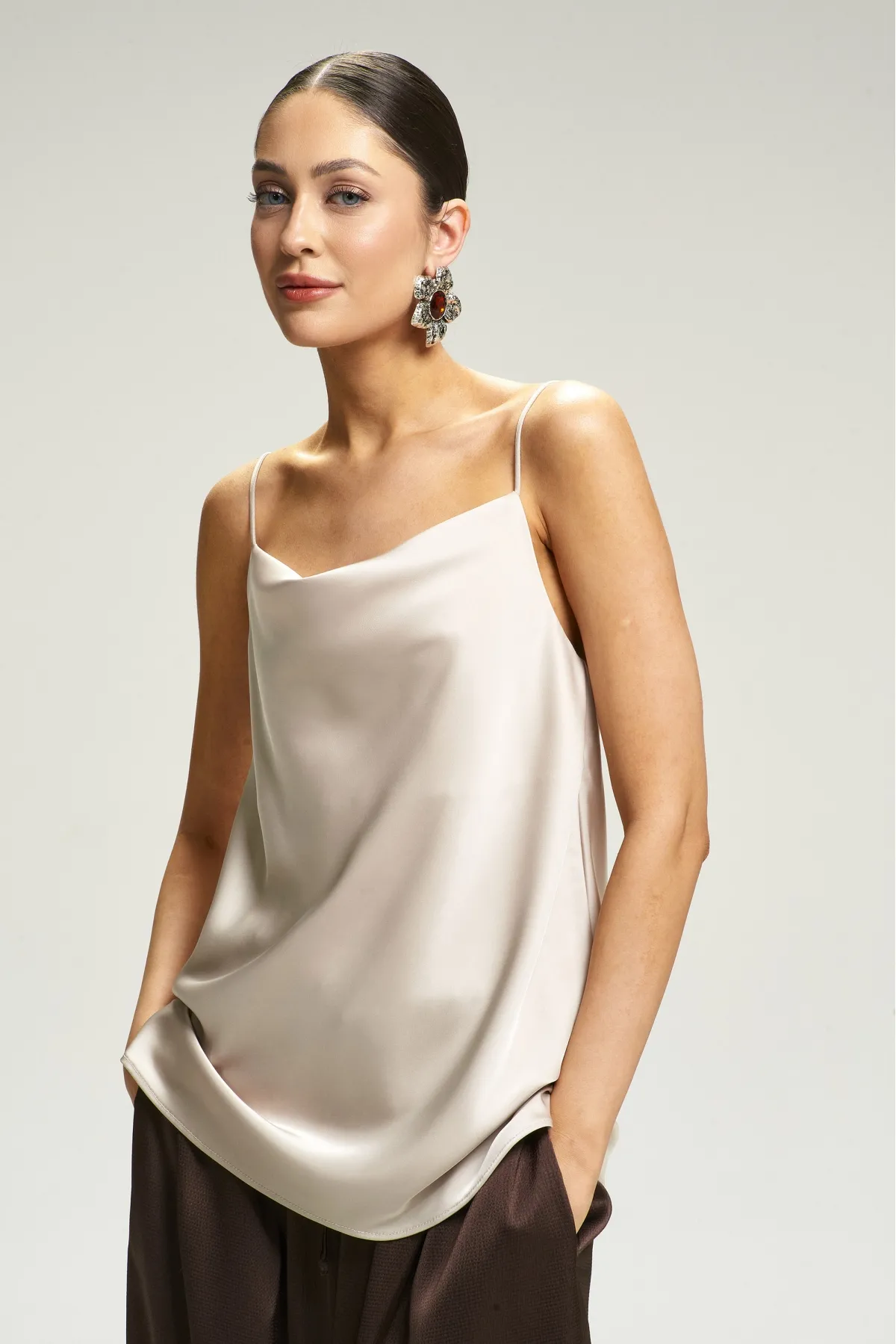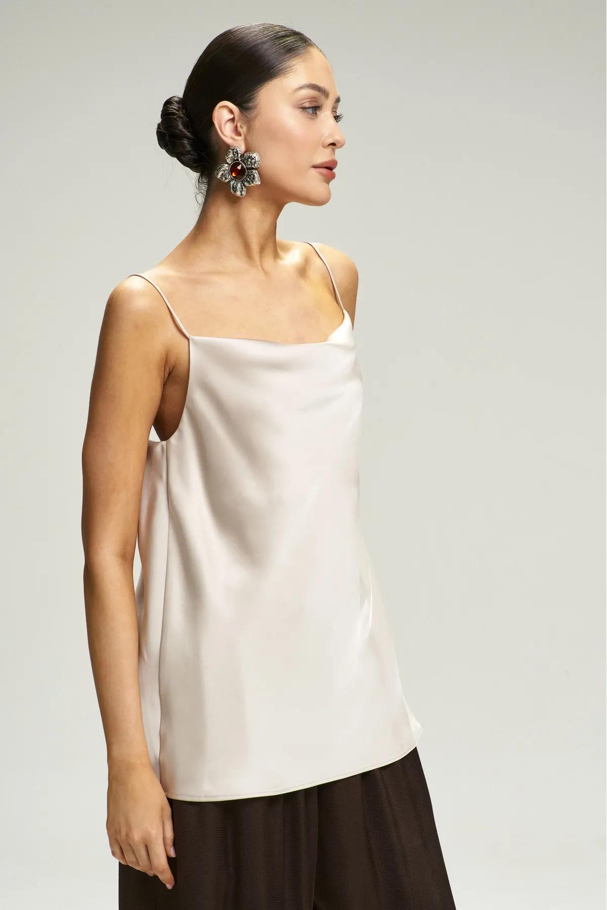 Атласный топ на тонких бретелях из новогодней коллекции — лаконичная и женственная вещь, которая идеально впишется в праздничный гардероб. Лёгкий блеск и минималистичный крой делают его универсальным.
