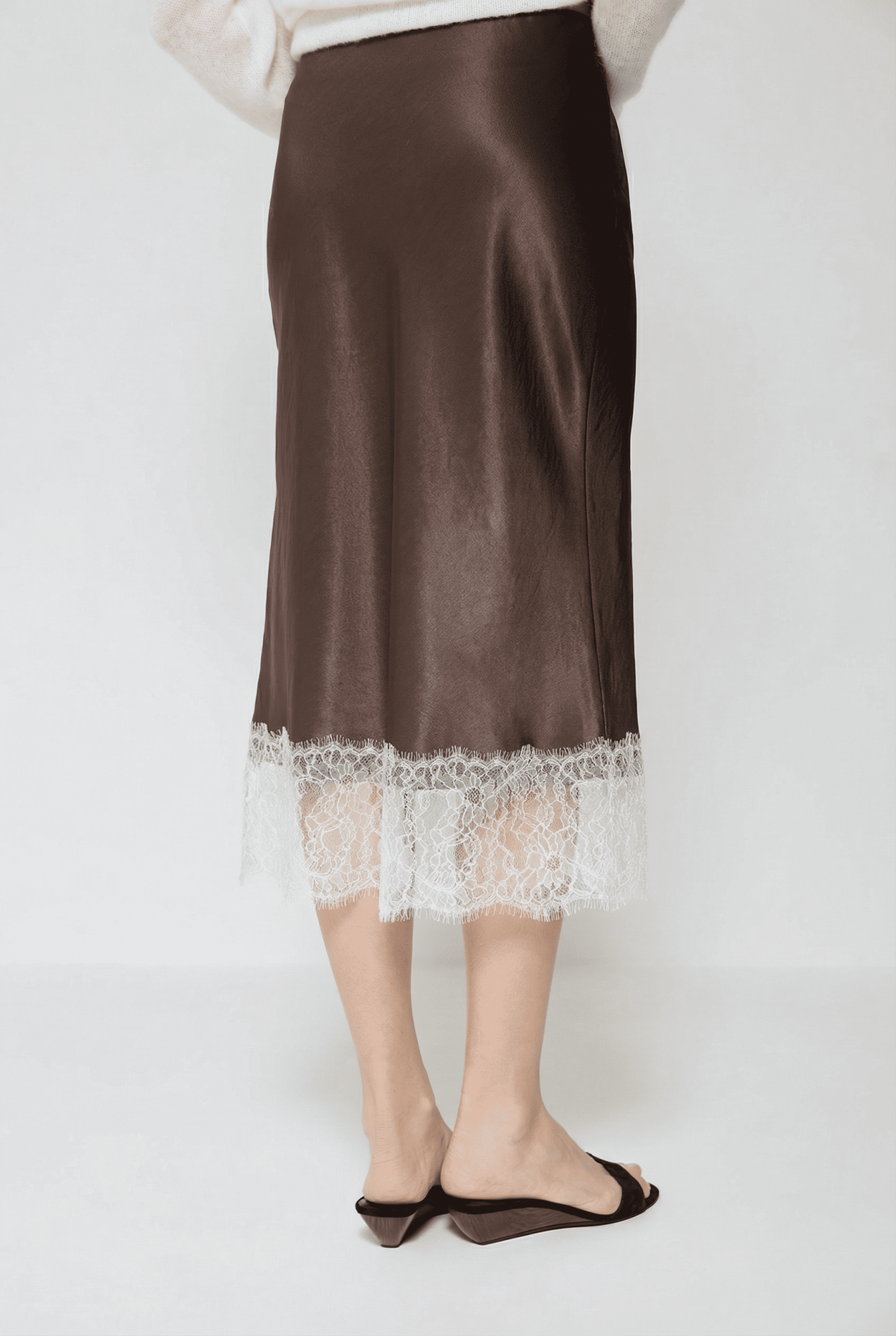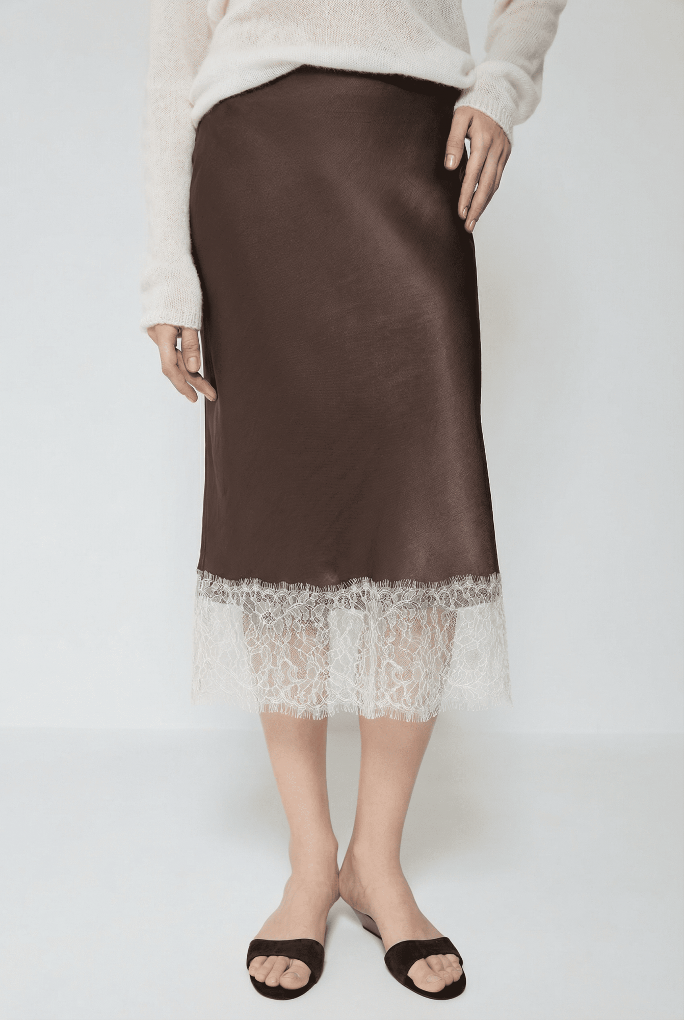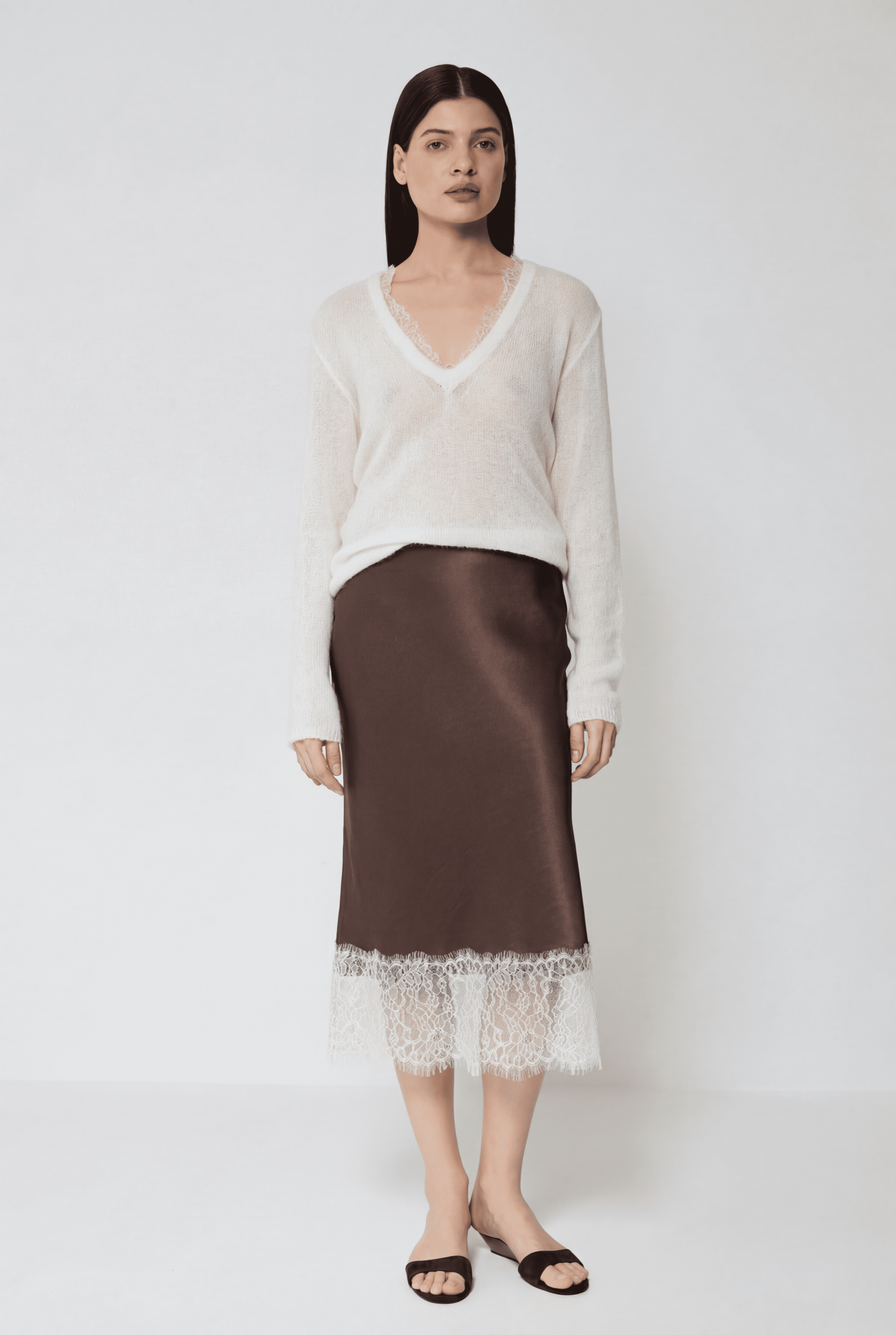 У нее высокая посадка; скрытая широкая резинка на талии, которая не будет давить на кожу. За счет кроя по косой юбка красиво струится в движении и подчеркивает фигуру. Низ декорирован тонким кружевом. В пару к юбке можно подобрать пуловер с аналогичной отделкой и стилизовать комплектом.