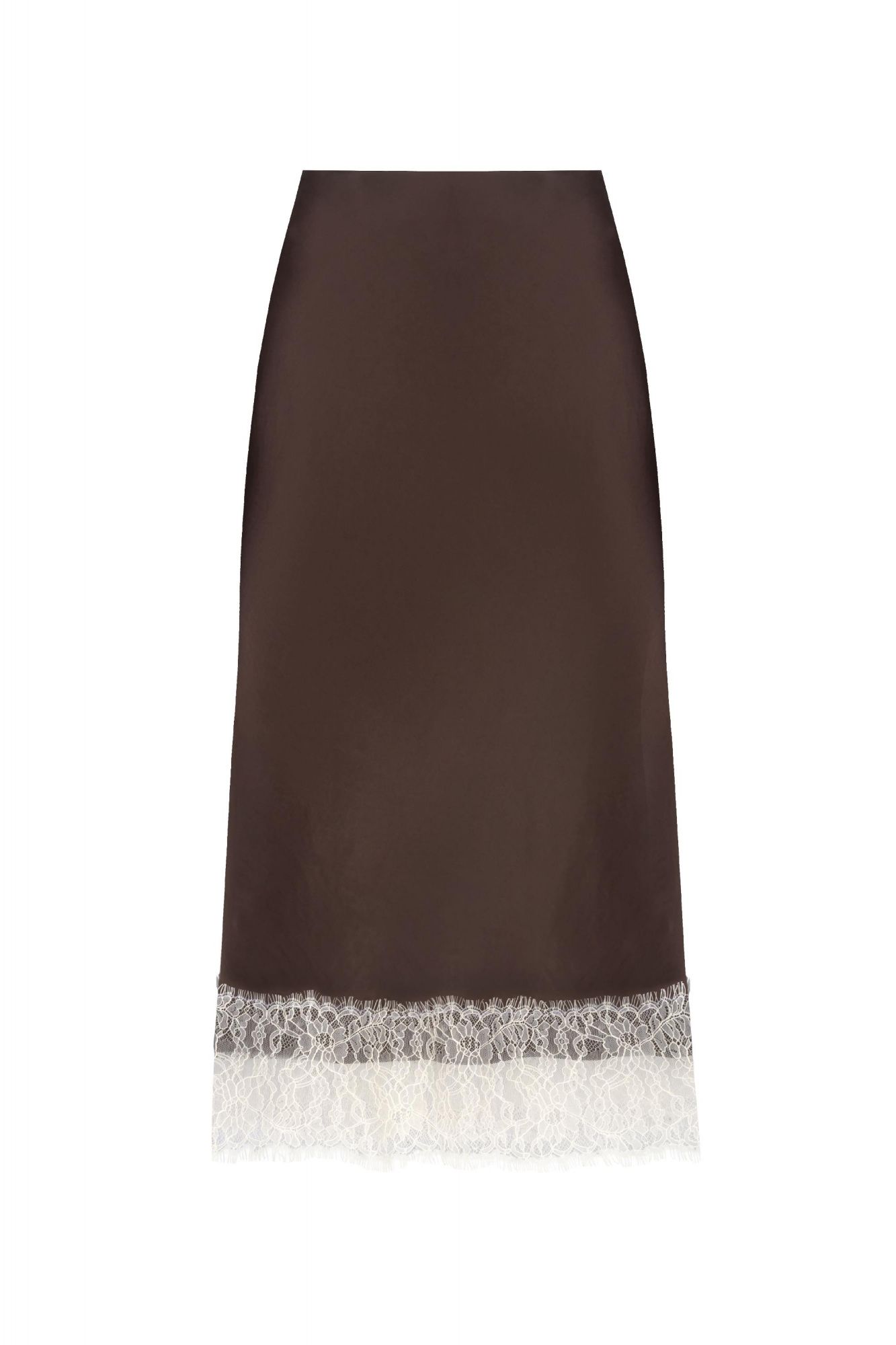 Юбка длины миди сшита из смесовой атласной вискозы.