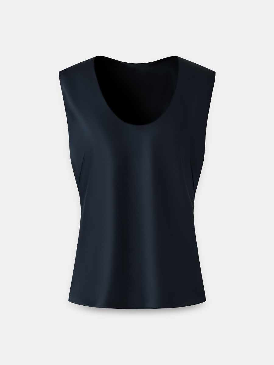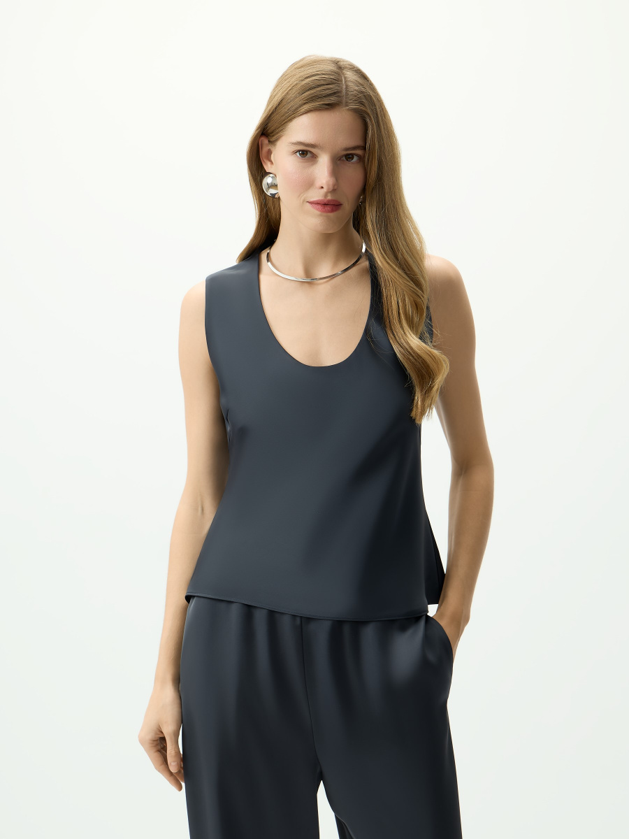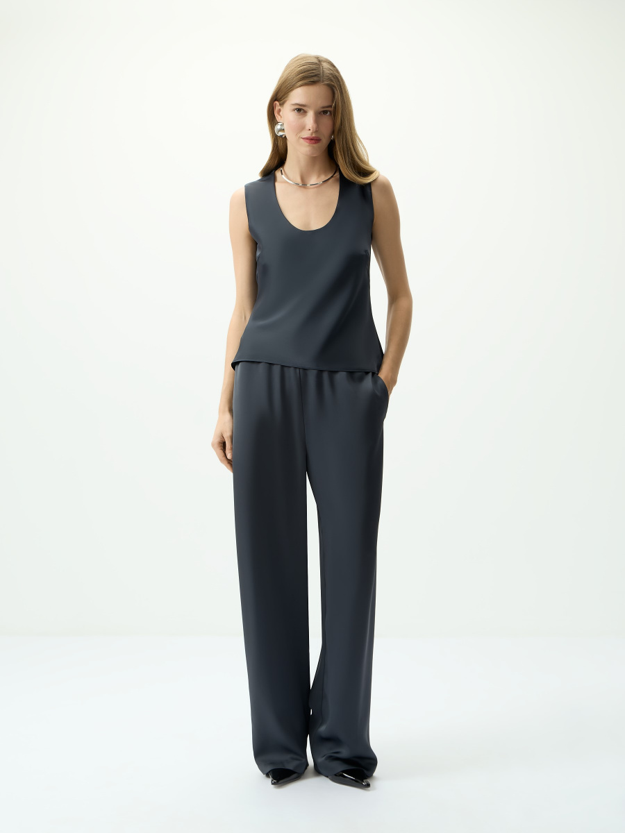 Нарядный топ с U-образным вырезом можно носить соло и под жакет, стилизуя навыпуск с брюками и юбками. Выполнен в свободном прилегании с деликатно подчеркнутой линией талии. Атласный материал с шелковистым блеском не просвечивает и не мнется.