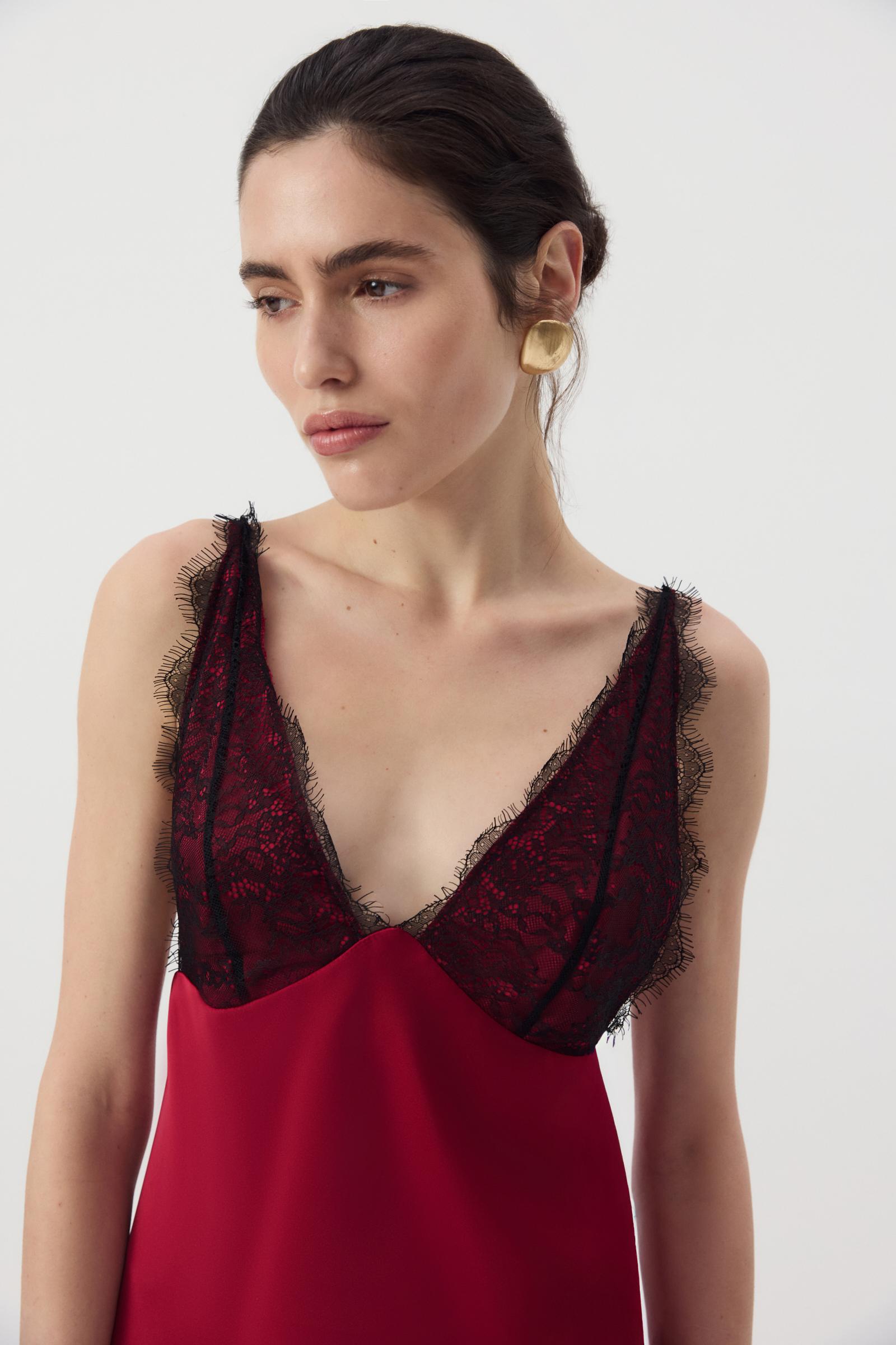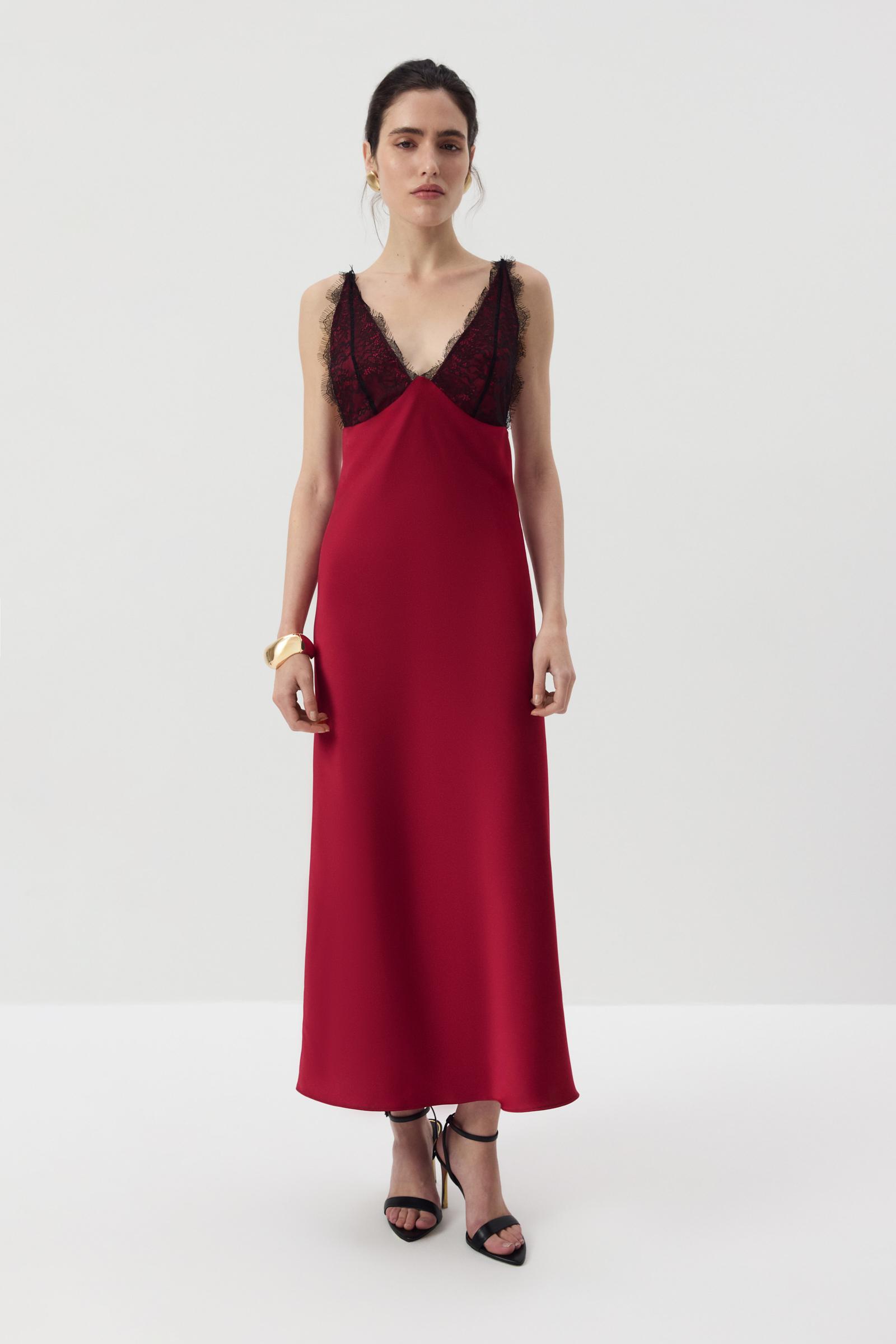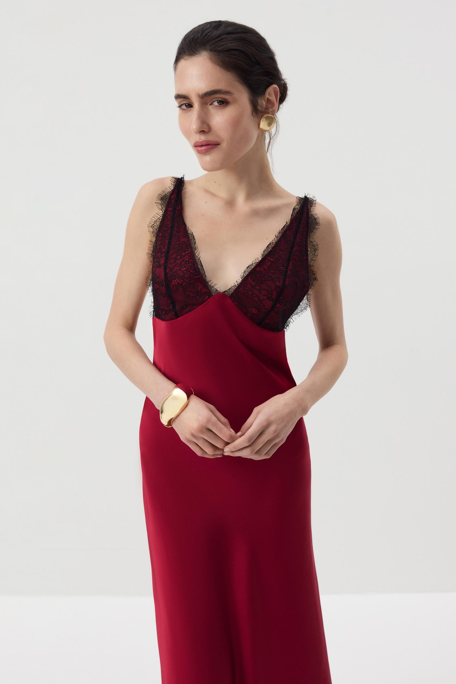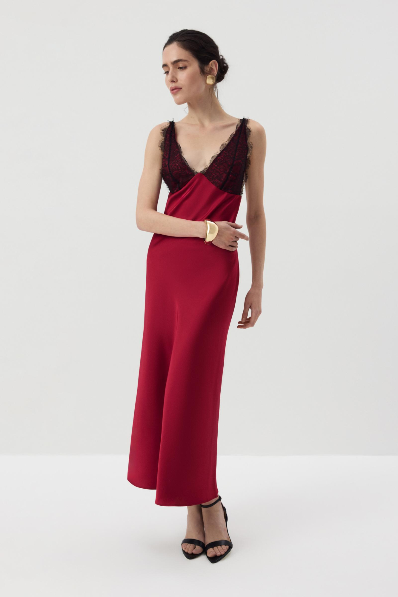 Платье из сатина длины миди. Модель сшита из струящейся сатиновой ткани с деликатным блеском. Благодаря крою по косой платье красиво струится в движении, естественным образом облегая фигуру. Отделка топа выполнена кружевом, что деликатно подчеркивает декольте. Платье на бретелях с регуляторами, что позволяет добиться более индивидуальной посадки.