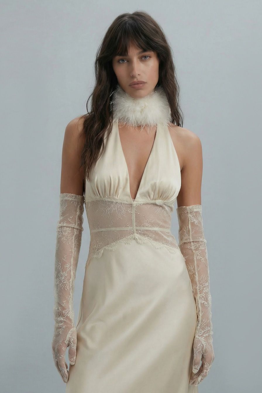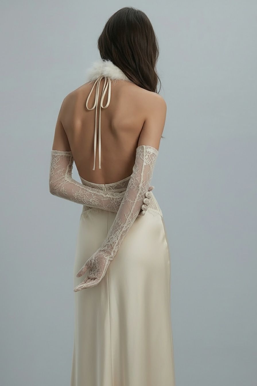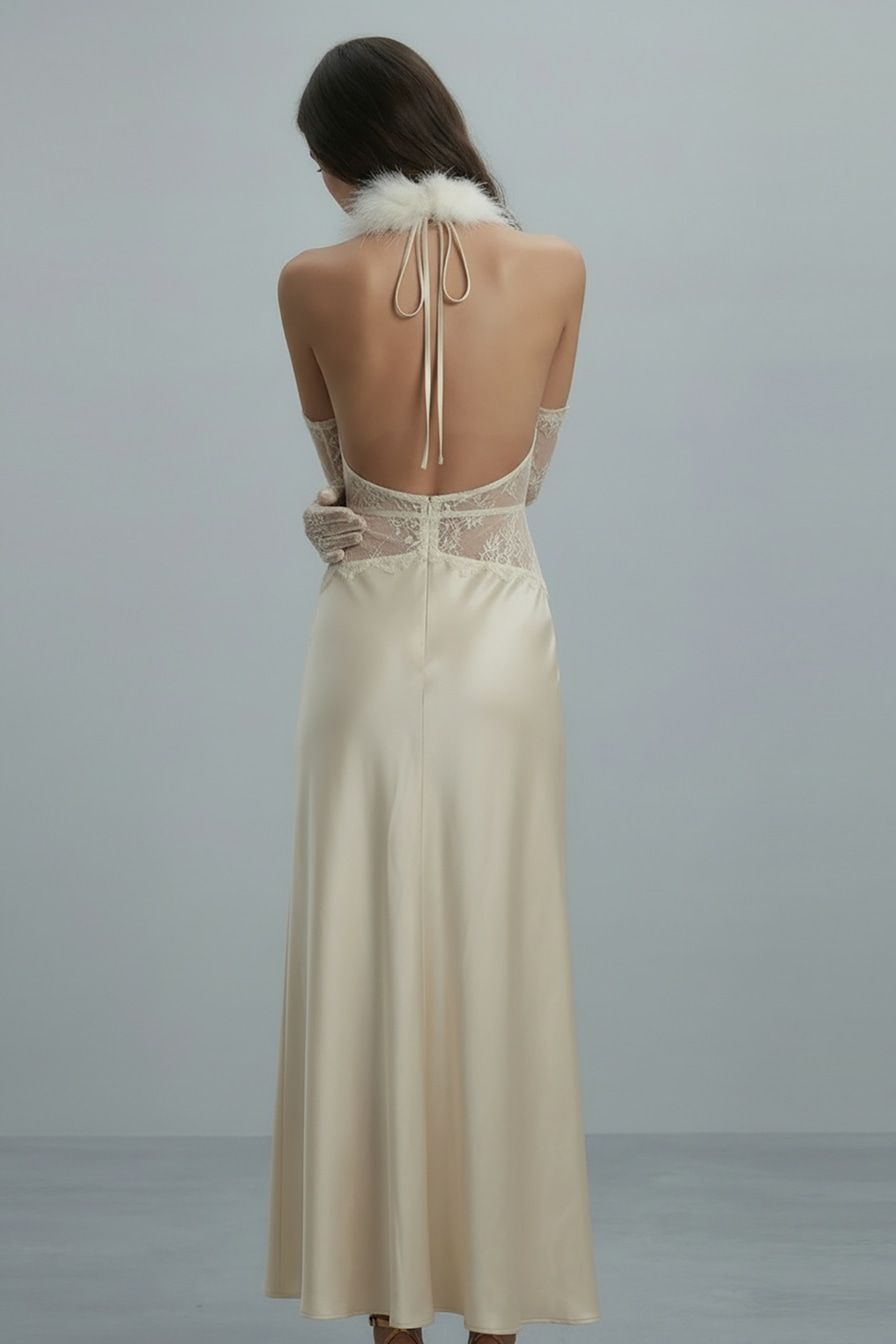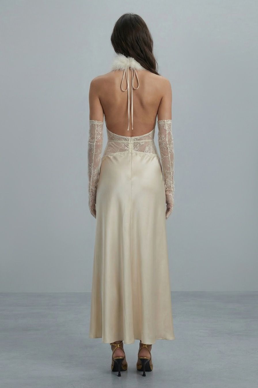 Атласное платье-макси в бельевом стиле – модель молочного цвета с открытой спиной. Платье декорировано вставкой с кружевной отделкой.