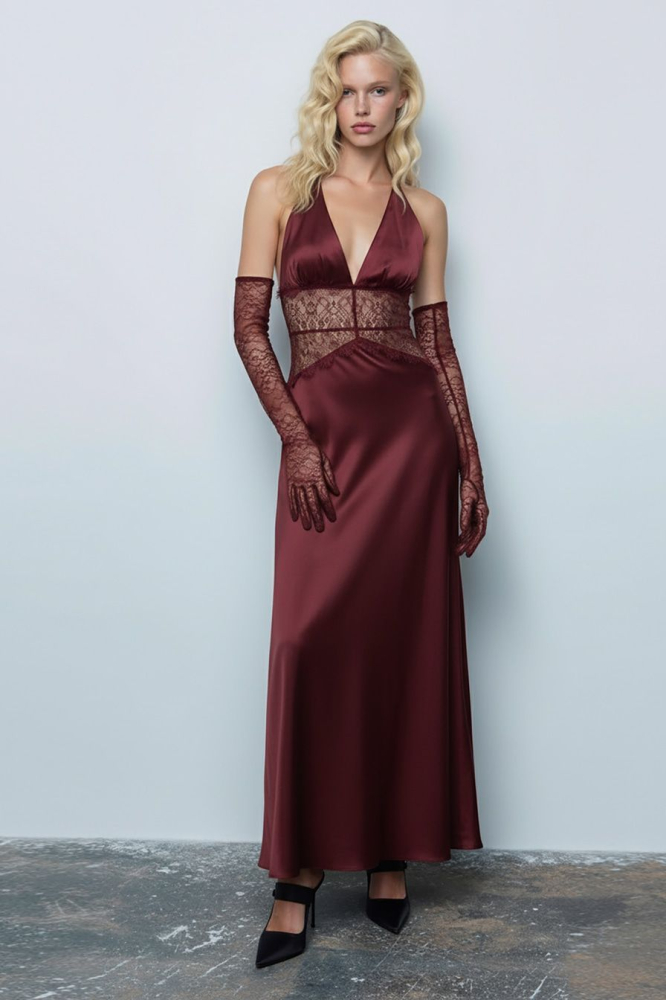 Атласное платье-макси в бельевом стиле – модель бордового цвета с открытой спиной. Платье декорировано вставкой с кружевной отделкой.