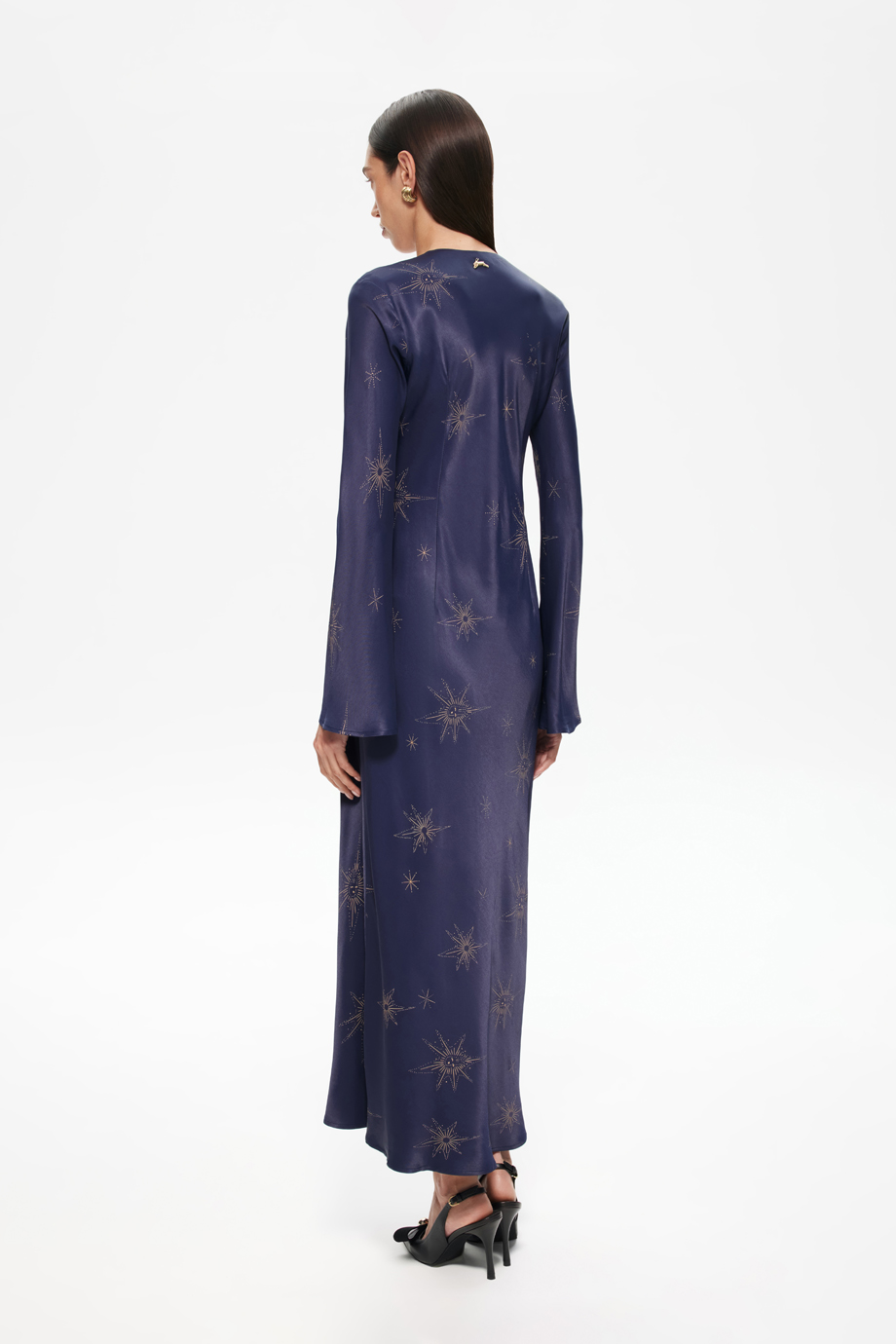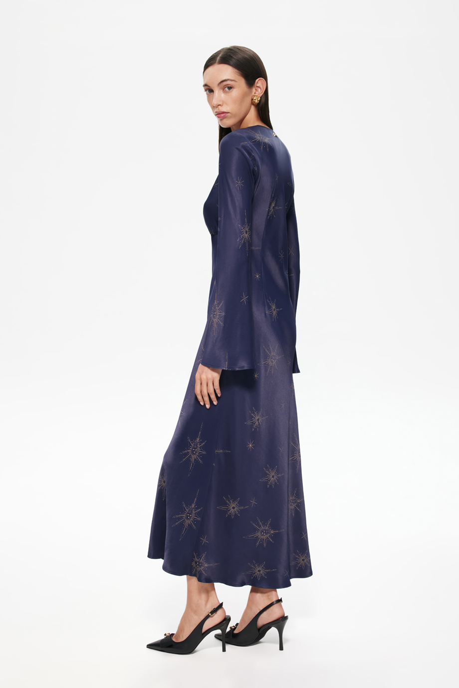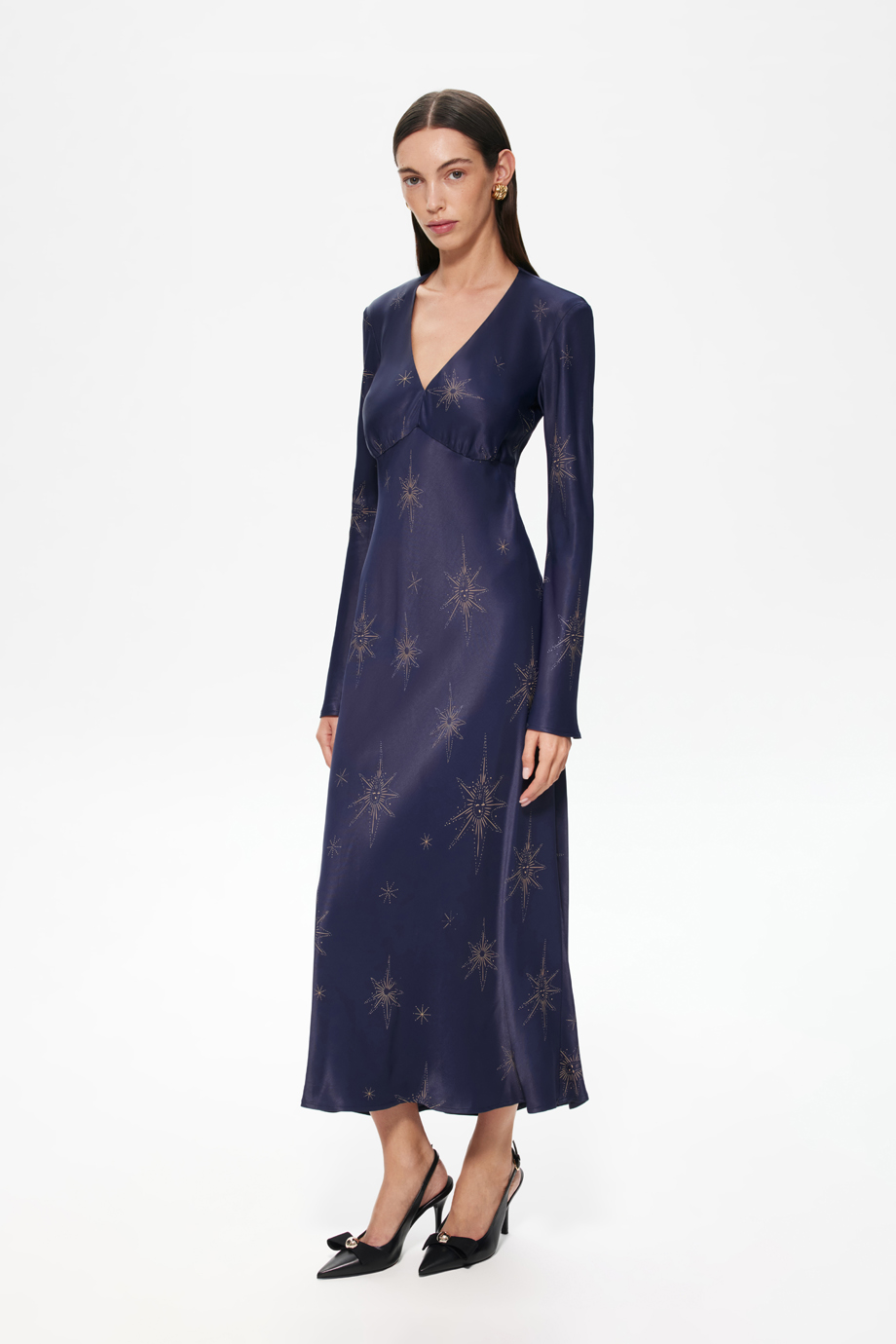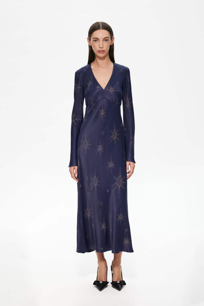 Элегантное платье миди с принтом — идеальный выбор для вечеринок и романтичных свиданий. Глубокий V-вырез и приталенный силуэт подчеркивают фигуру, а длинные рукава добавляют образу нотку утончённости.