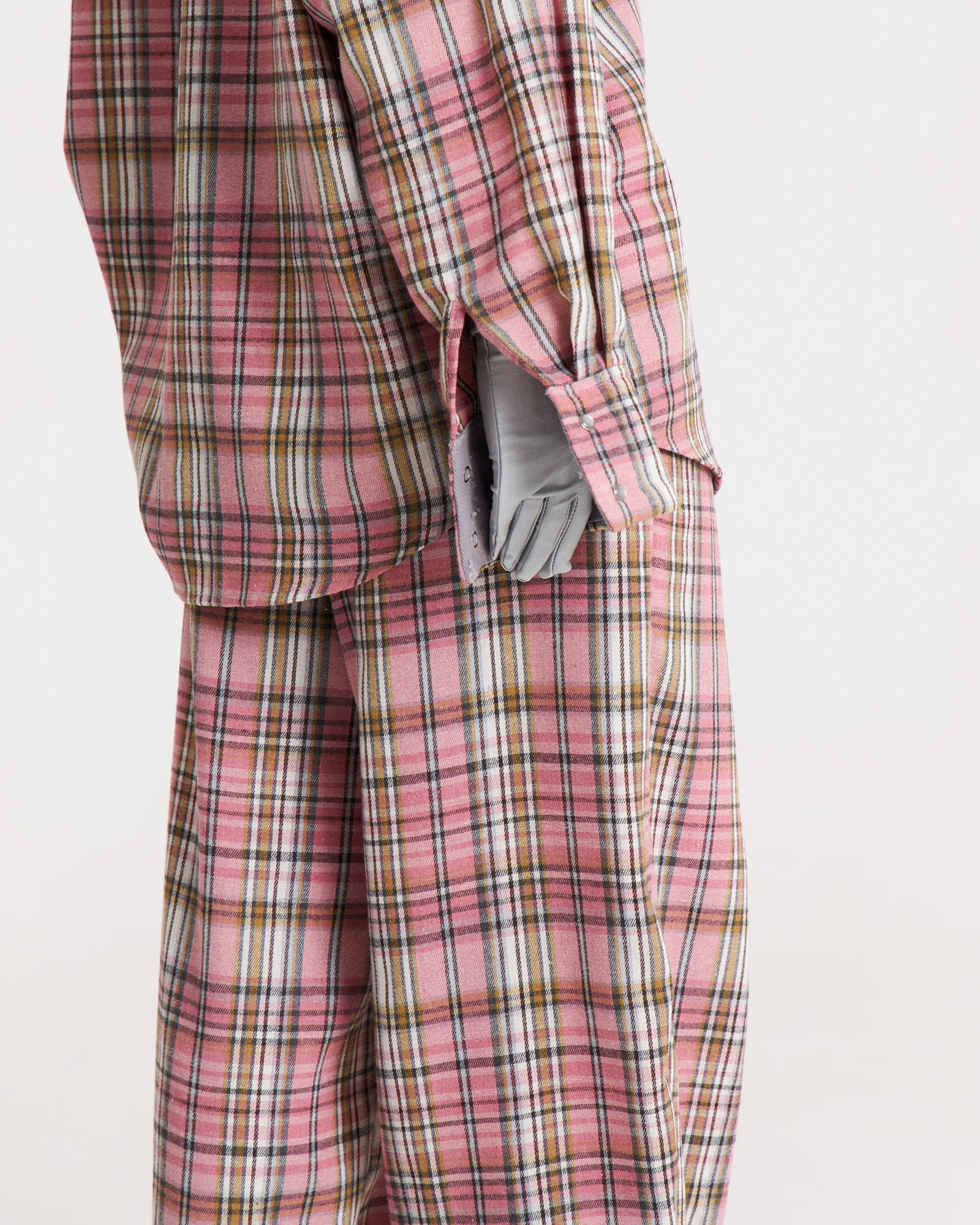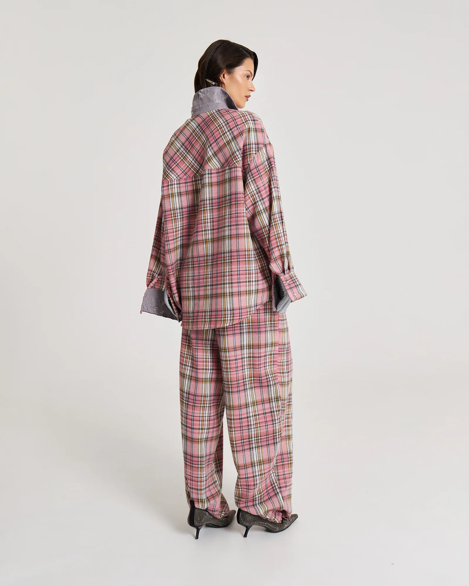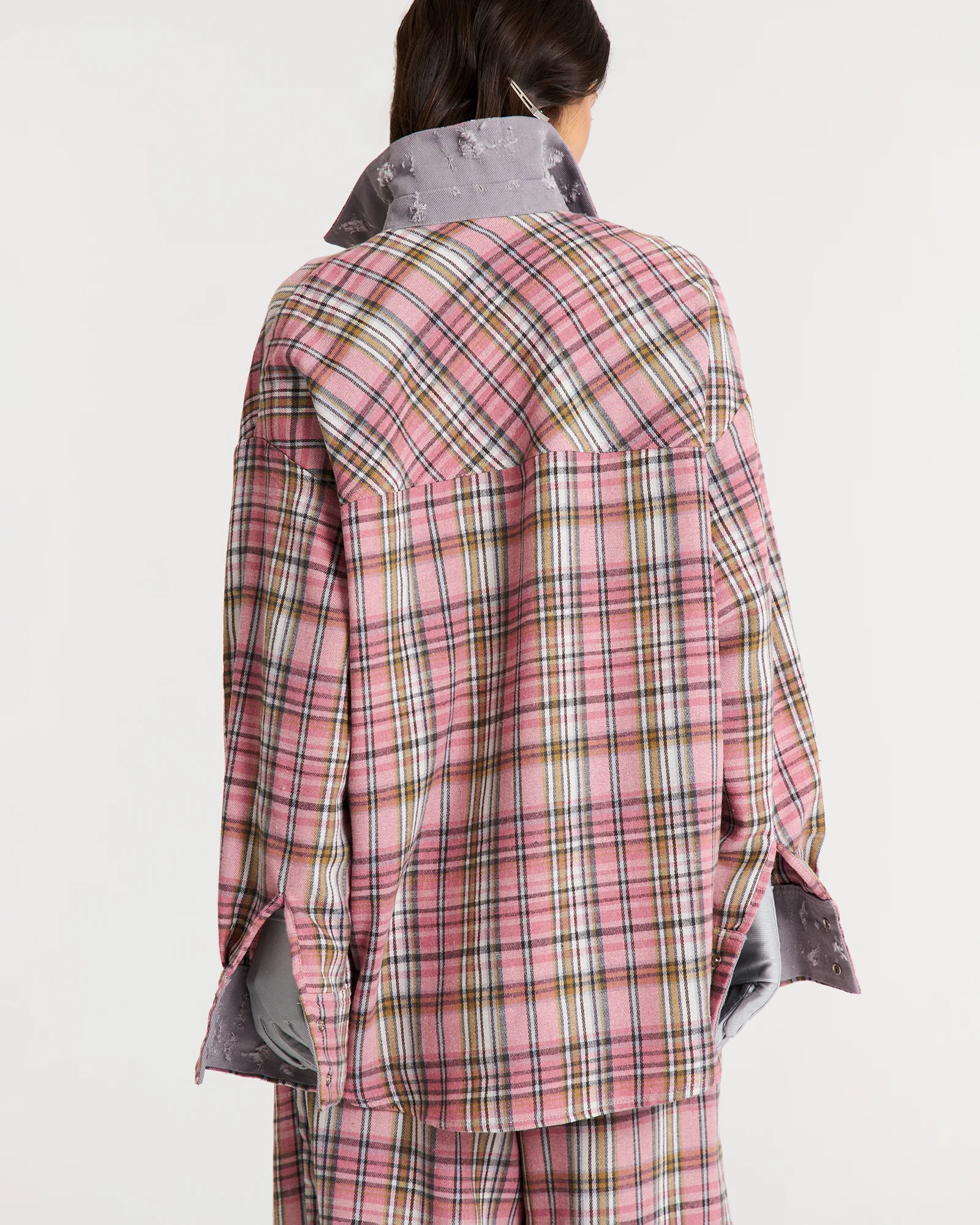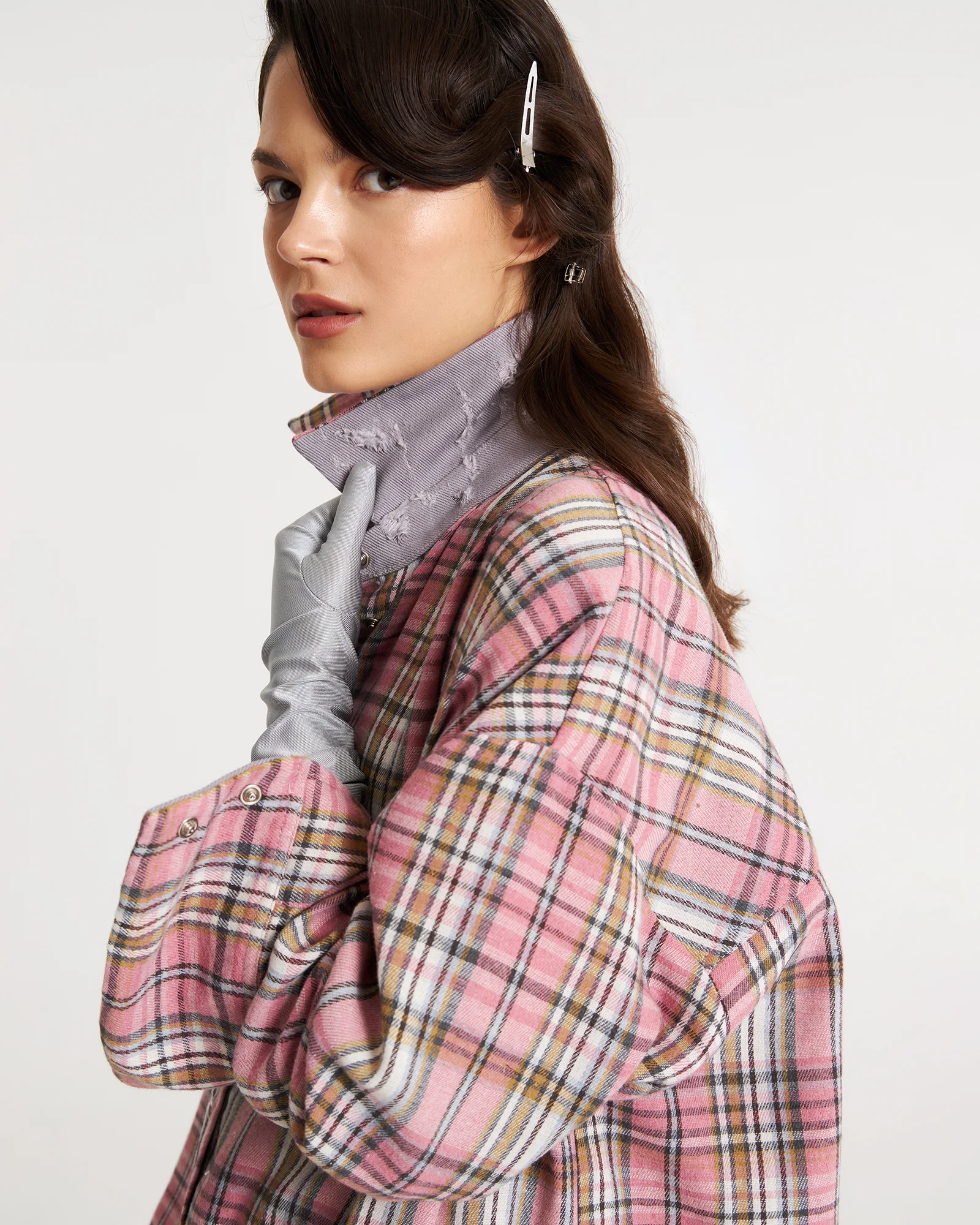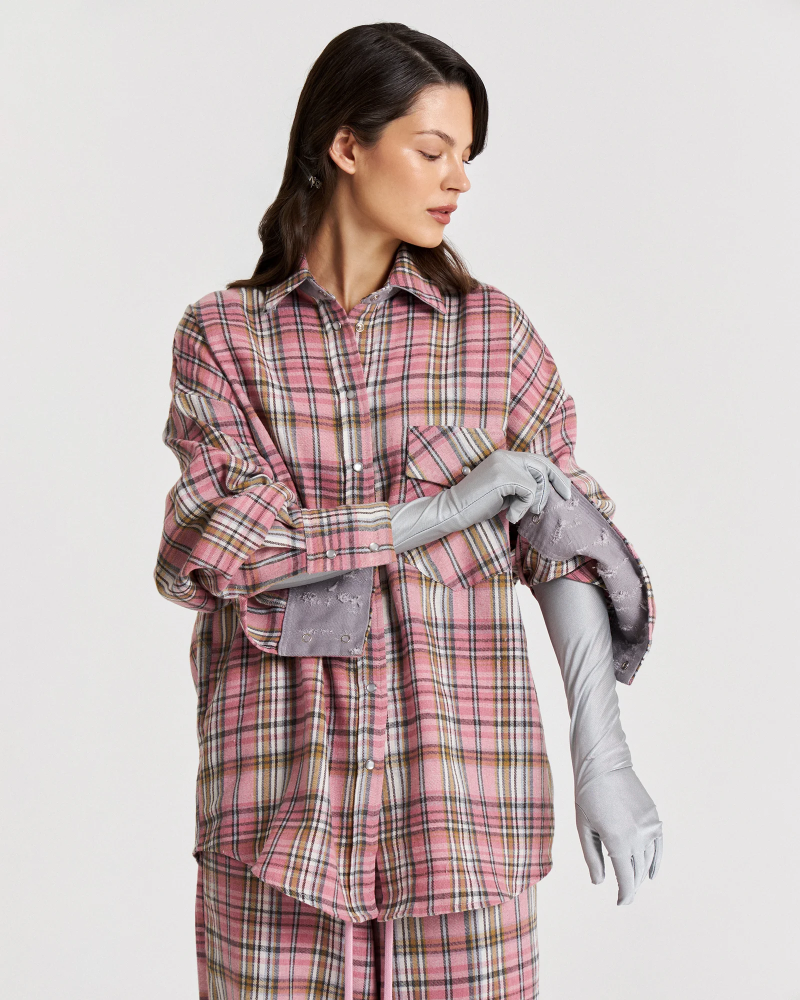 Свободная рубашка в клетку с маленькими секретами: под воротом и на манжетах скрыт винтажный деним – деталь, которую можно либо скрыть, либо эффектно показать.