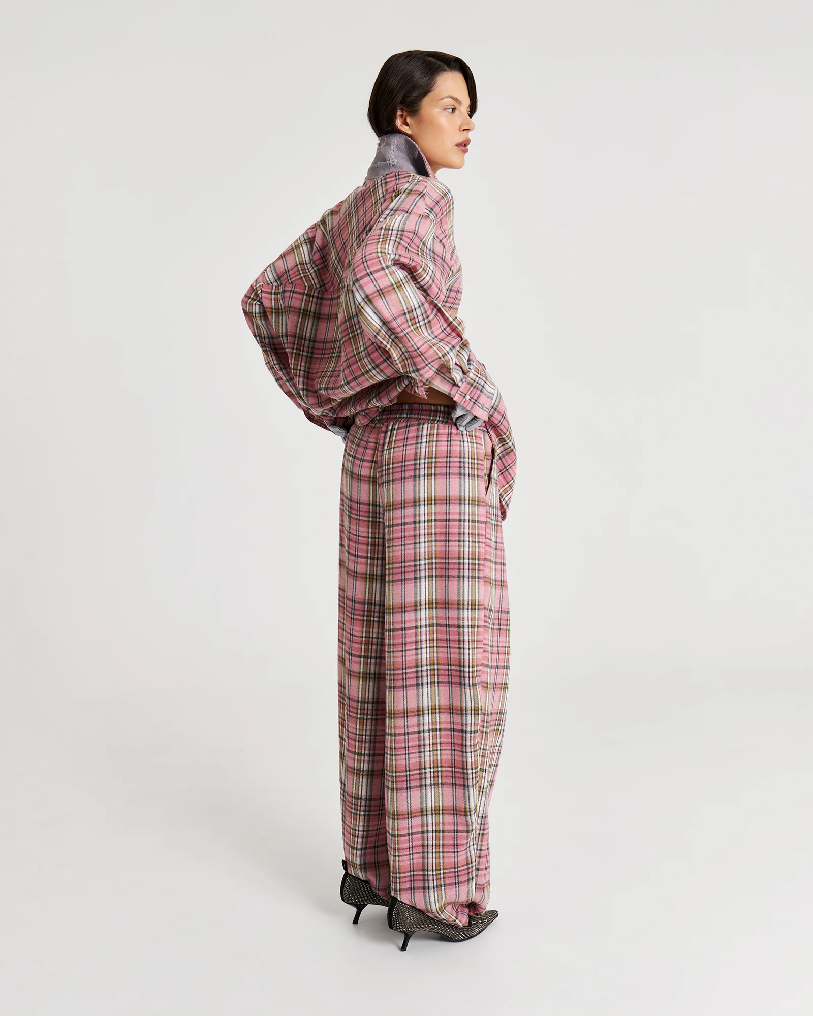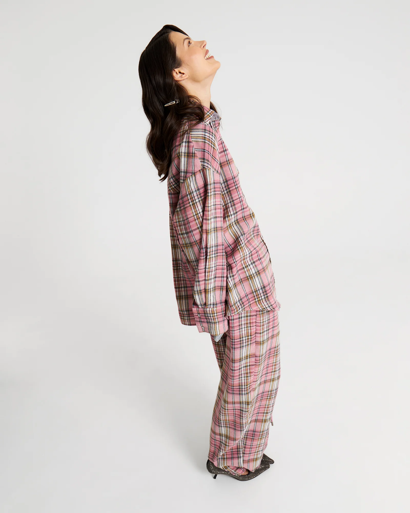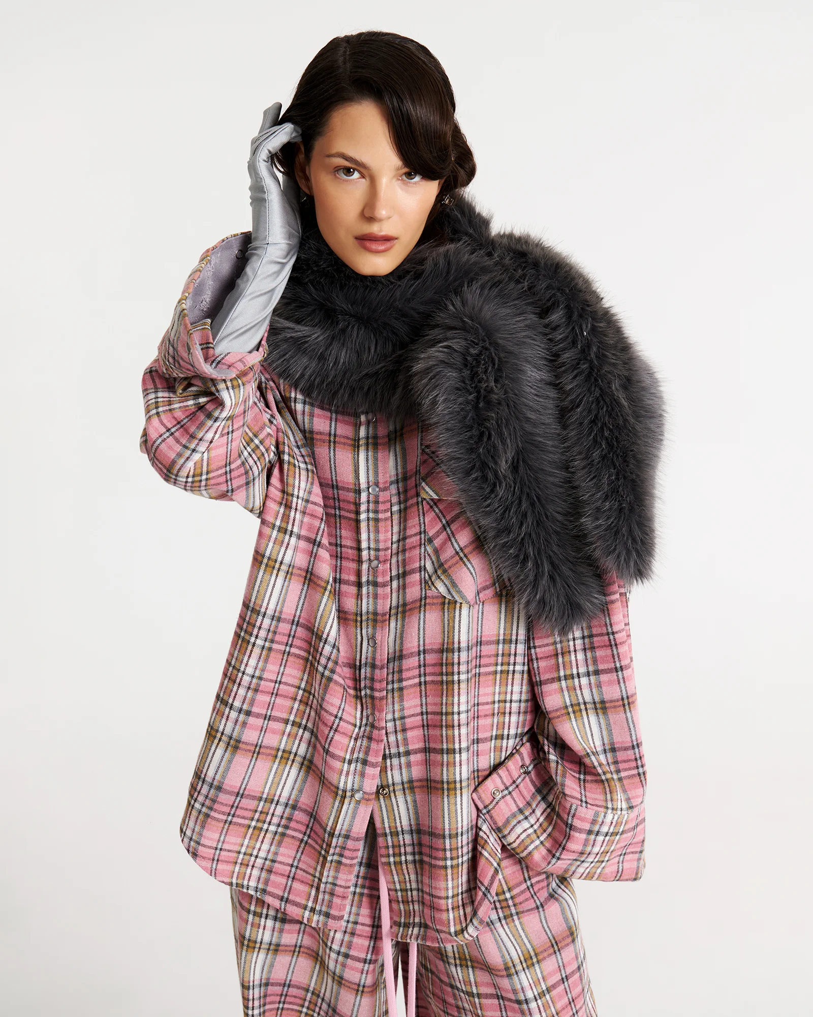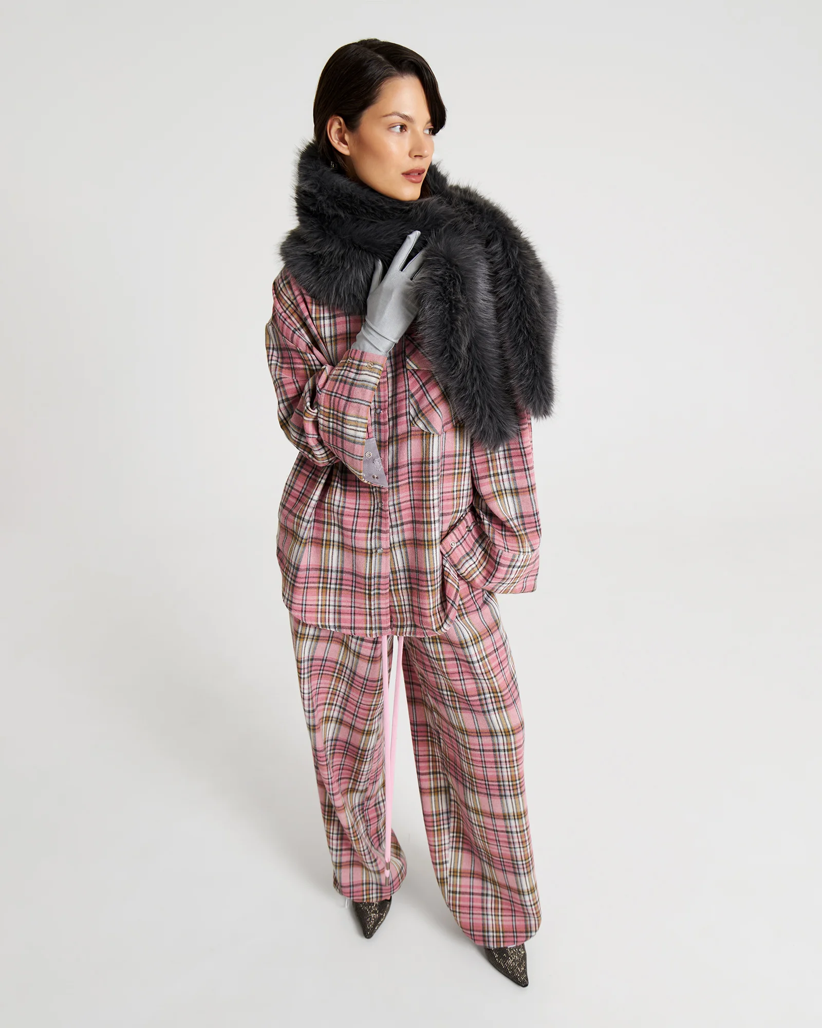 Свободная рубашка в клетку с маленькими секретами: под воротом и на манжетах скрыт винтажный деним – деталь, которую можно либо скрыть, либо эффектно показать.