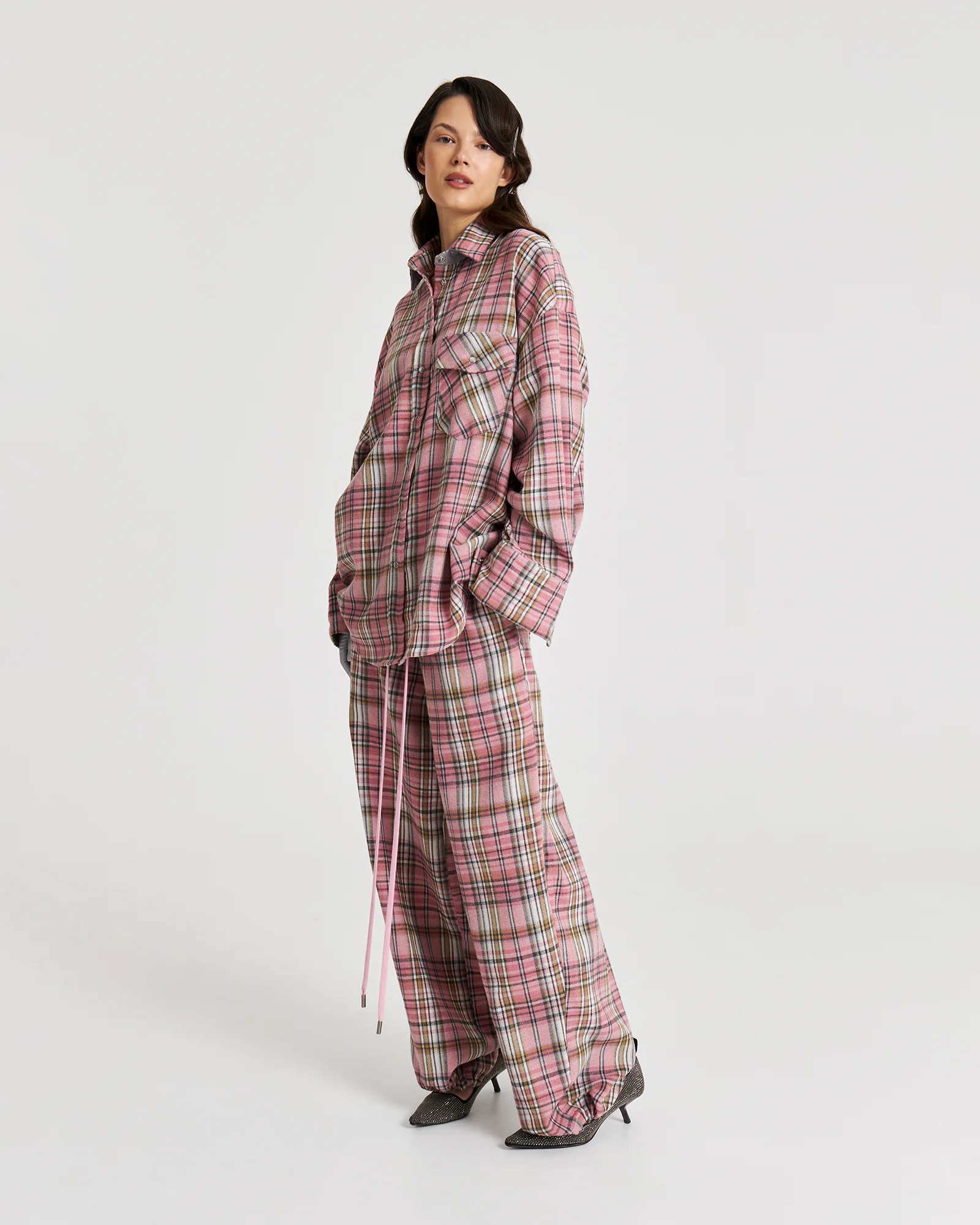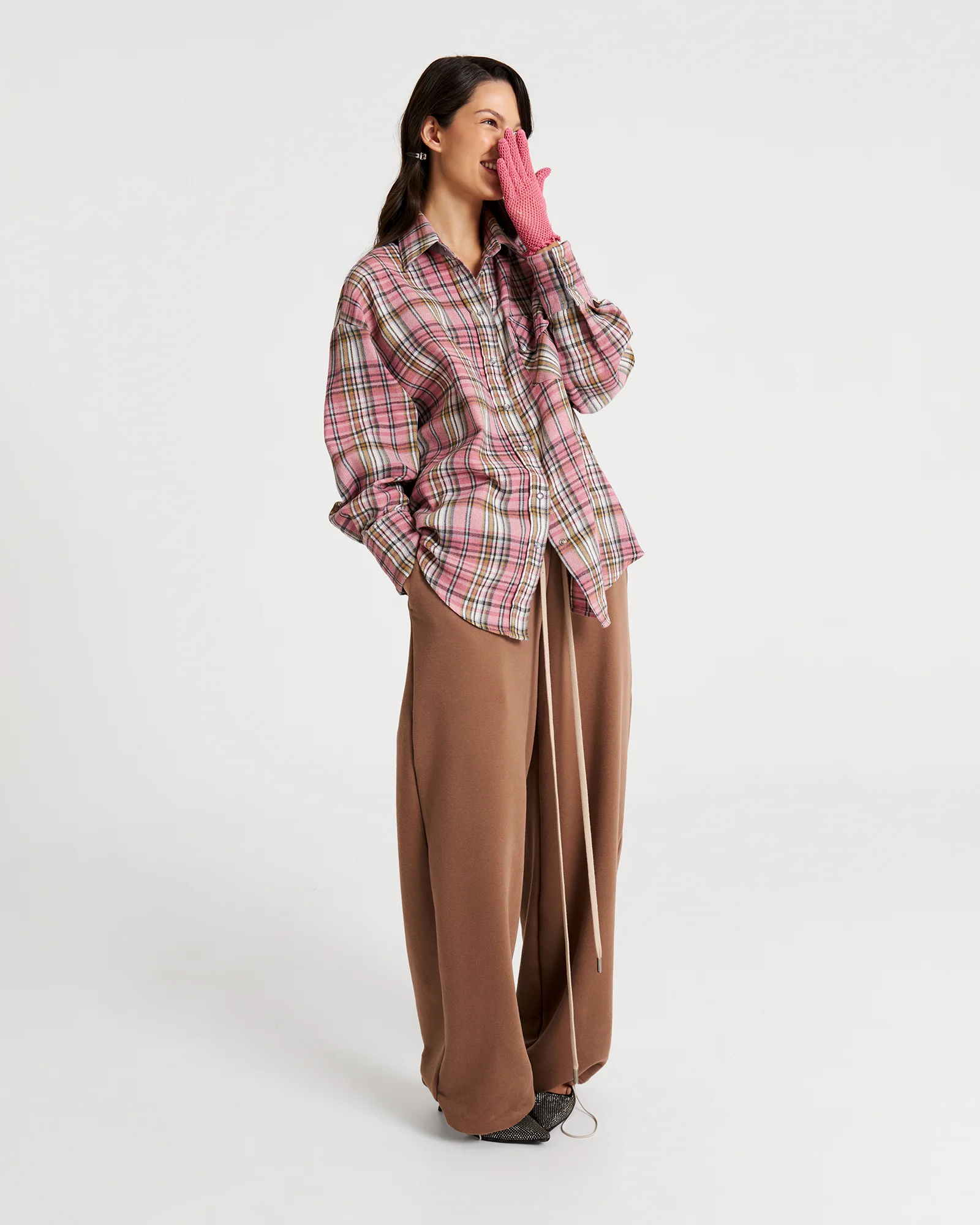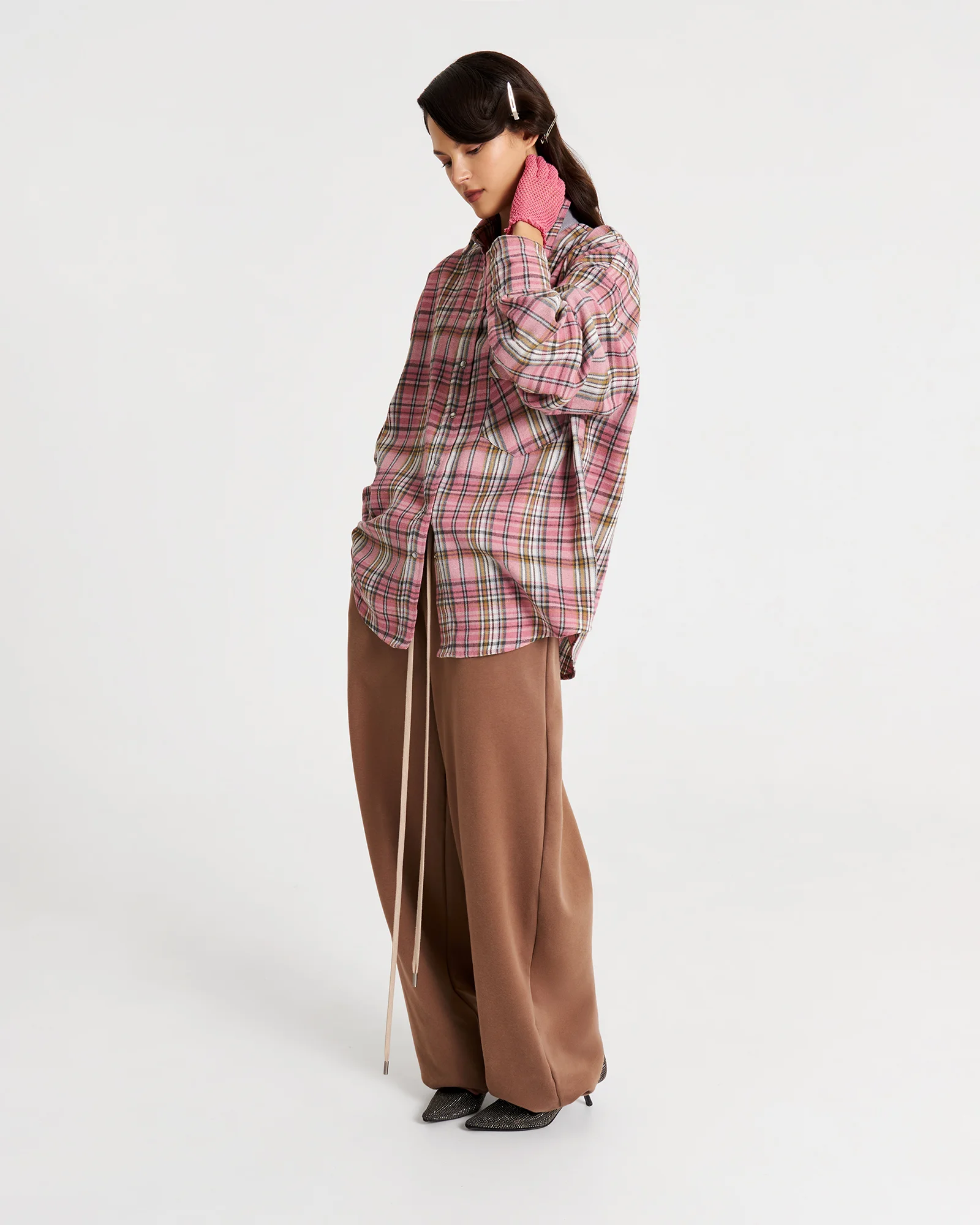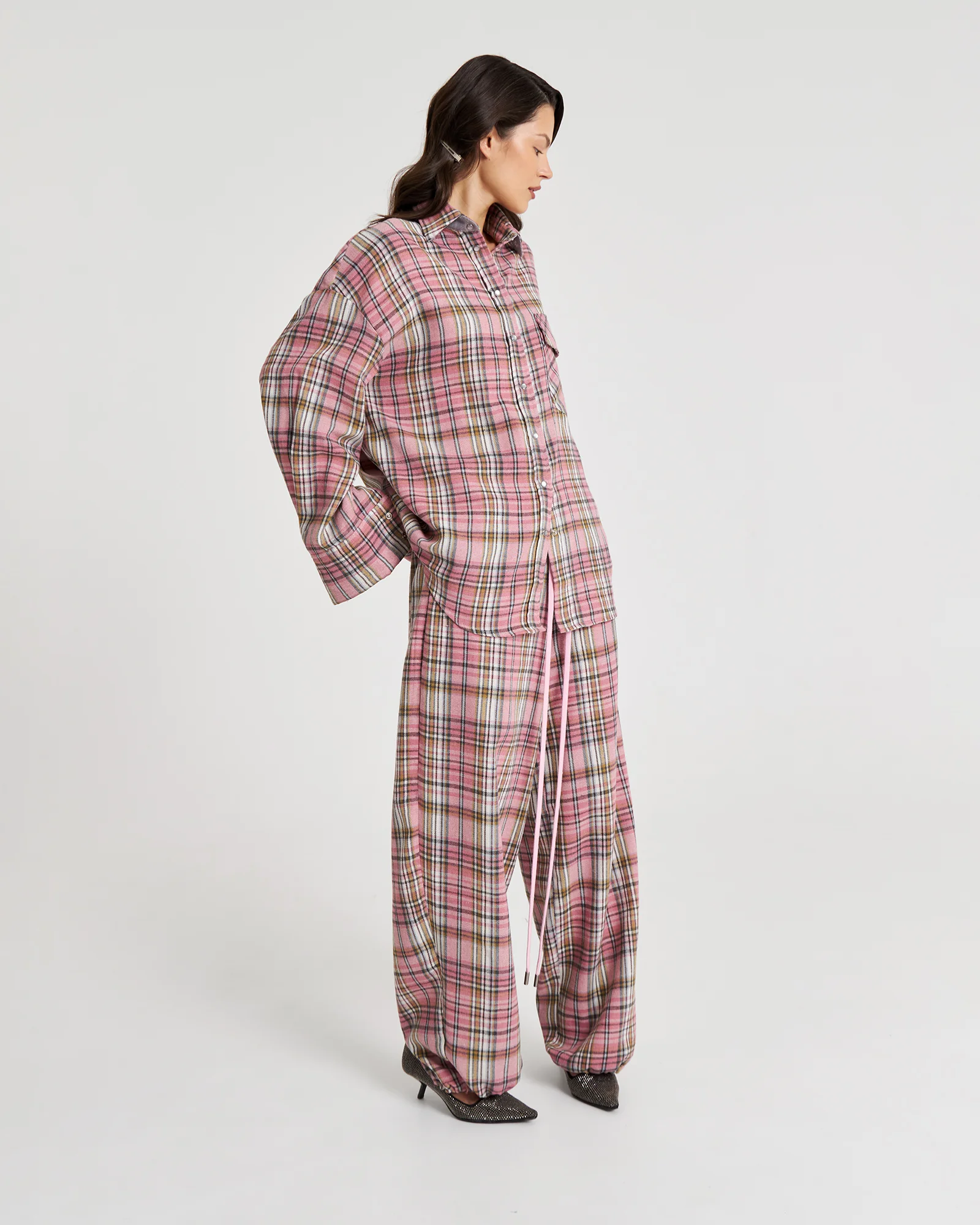 Свободная рубашка в клетку с маленькими секретами: под воротом и на манжетах скрыт винтажный деним – деталь, которую можно либо скрыть, либо эффектно показать.