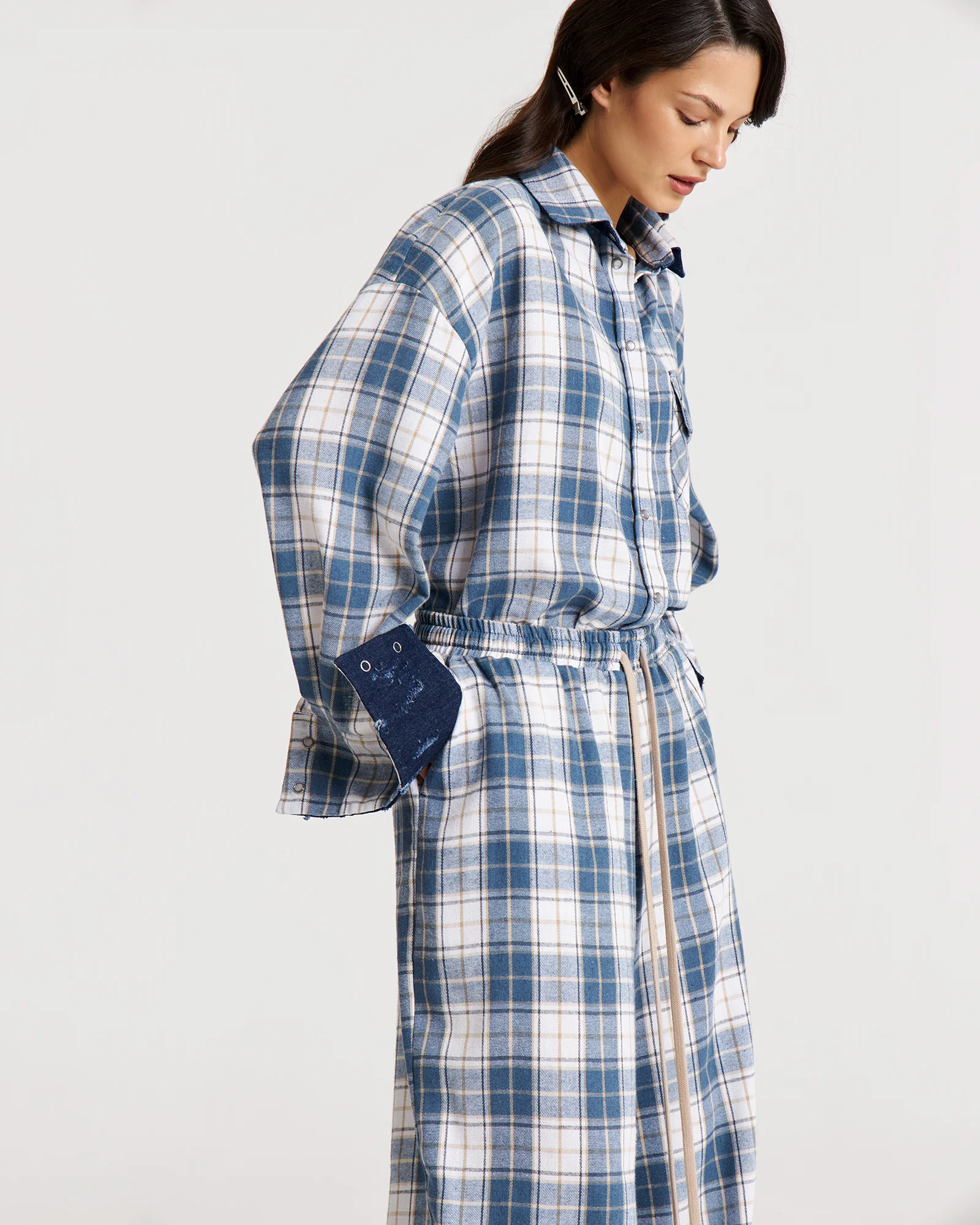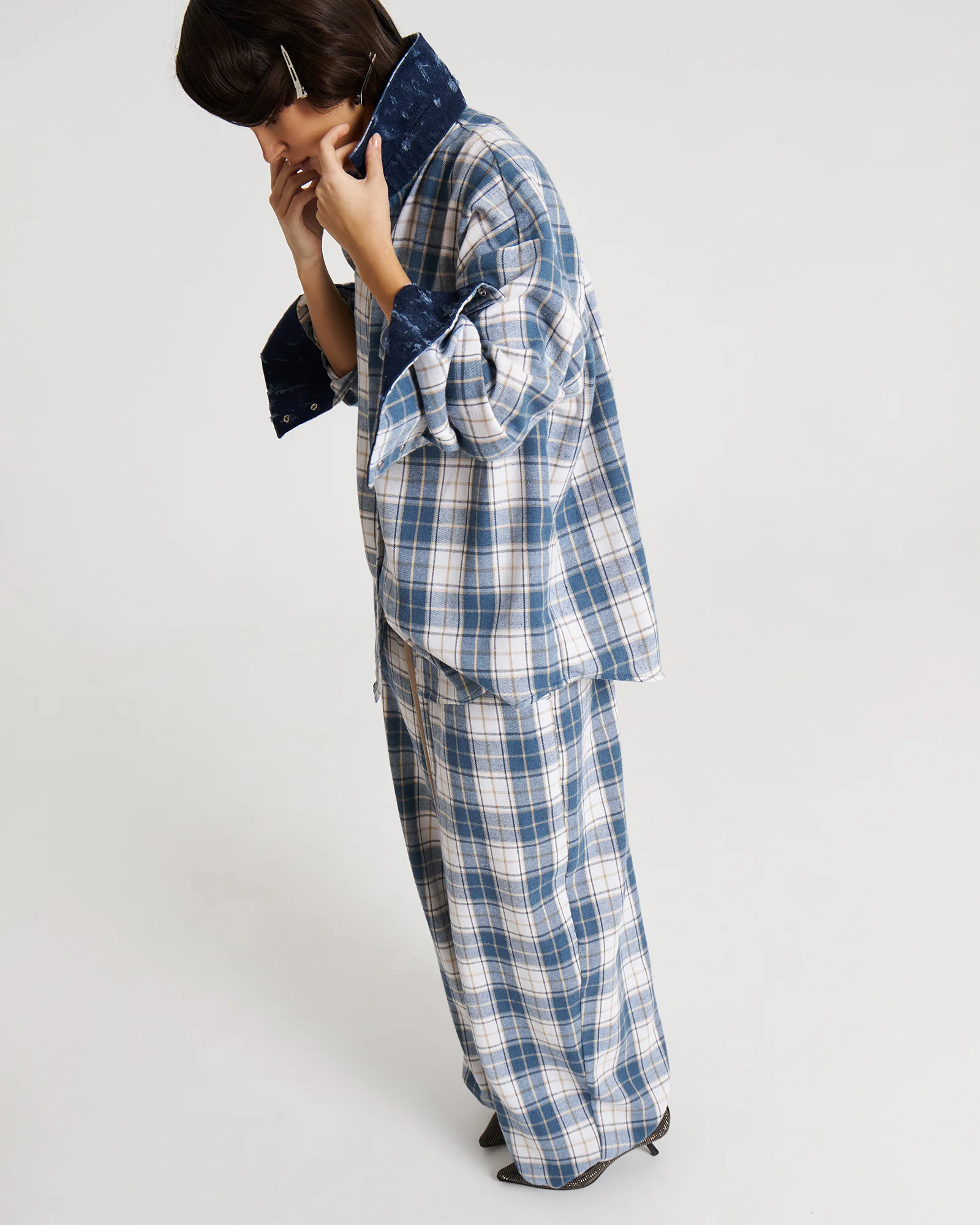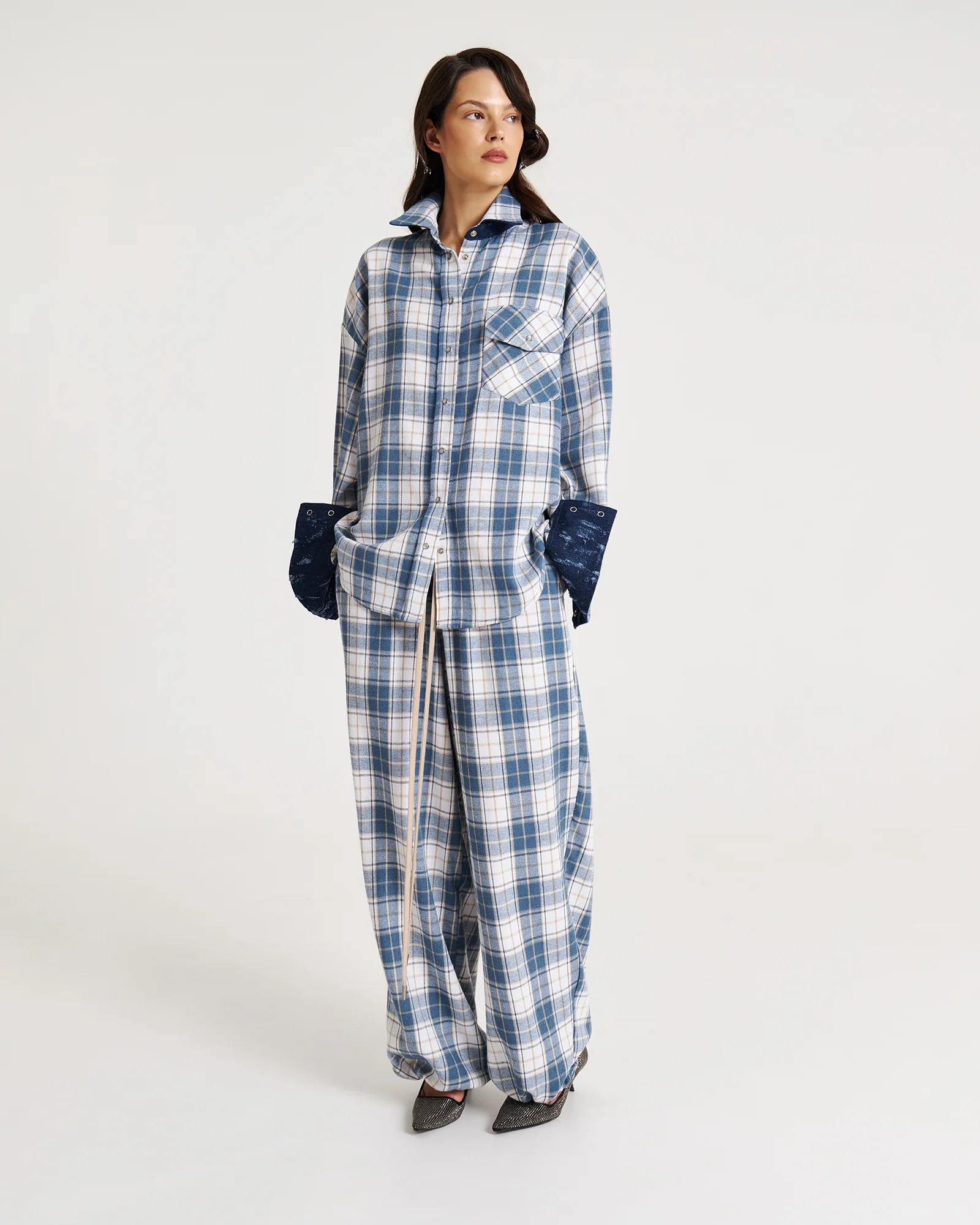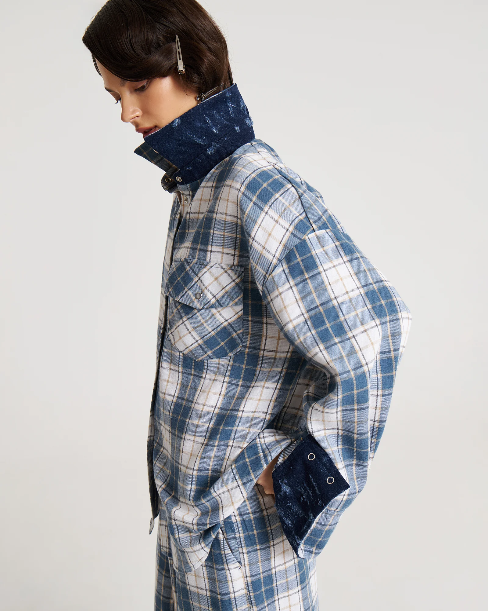 Свободная рубашка в клетку с маленькими секретами: под воротом и на манжетах скрыт винтажный деним – деталь, которую можно либо скрыть, либо эффектно показать.