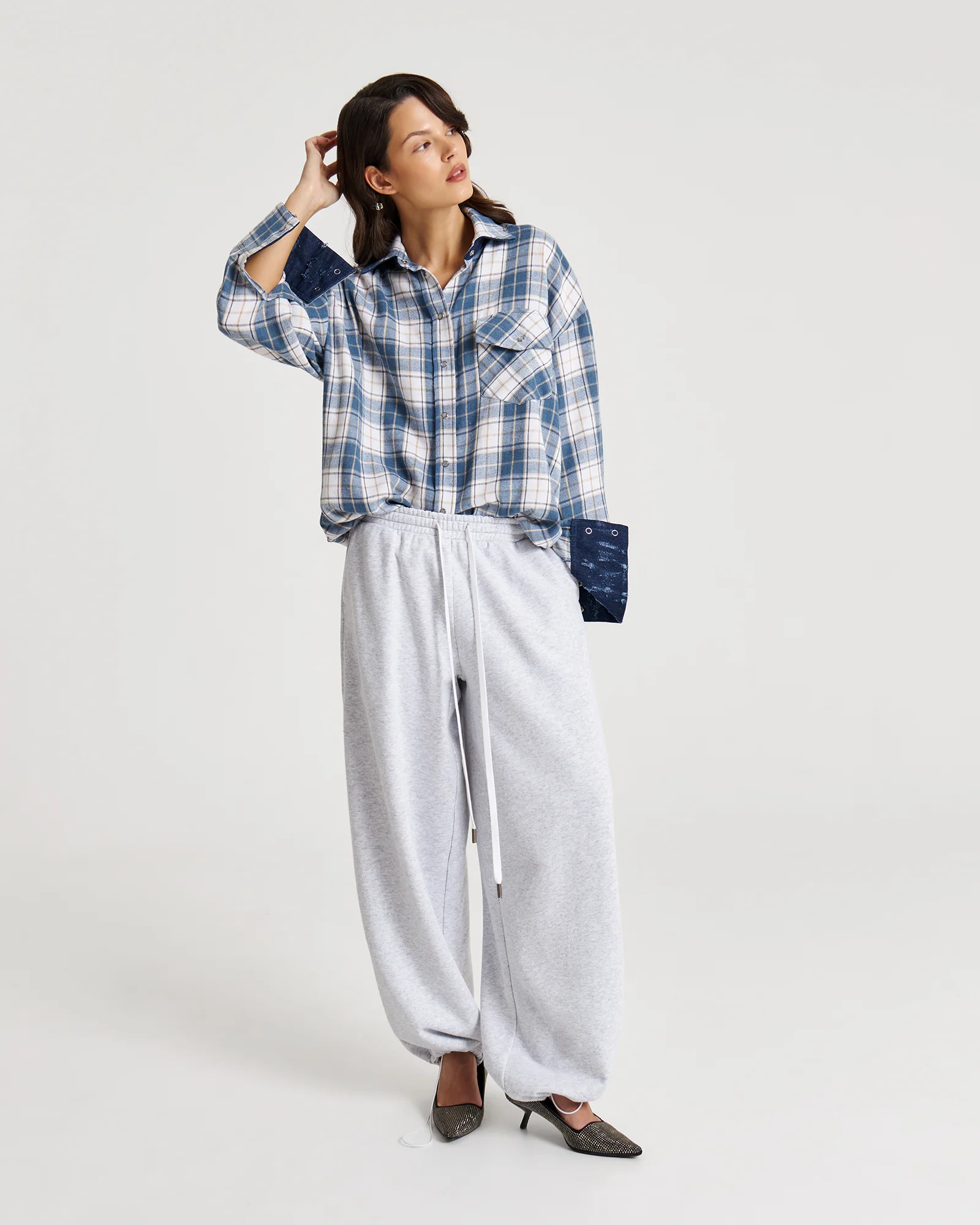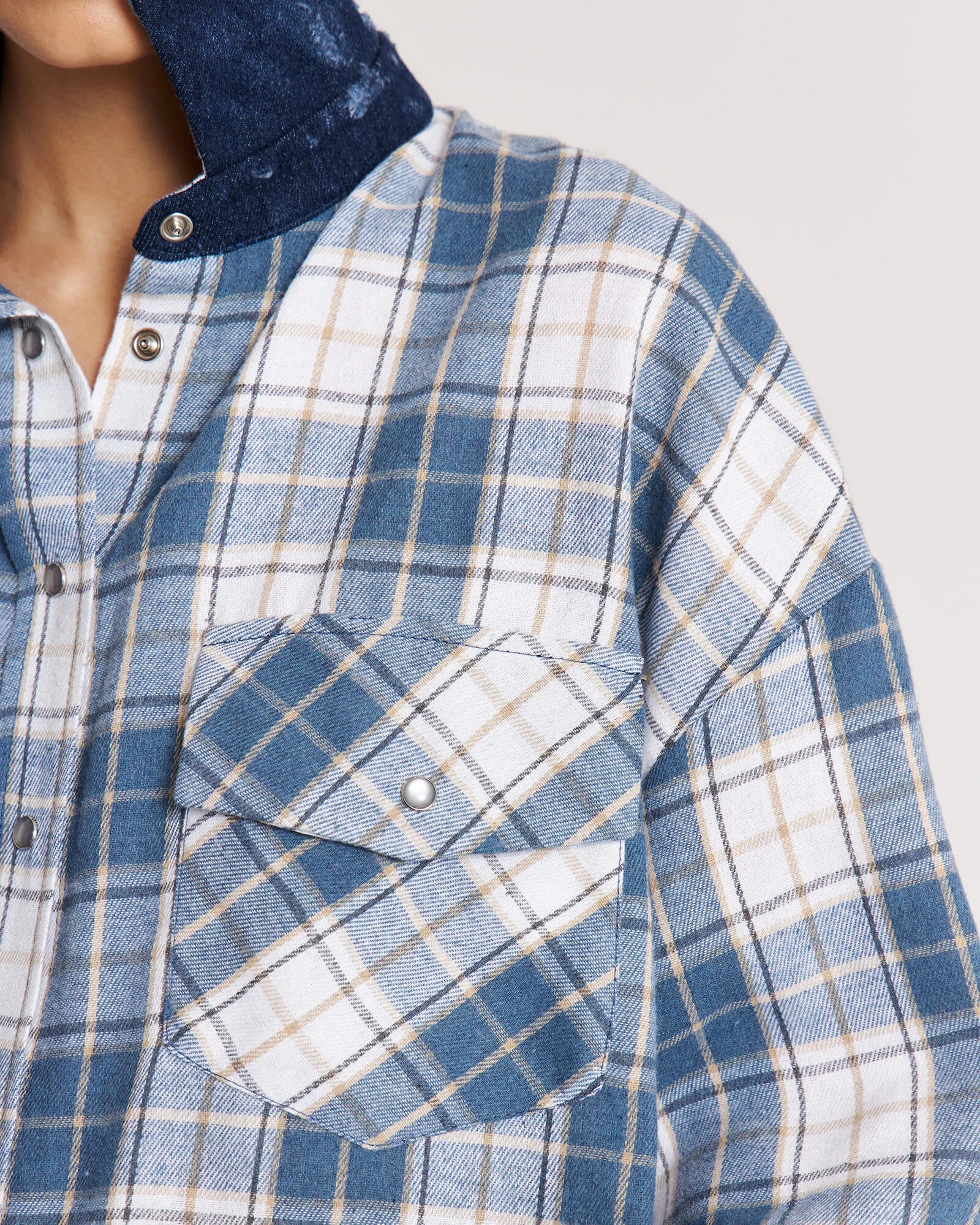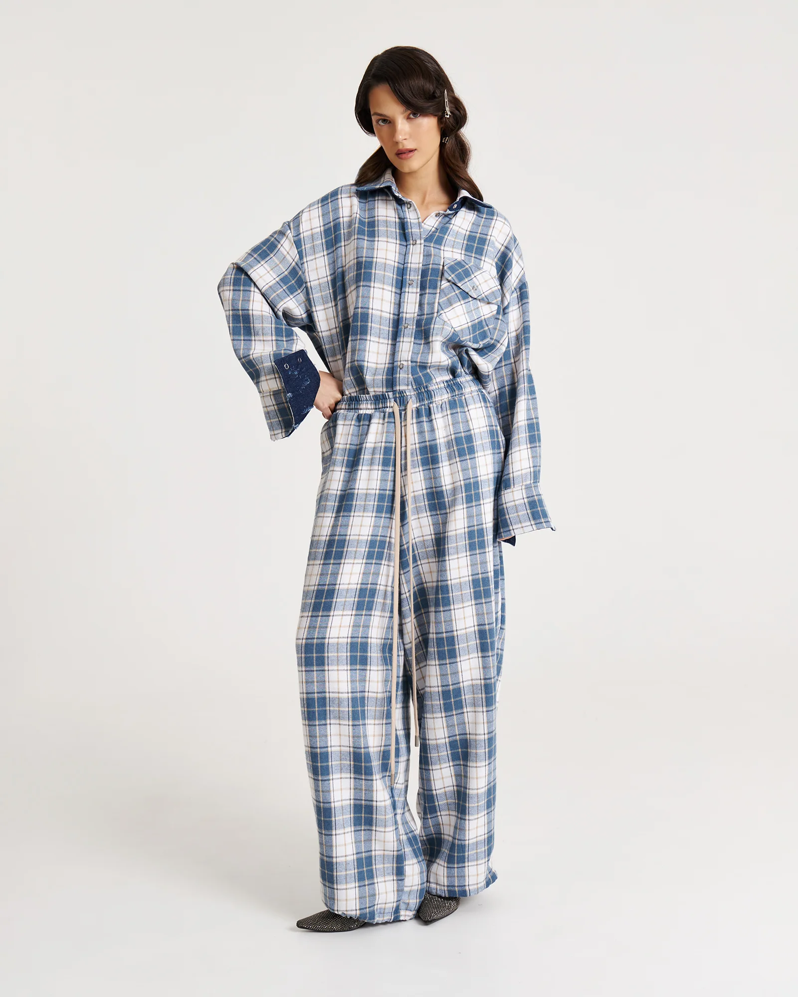Свободная рубашка в клетку с маленькими секретами: под воротом и на манжетах скрыт винтажный деним – деталь, которую можно либо скрыть, либо эффектно показать.