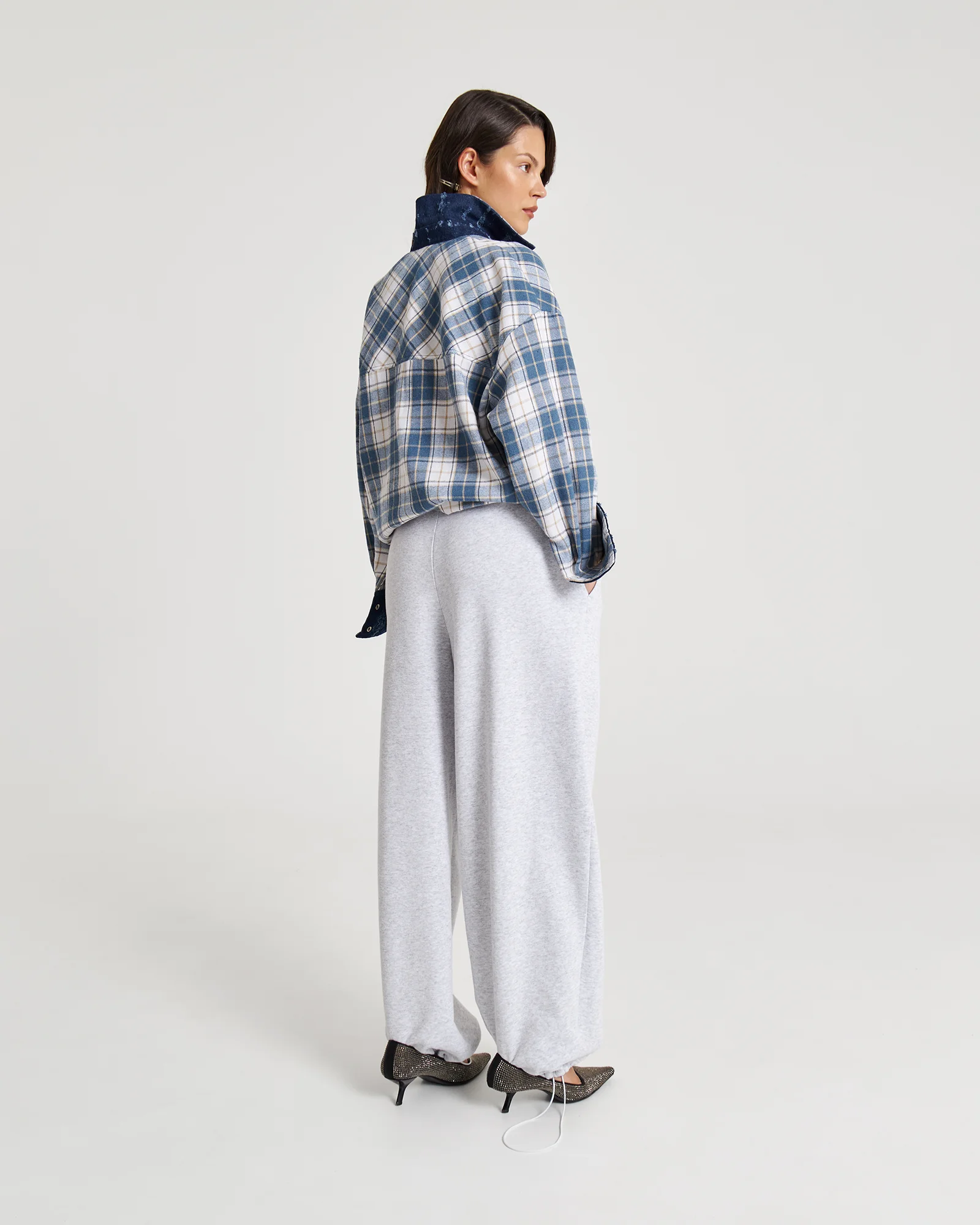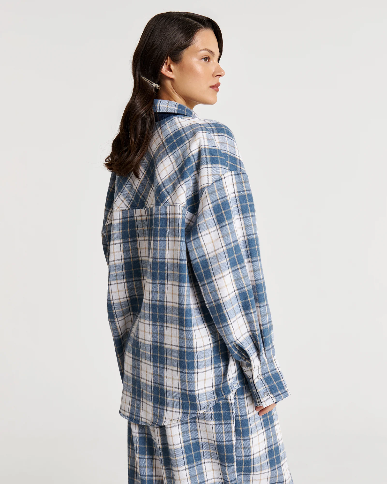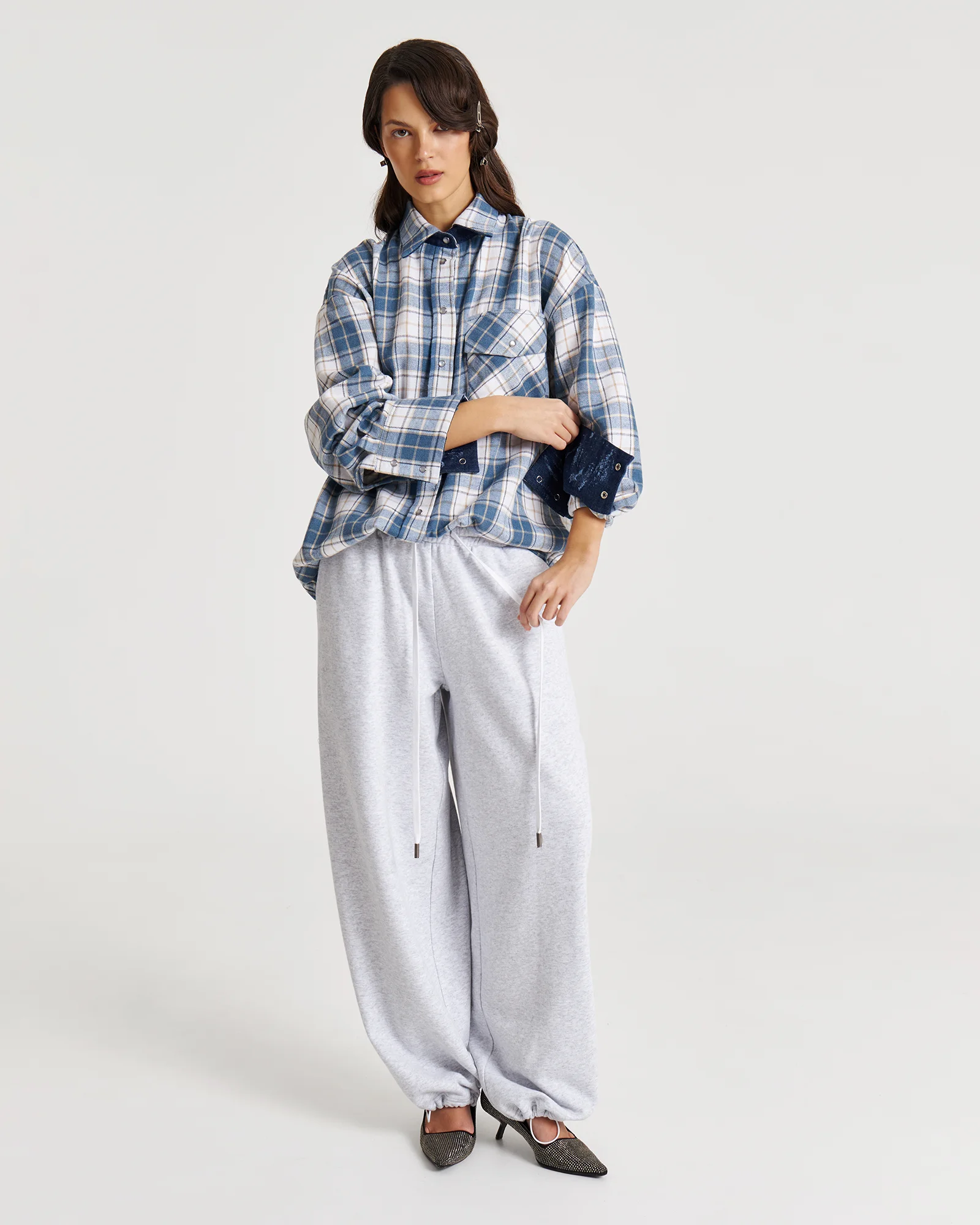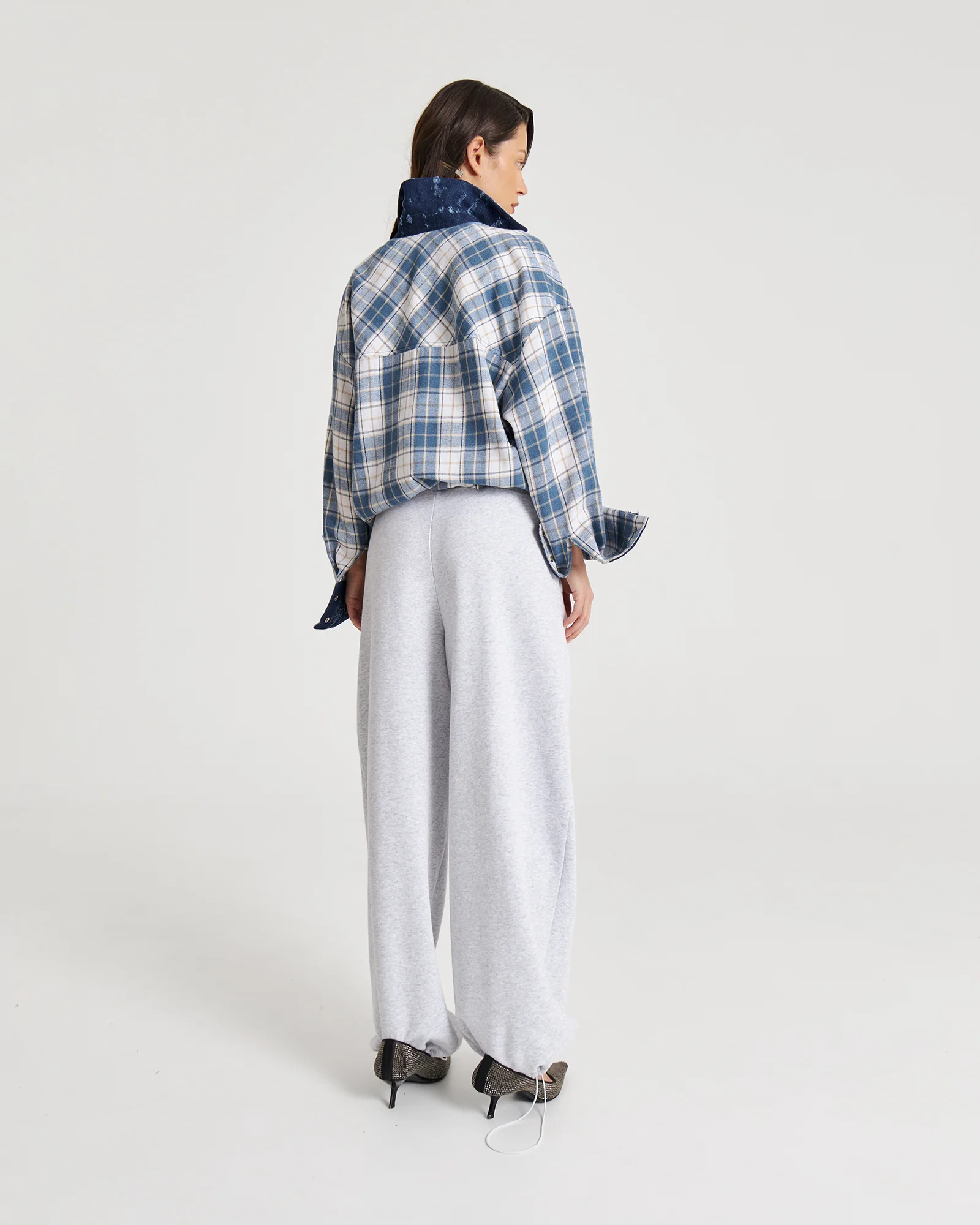 Свободная рубашка в клетку с маленькими секретами: под воротом и на манжетах скрыт винтажный деним – деталь, которую можно либо скрыть, либо эффектно показать.