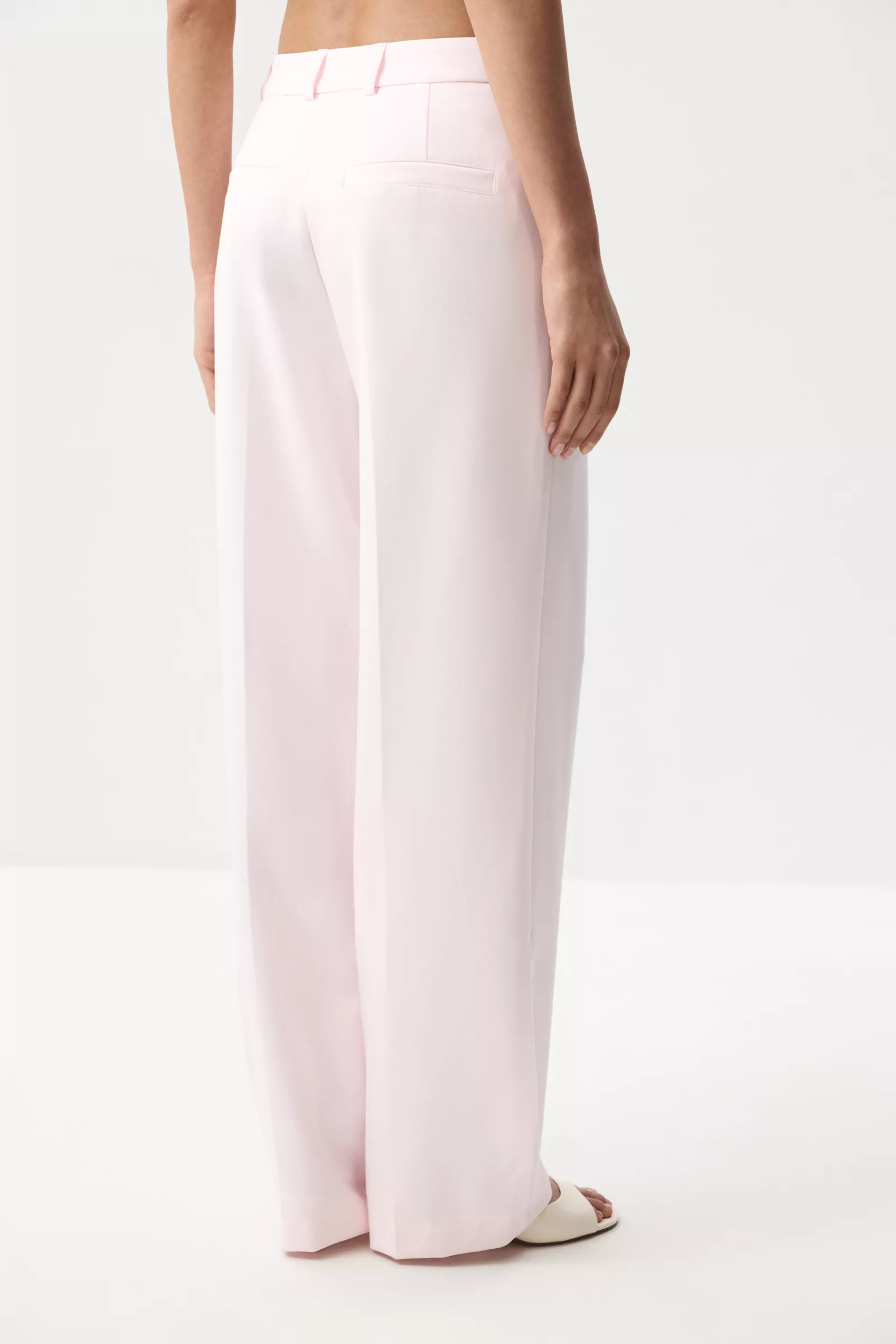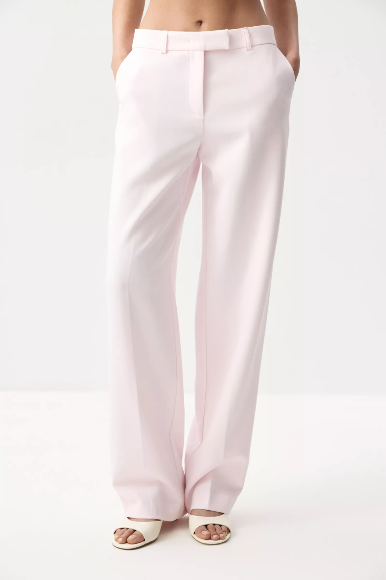 Прямые свободные брюки со стрелками из костюмной ткани. Идеальная база для стильных и продуманных образов. Модель с мягкой струящейся посадкой красиво вытягивает фигуру, создавая элегантную вертикаль за счет заутюженных стрелок. Застежка на потайную пуговицу и крючок.