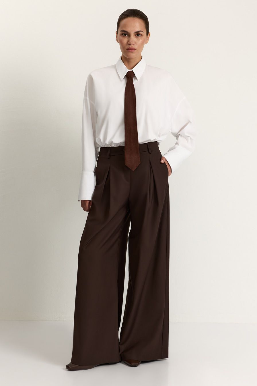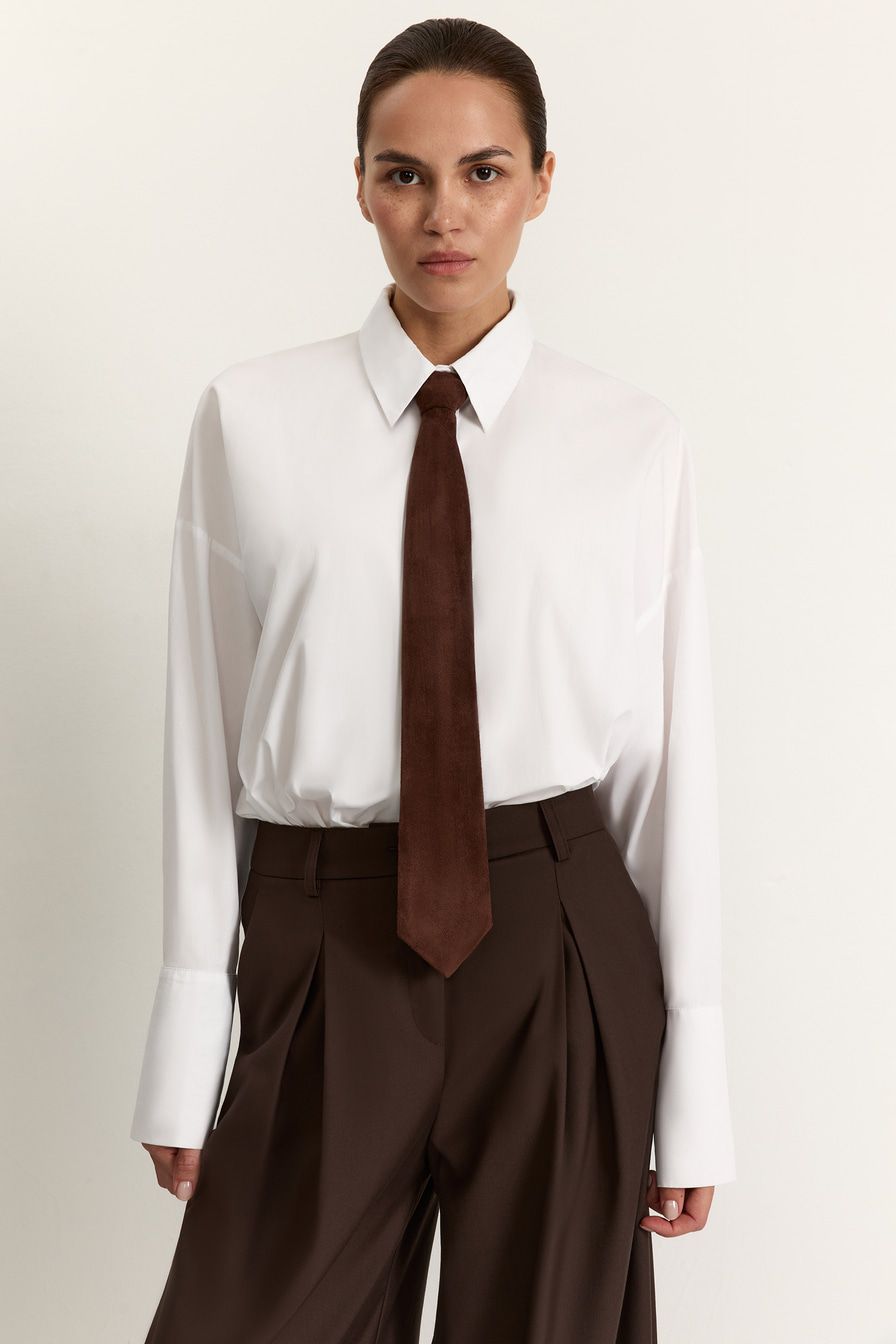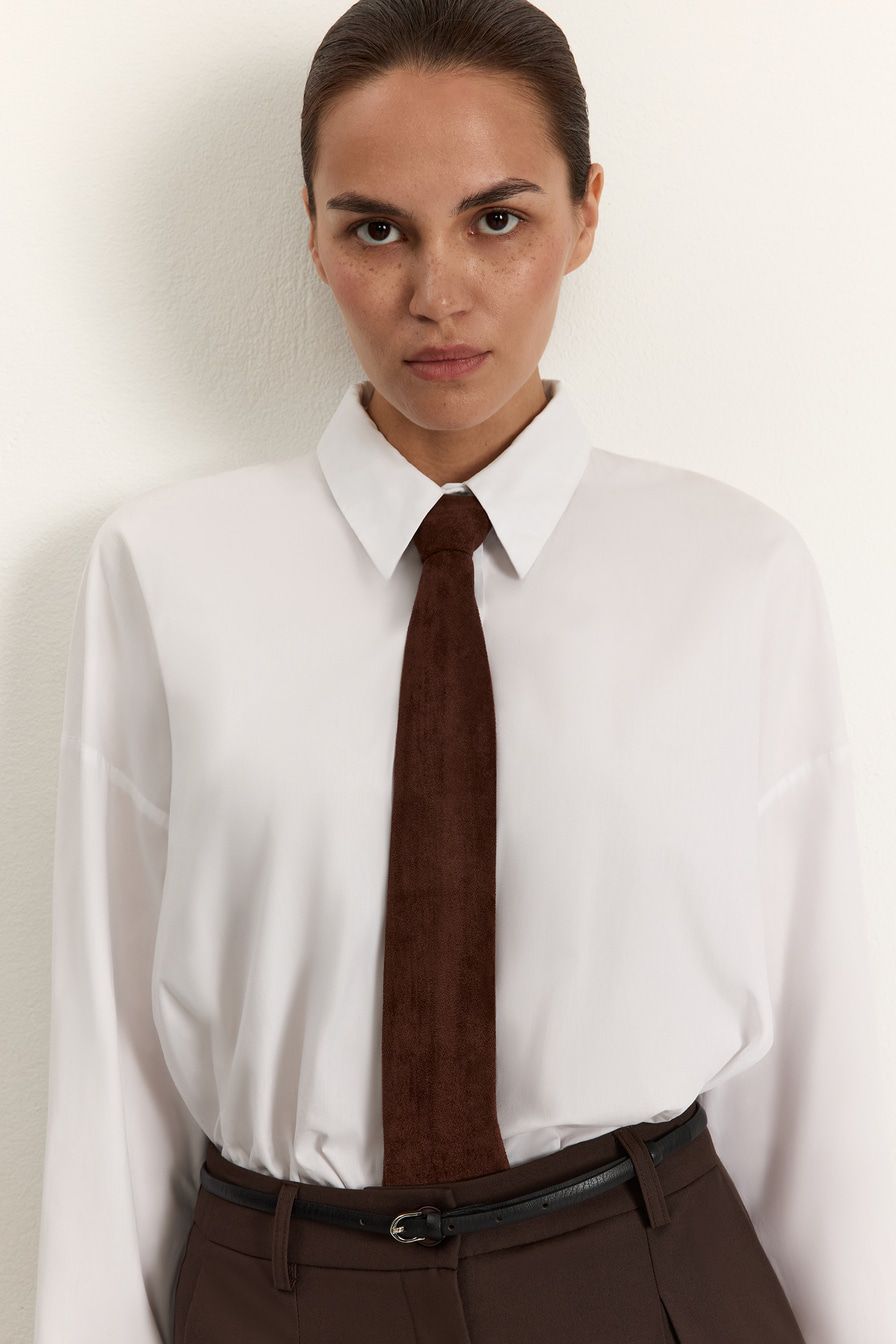 «В офис носите галстук в тандеме с белой рубашкой, коричневой юбкой замшевой фактуры и кожаными лоферами или топсайдерами».