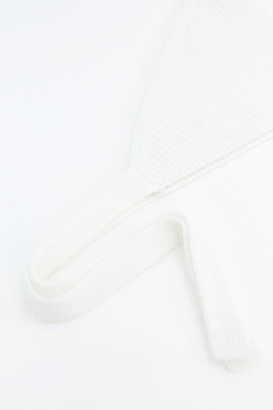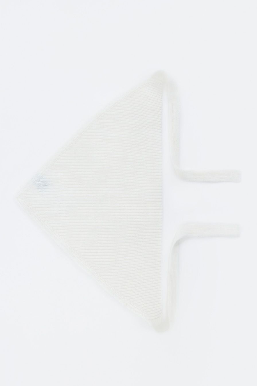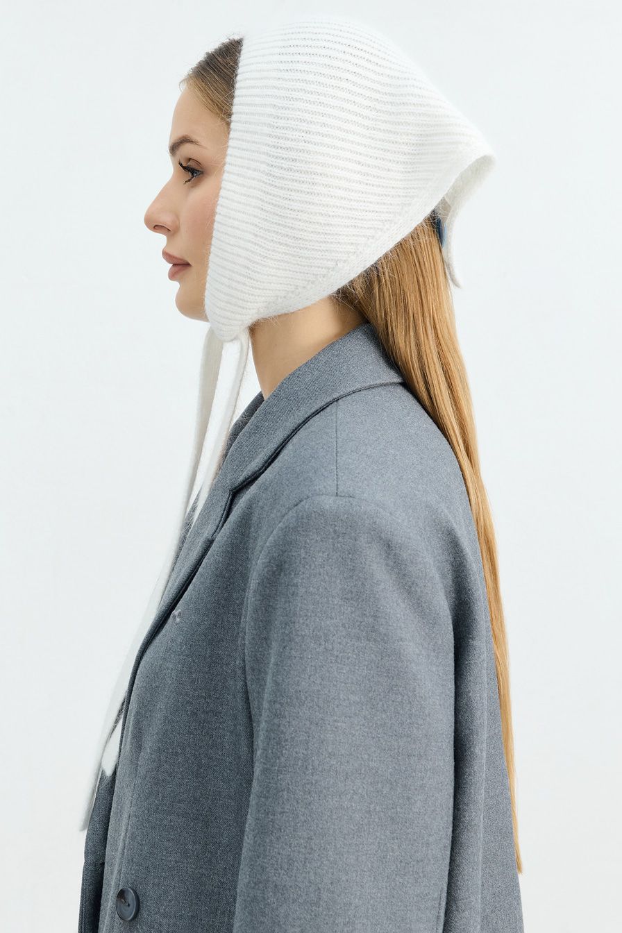 Чепчик из смесовой пряжи с добавлением вискозы и ангорской шерсти – модель молочного цвета.