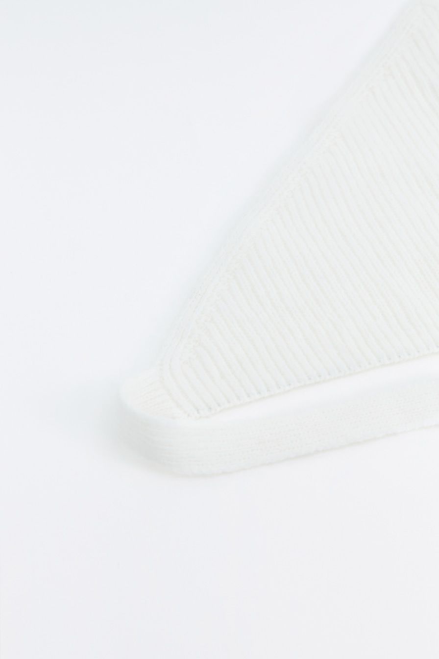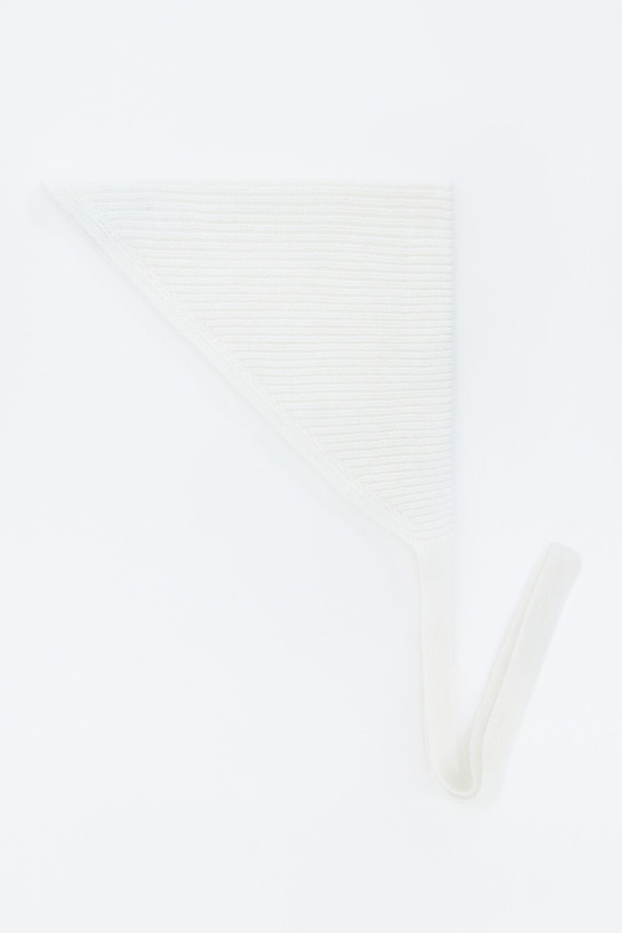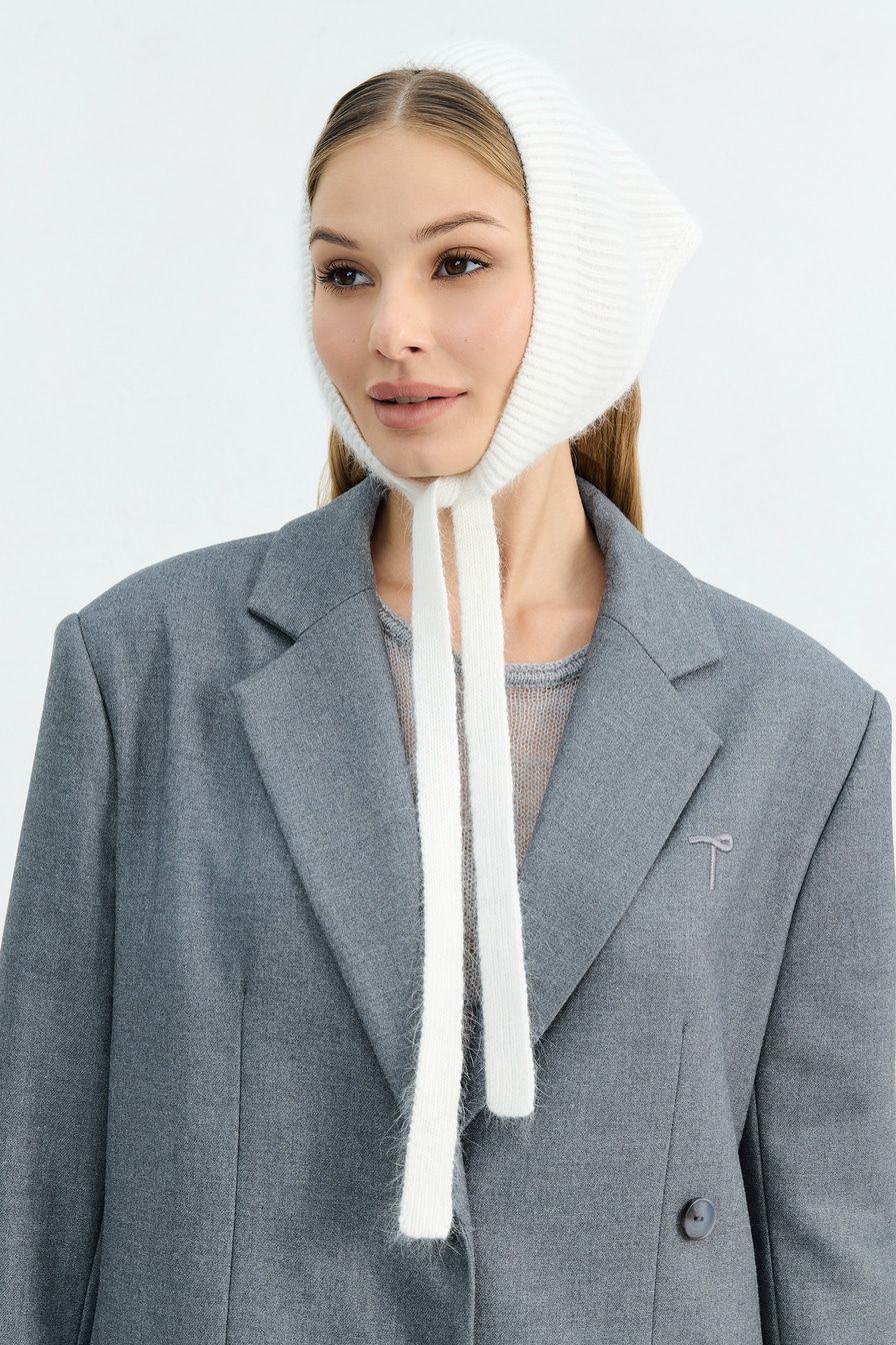 Чепчик из смесовой пряжи с добавлением вискозы и ангорской шерсти – модель молочного цвета.