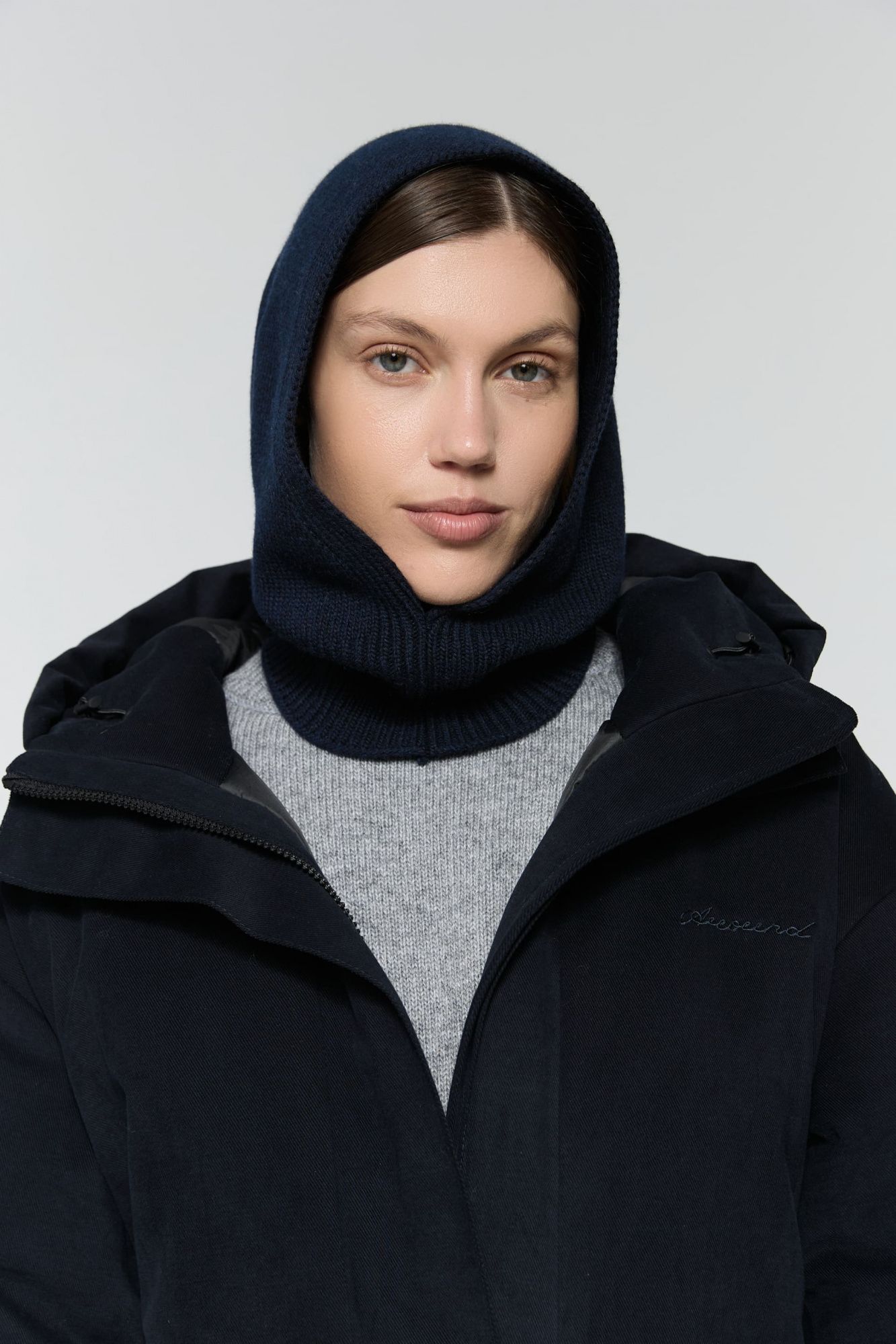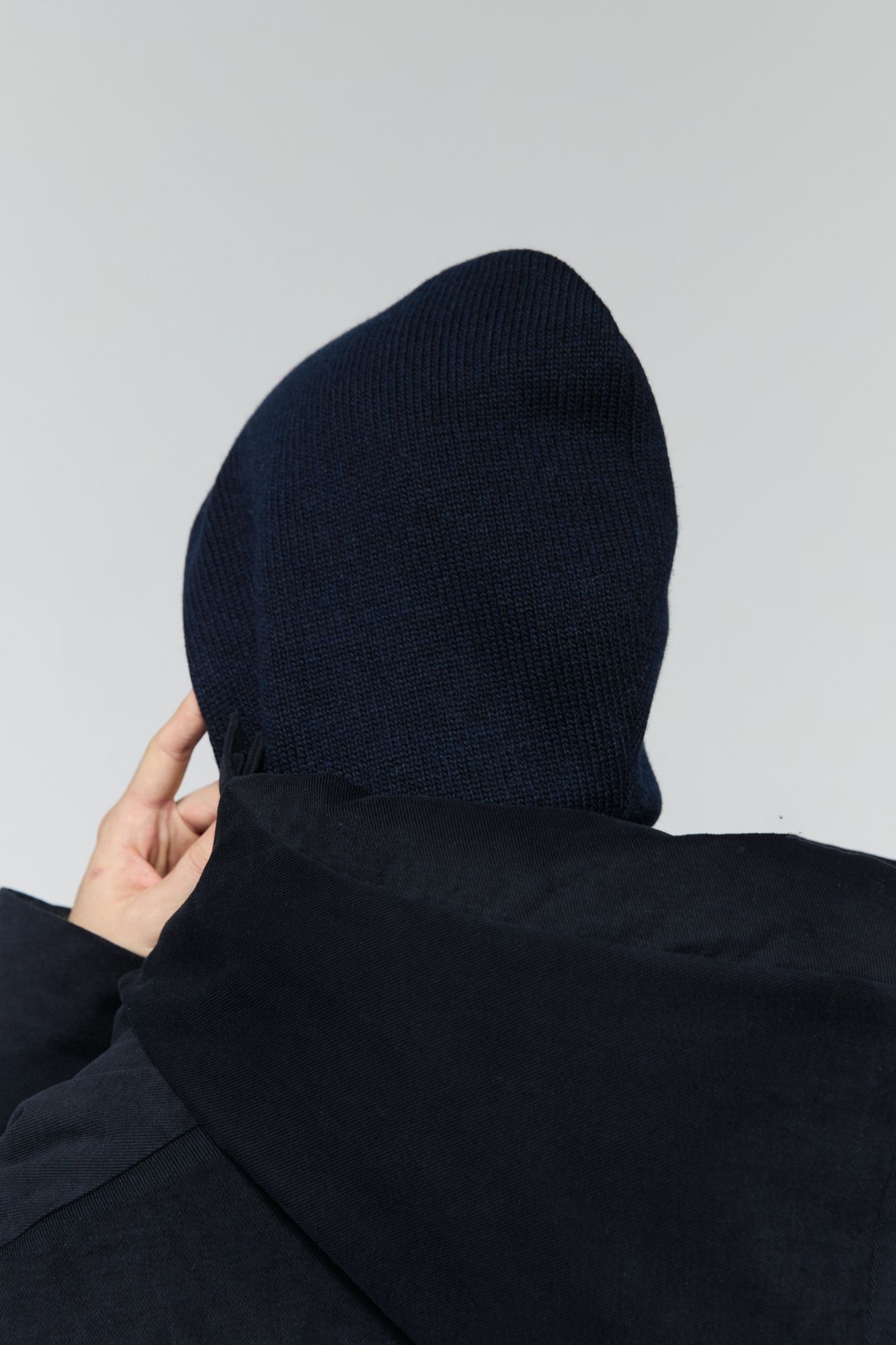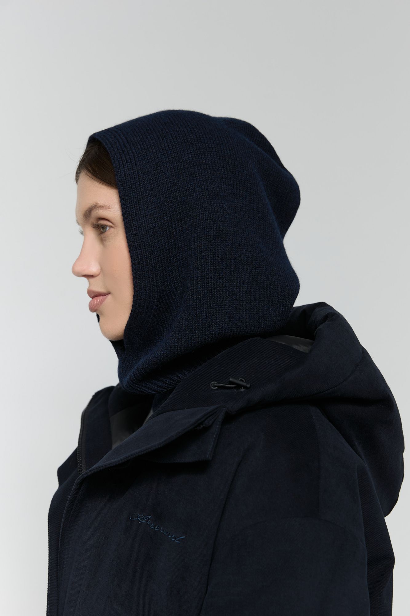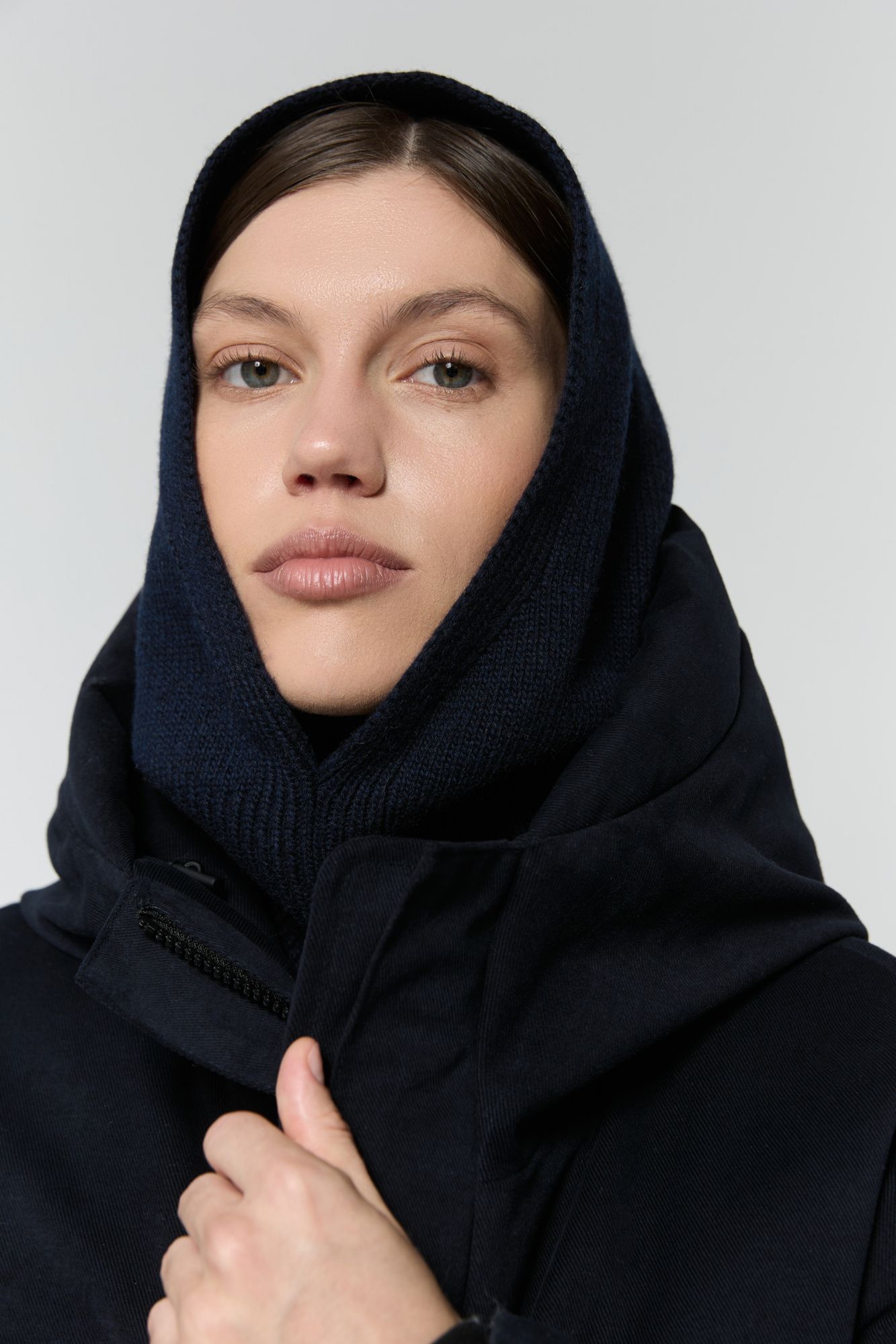 Капор связан из микса кашемира, шерсти мериноса и вискозы; нежной и комфортной к коже лица пряжи, сделанной в Италии.