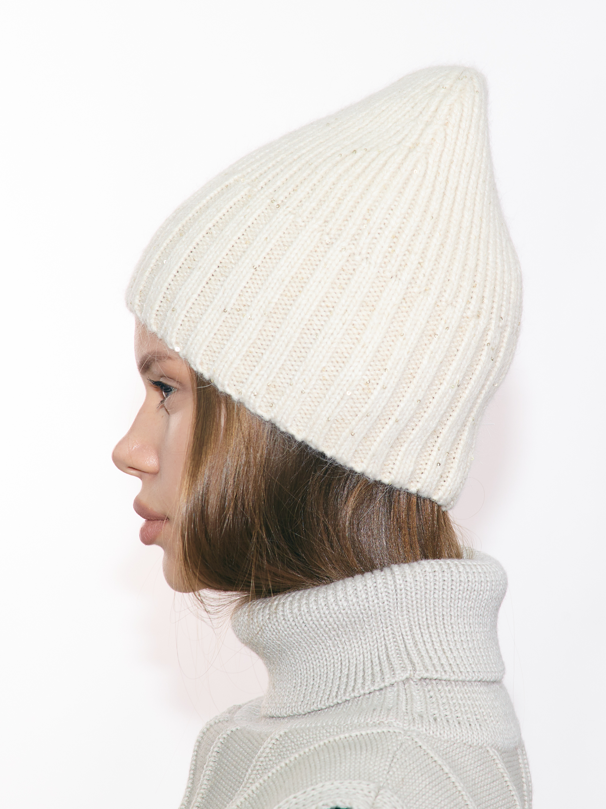 Шапка крупной и мелкой вязки с добавлением ангоры и украшением в виде пайеток станет отличным аксессуаром для зимних образов.