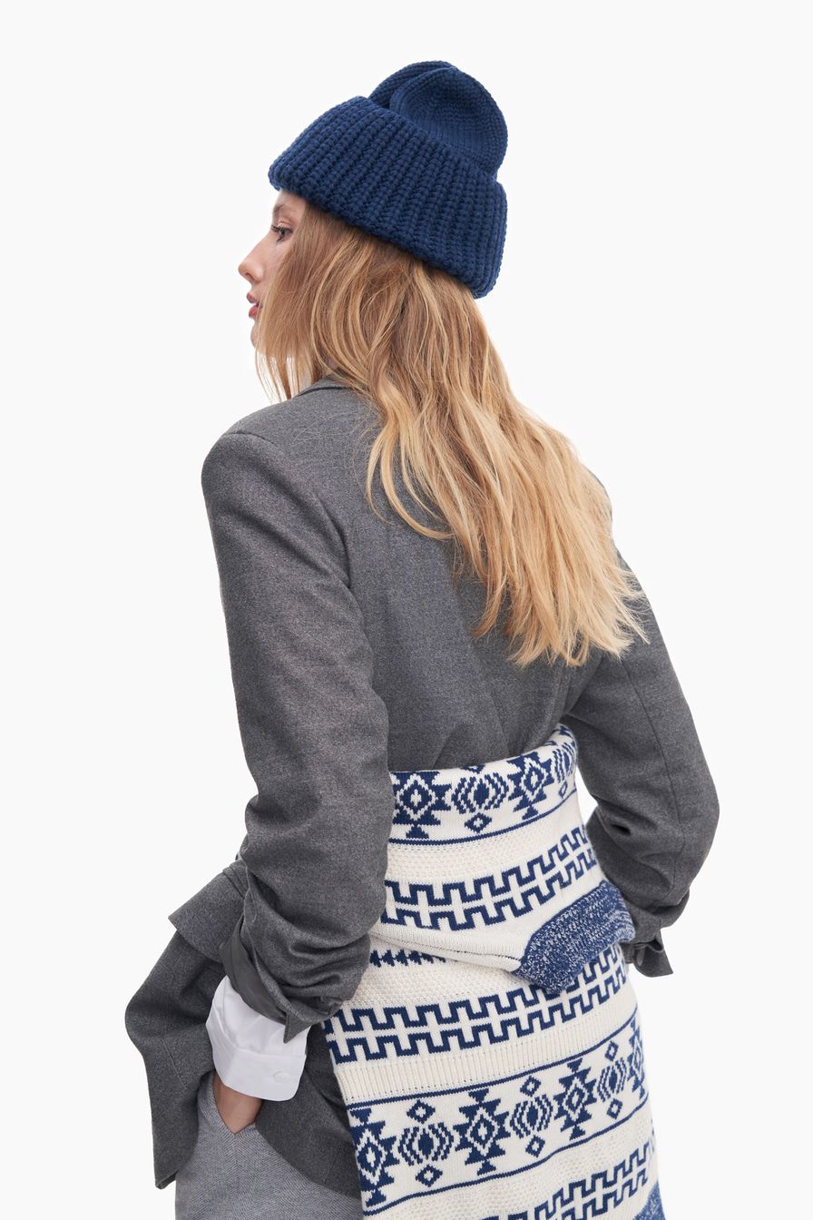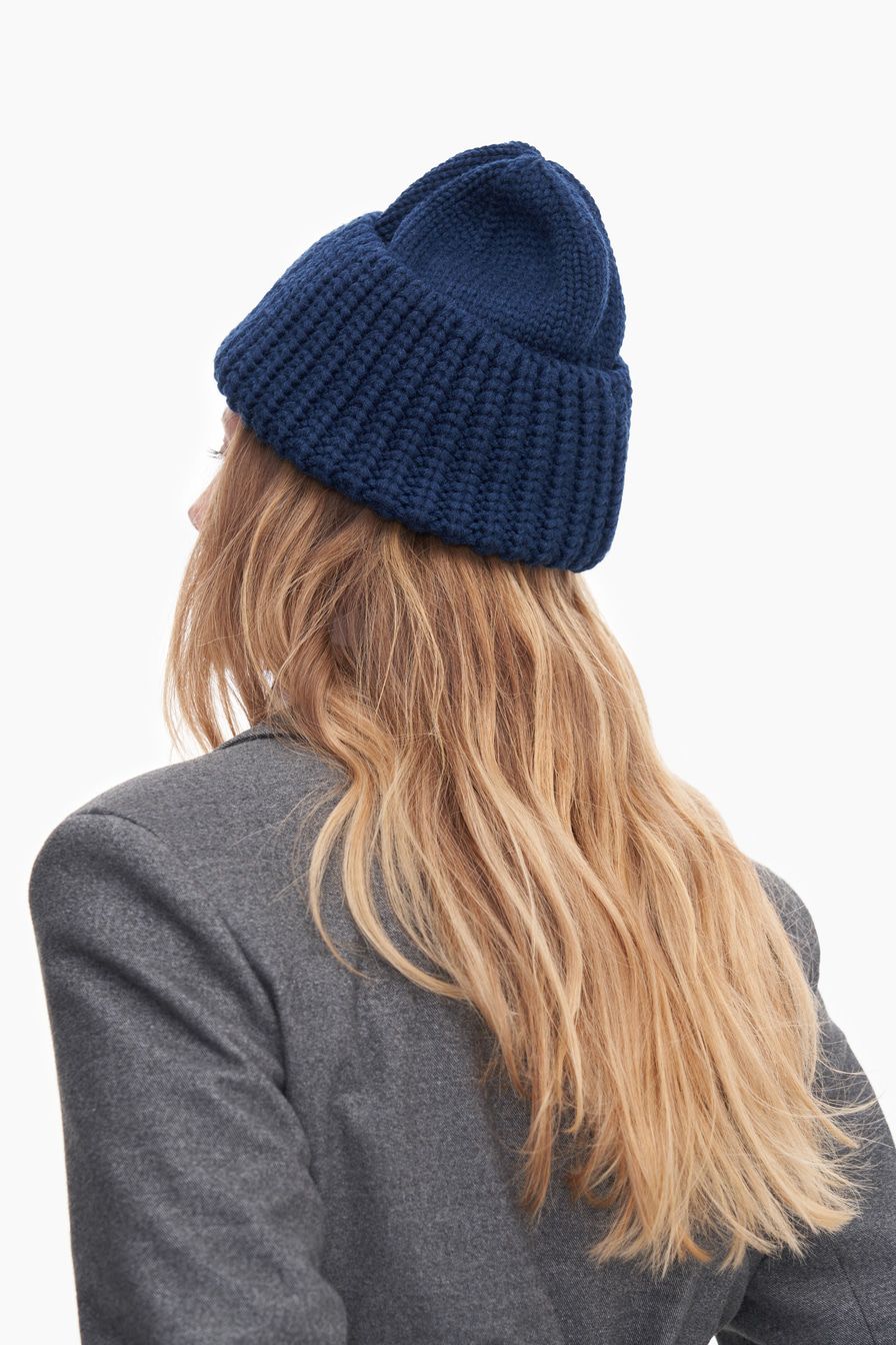 Шапка-бини из смесовой шерсти мериноса – модель темно-синего цвета. Шапка дополнена объемным отворотом в крупный рубчик.