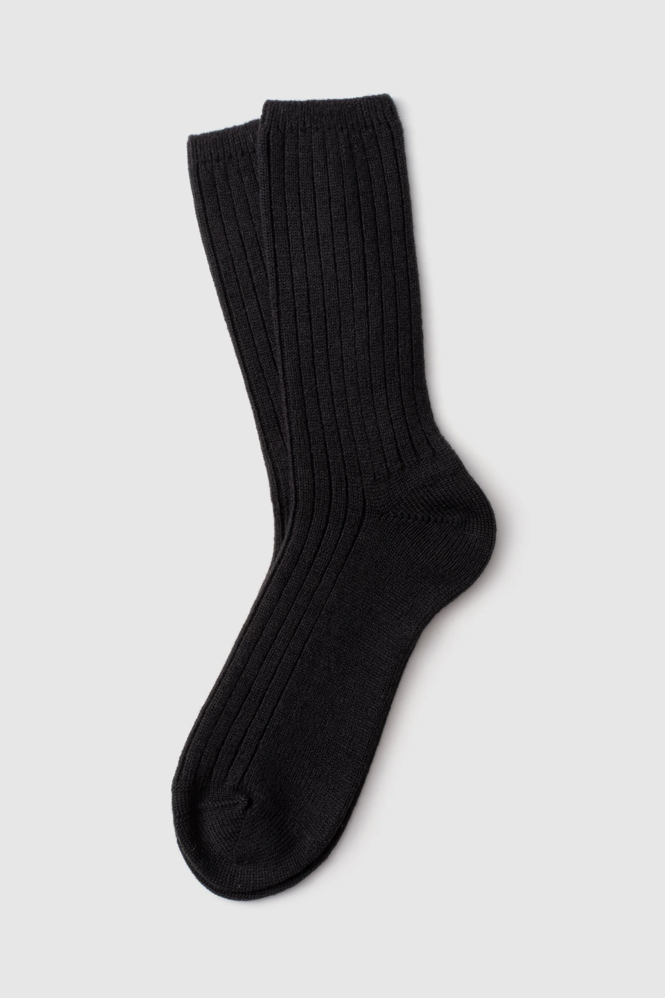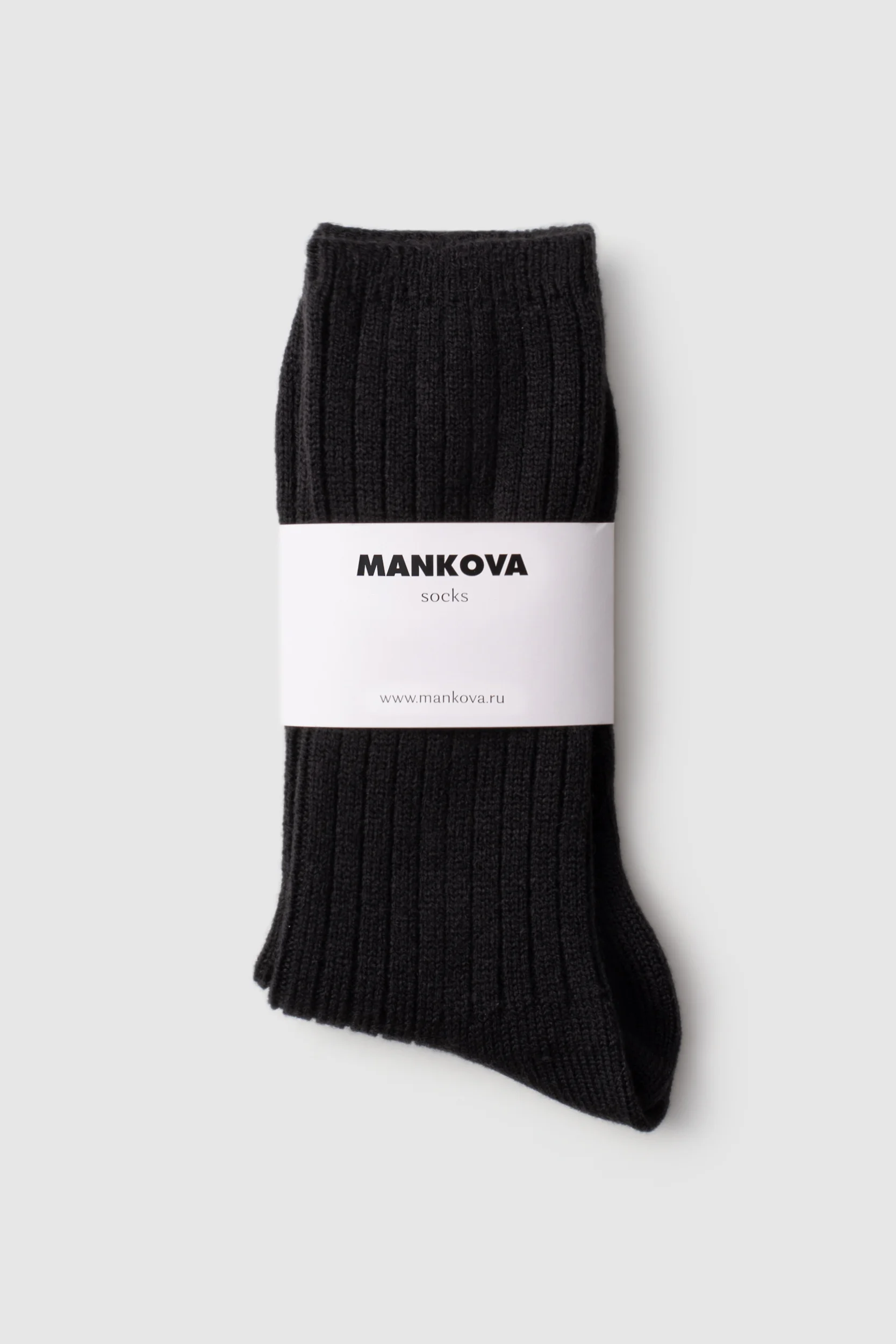 Высокие носки черного цвета в рубчик выполнены из шерсти и акрила. Модель хорошо согревает и идеально подойдет для осенне-зимнего гардероба.
