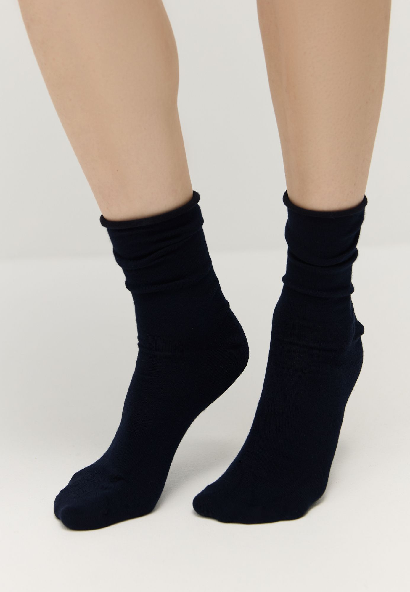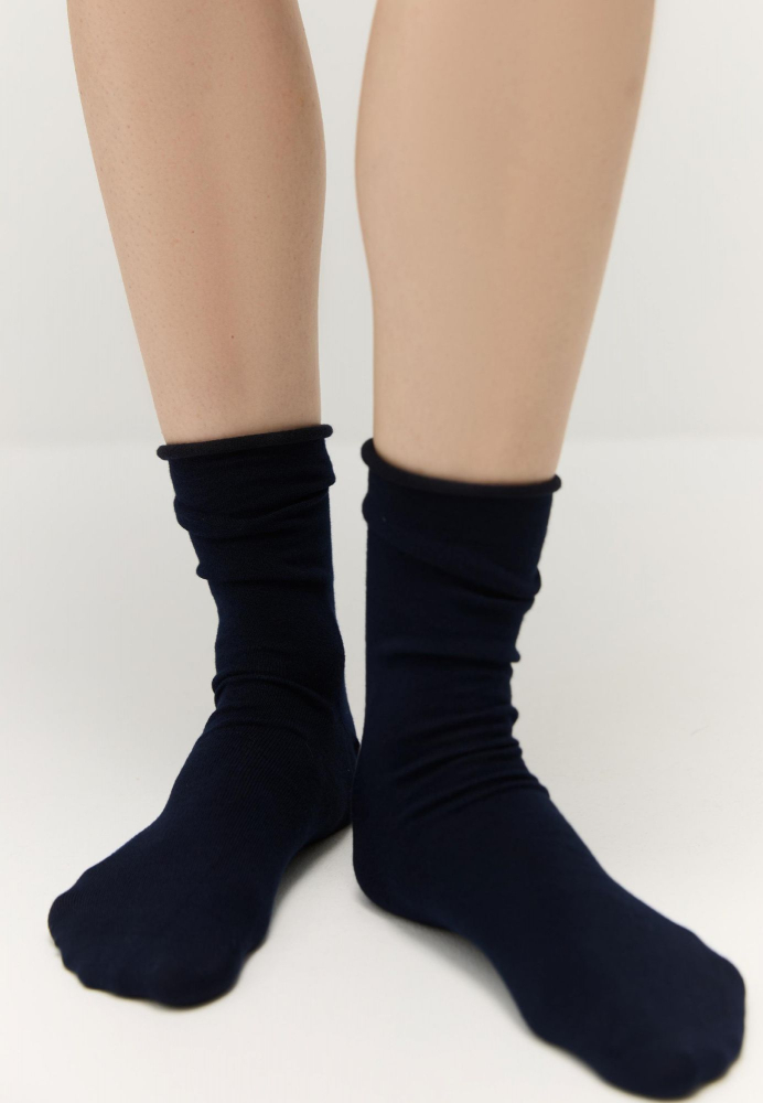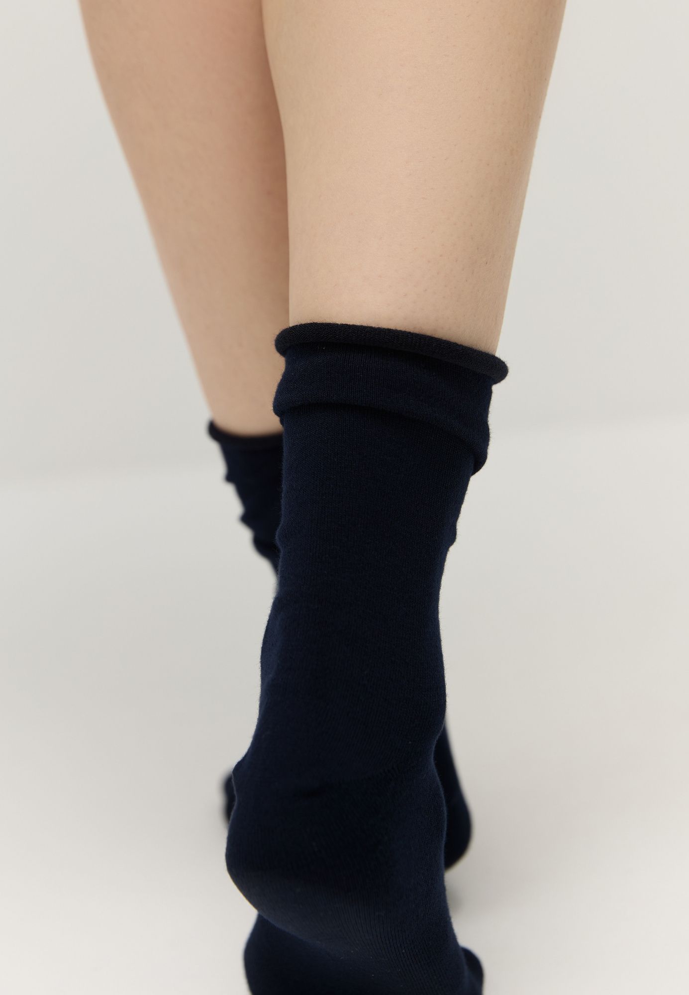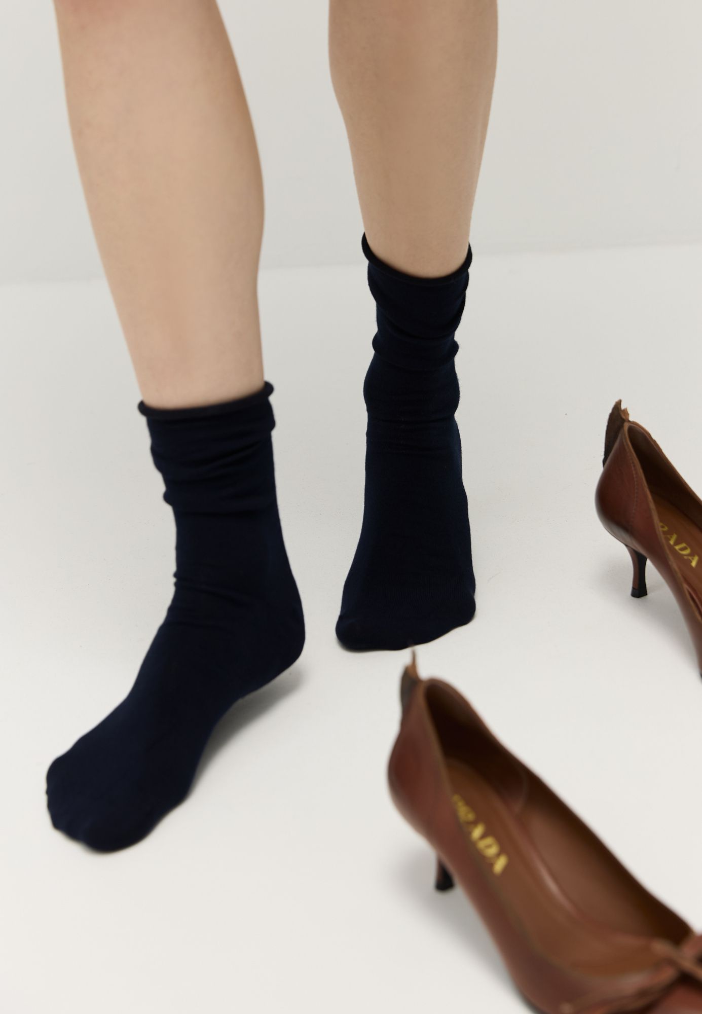 Носки средней длины гладкой вязки; выполнены из смесового хлопка с вискозой. По верху голенища край слегка закручивается наружу. Нижняя часть стопы гладкая, с вывязанными пяткой и носком.