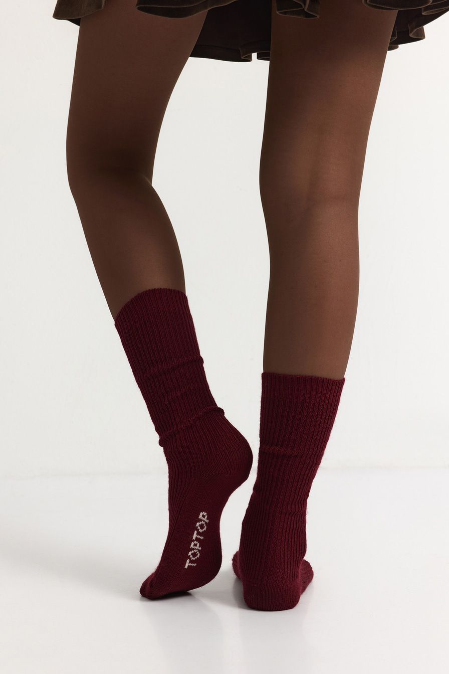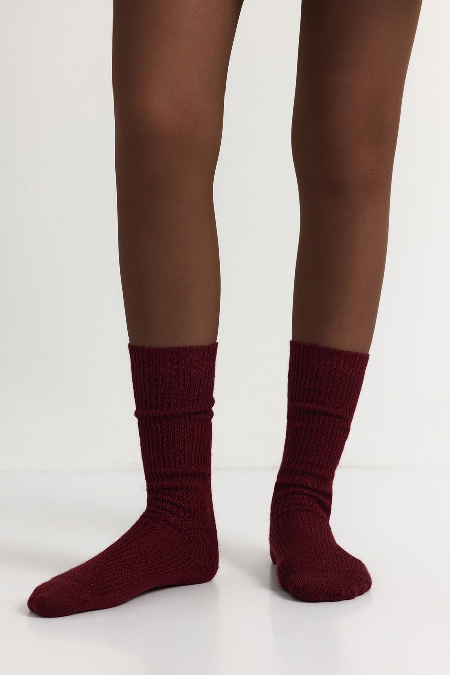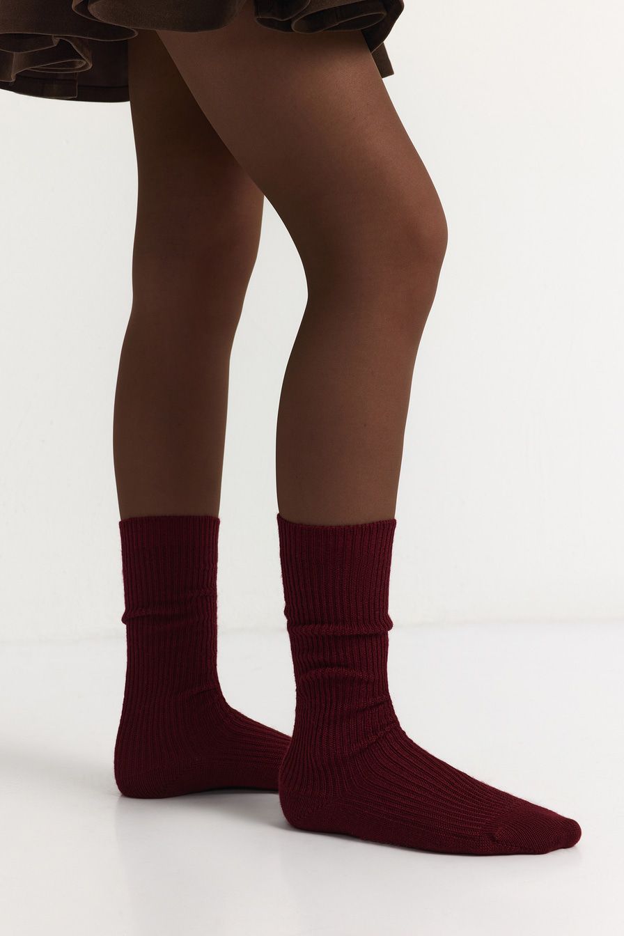 Высокие носки из смесовой шерсти в крупный рубчик – модель бордового цвета. Нижняя часть следа декорирована контрастным логотипом бренда.